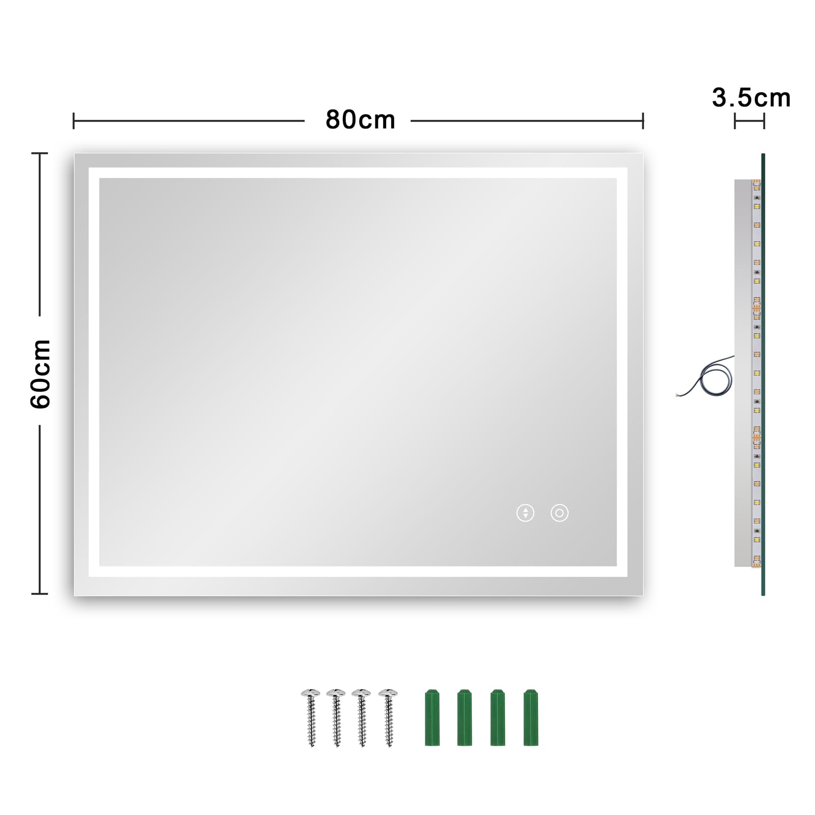 Dripex bathroom mirror with LED lighting, touch switch, dimmable, 3 adjustable light colors. Fog-free 60 x 80 cm illuminated bathroom mirror.