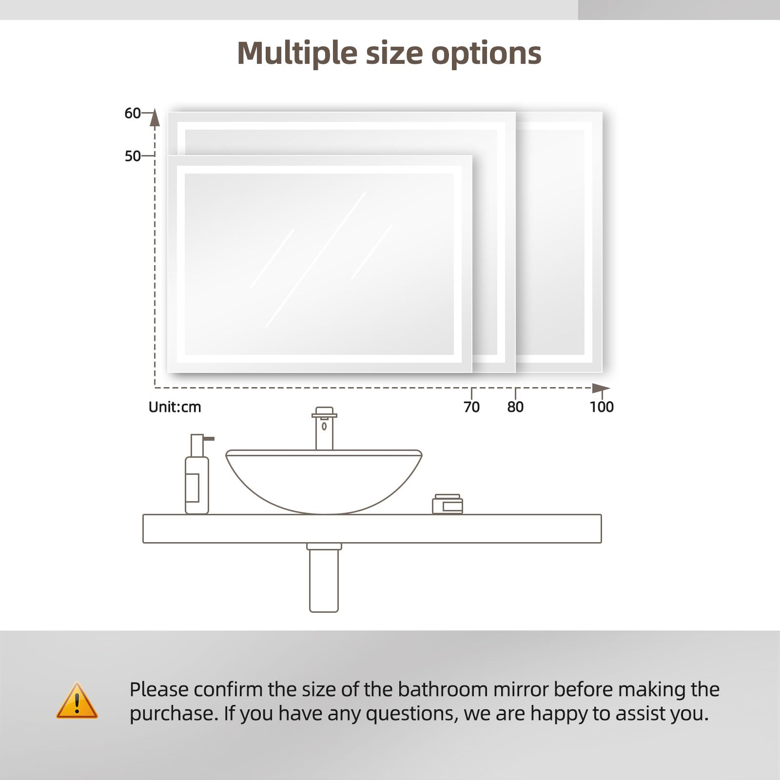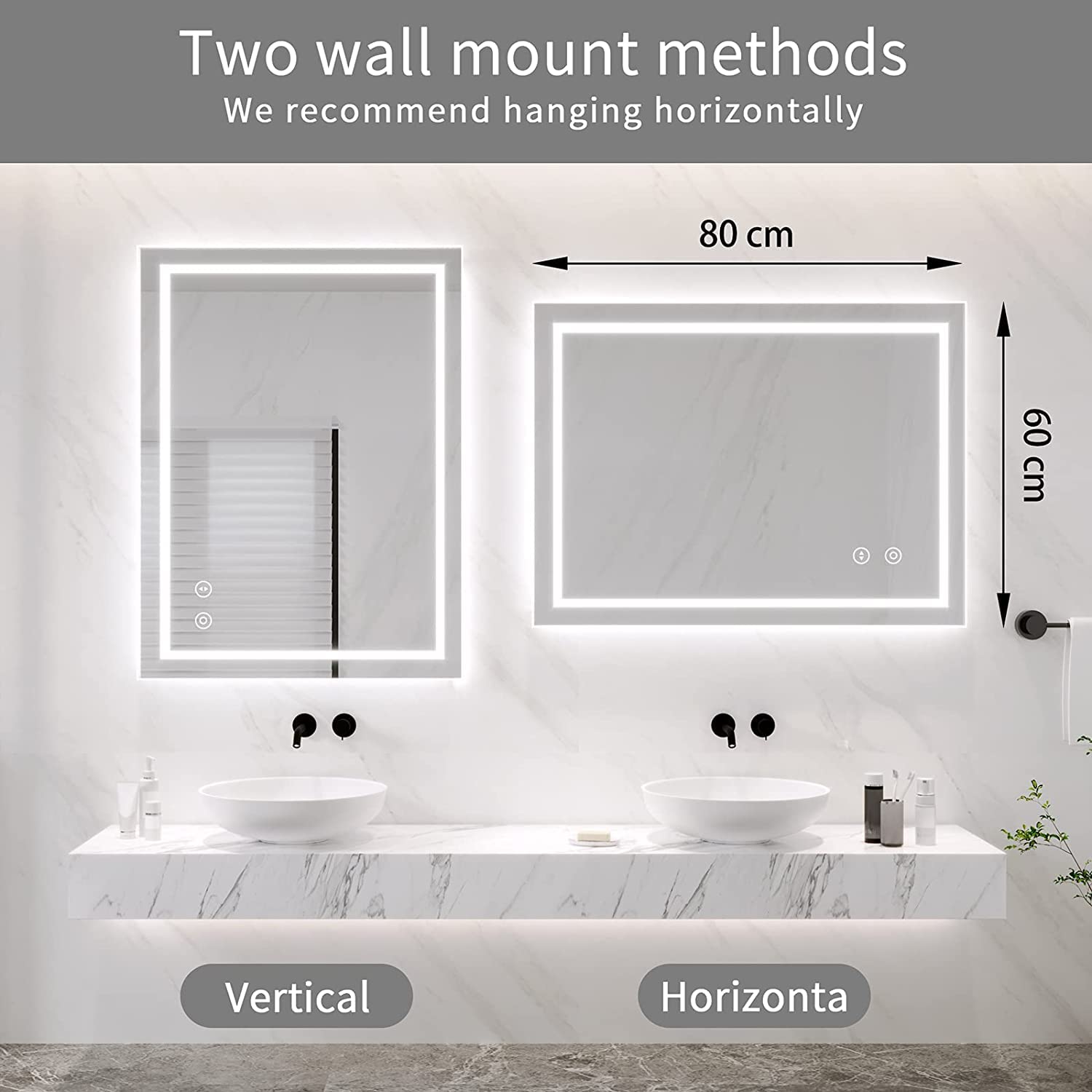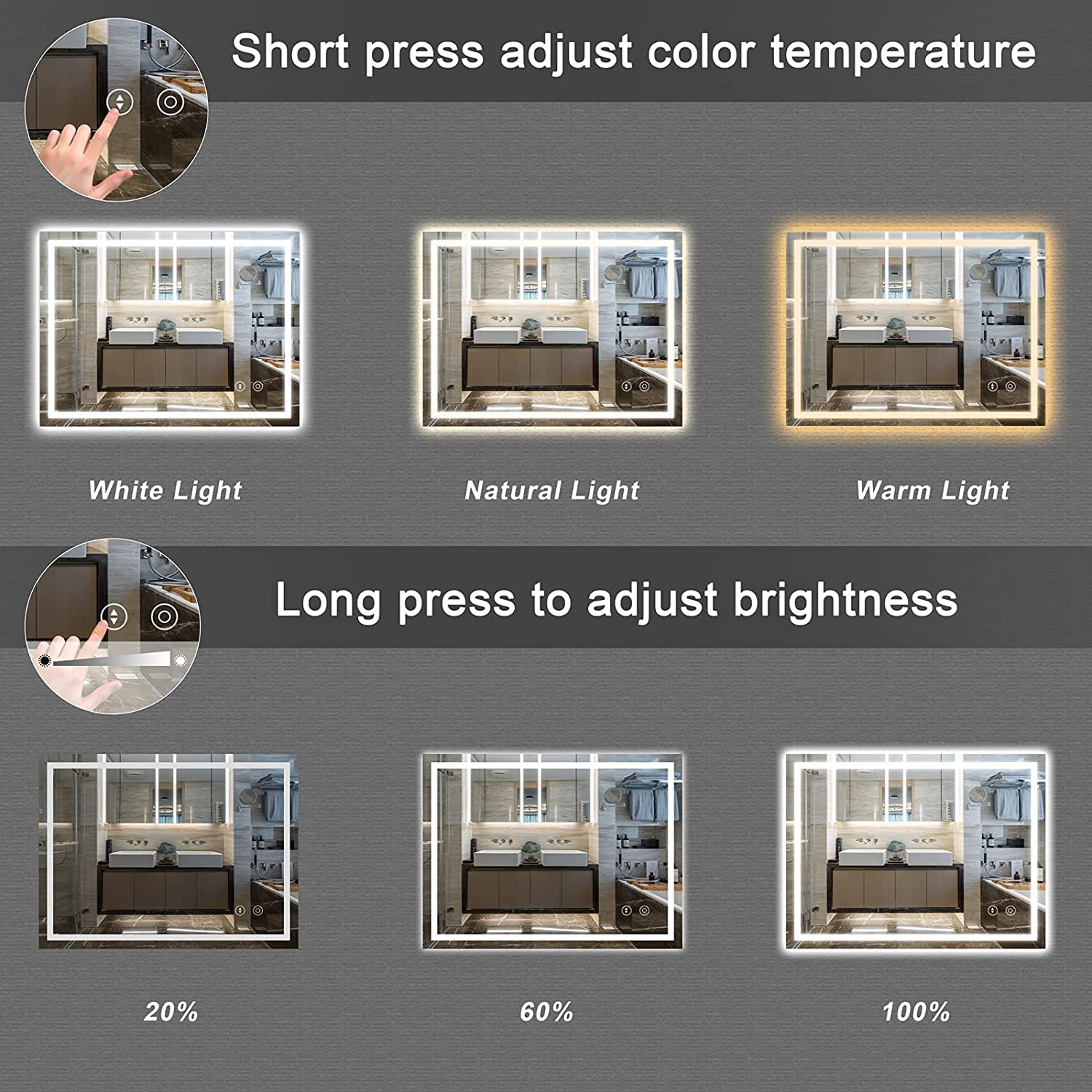 ["VERTICAL/ HORIZONTAL INSTALLATION. The Dripex bathroom mirror can be hung in 2 directions, 24 x 32 inches or 32 x 24 inches. This bathroom mirror can be quickly mounted on the wall. The necessary mounting accessories and the German installation instructions are included.","3 COLOR & DIMMABLE UPGRADE. It is dimmable in 3 color temperatures (2700K-warm white, 5000K-neutral white, 6500K-cool white). You can adjust your desired light color by Short Pressing the button. It is 10%-100% dimmable, you can choose the appropriate brightness by Long Pressing the button.","ANTI-FOG FUNCTION (MIRROR HEATING). The heat is evenly distributed over the mirror surface, preventing your bathroom mirror from fogging up. The heating is turned on and off with the mirror lighting.","ENERGY SAVING. Wall mirror with modern and energy-saving LED technology, with a lifespan of at least 3 years, offering natural lighting with low power consumption.","SAFETY AND WARRANTY. 4mm reinforced glass with explosion-proof film, safe for your family. Each mirror is packaged in a high-quality reinforced cardboard box, ensuring safe delivery in good condition. If you have any questions, feel free to contact us.","Note: When the illuminated mirror is connected to the power grid, the touch button will light up blue continuously."]