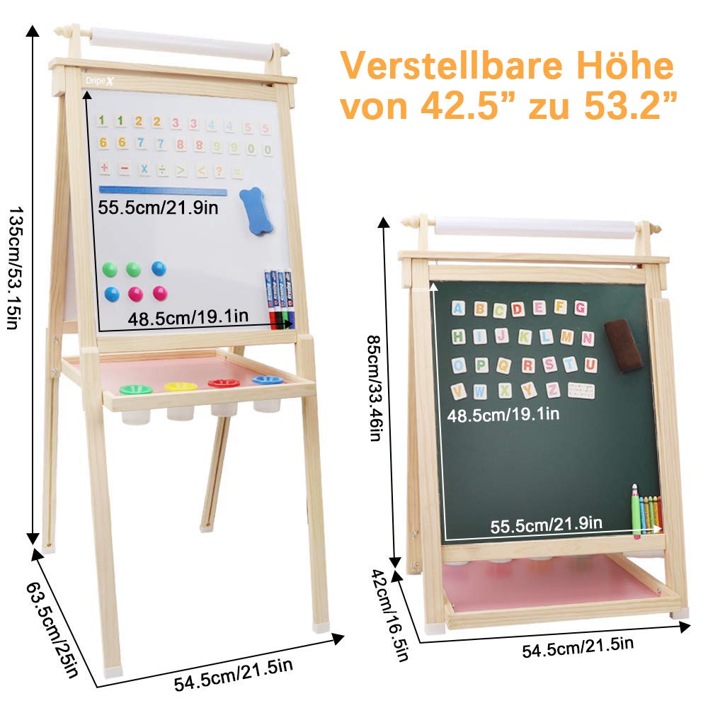 ["🎨Double-sided Design - The kids board is double-sided. A white magnetic board on one side and a writing board on the other side. Two children can use it simultaneously.","🎨Dimensions - Kids board is 48.5x55.5cm. It has an adjustable height ranging from 85 to 135cm. Double-sided kids board comes with a wide range of drawing accessories and a scroll to help children with designing and learning.","🎨Environmentally Friendly Materials - The stand board is made from natural pine. The wooden frame is polished and there are no sharp edges. Safe and non-toxic. Bring your child closer to nature.","🎨Easy to Organize - Wooden drawing board is easy to fold and unfold. You can easily store it and place it in the corner of the room.","🖌️Multifunctional Writing Board - For writing, drawing, and playing, for learning letters, numbers, and calculations."]