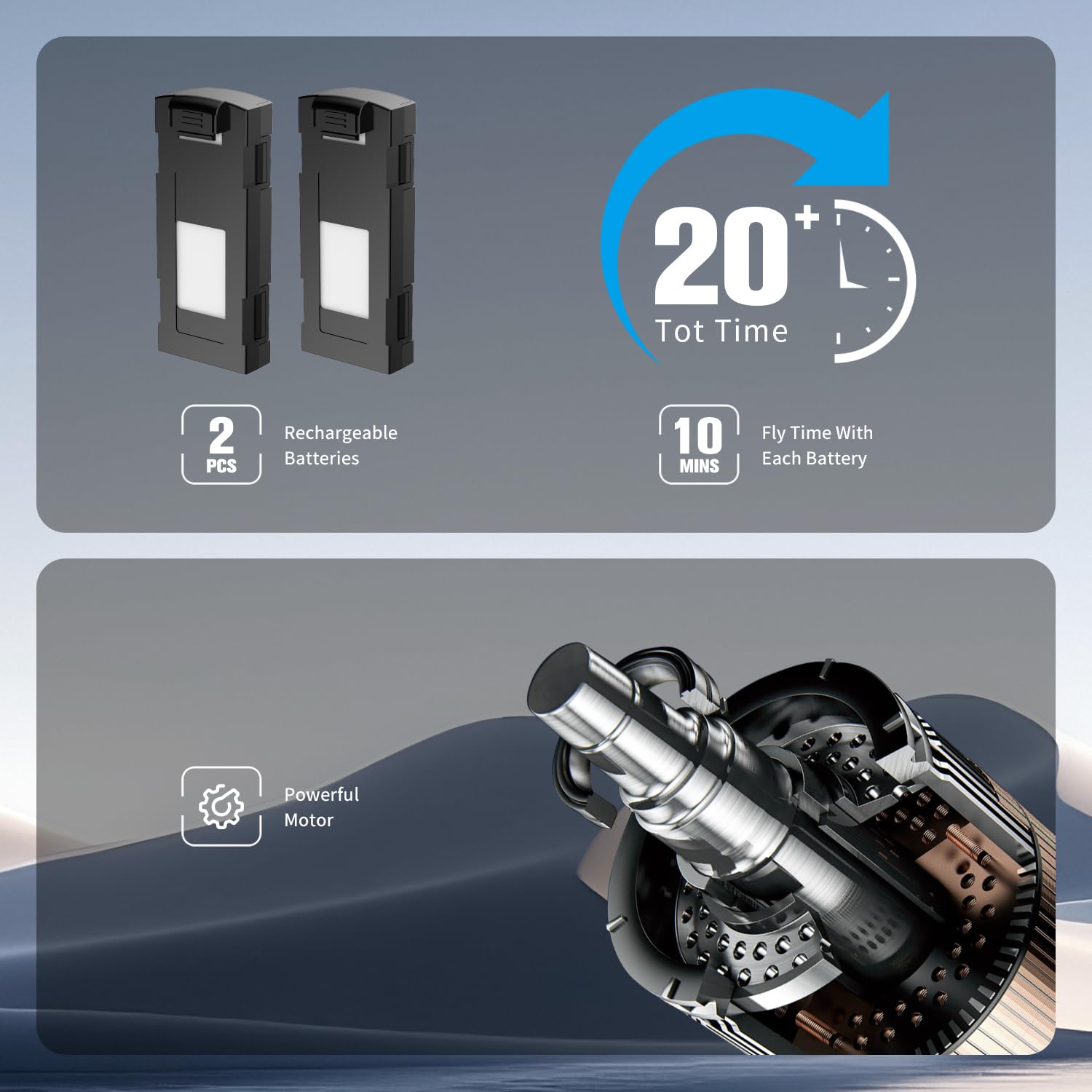 ["1080P FPV Drone & Wi-Fi Real-Time Transmission】With the APP control and Wi-Fi real-time transmission function, you will dive into the world of high-definition imaging with our modern 1080P HD FPV drones with camera. Enjoy a vivid, detailed perspective through the 120° wide-angle lens, ideal for capturing family celebrations or scenic beach landscapes.","Multifunctional Drone】Drone with 1080P camera offers user-friendly design and multi-functions, 3 speeds, headless mode, one key start/landing, optical flow positioning function make the drone easier to control. 360° flips, trajectory flight, gravity control, and other functions bring endless flight fun. From simple controls to intelligent flight modes, this camera drone is ideal for anyone looking to explore the world of drone flight.","Brushless Motor, High Stability, Optical Flow Positioning】Compared to brushed models, brushless remote-controlled drone provides a longer lifespan and lower power consumption. The propeller blades can reach higher speeds, and a built-in altitude hold system ensures stable hovering at desired altitudes. Improved wind resistance is achieved through optical flow ground detection.","Easiest Operation】Mini drone is easy to operate. Simply tap the One Key Start/Landing button to start flying. In case of emergency, an "Emergency Stop" maneuver is possible. The auto altitude hold, headless mode is also well suited for beginners.","Longer Flight Time】Equipped with 2 batteries, the aircraft time can reach up to 35-40 minutes, providing exciting flight experiences for amateurs and advanced pilots. Additionally, the modular battery is much easier to change and much safer to charge.","Ideal Gifts for Boys and Men】Our drone is a foldable design, weighing less than 250 grams, making this quadcopter drone small, it can be carried in pockets or backpacks. And comes with a convenient carrying case, which you can easily take to have fun with your family when you go outdoors. It is the ideal gift for birthdays, Christmas, Father's Day, or other days. It is loved by children, men, teenagers, boys, husbands, and friends. It is definitely a perfect gift for friends and family.","Worry-Free Customer Service】In the package, you will find a comprehensive, clear, and easily understandable user manual. If you have any questions or problems, please contact us. We guarantee to solve your problem within 24 hours, to ensure that our customers are 100% satisfied with our customer service. A one-year warranty and permanent support guarantee ensure that you can buy with confidence."]
