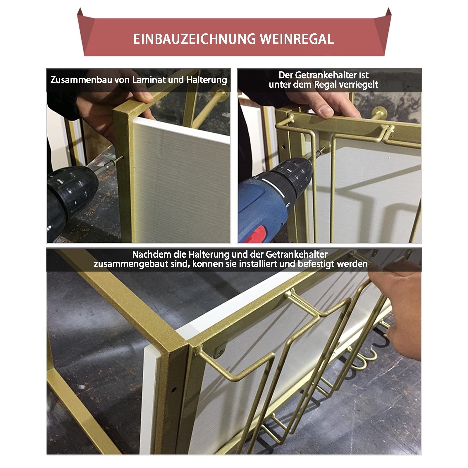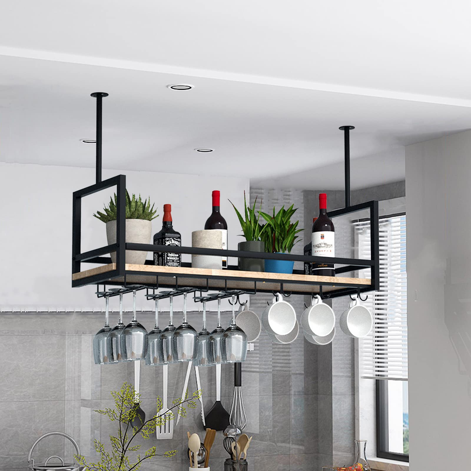["【Two-in-One High-Performance Wine Rack】Our ceiling wine glass rack has a multifunctional design. The 31.5 inch - 39.4 inch - 47.2 inch - 55.1 inch long shelf can be used for storing wine bottles, flower pots, decorations, etc., while the lower hanger is ideal for hanging wine glasses upside down","【User-Friendly Design】Eyeglass frame design, convenient storage, easier to take out inverted wine glasses, items securely placed, is a high-quality, cost-effective hanging shelf","【Durable Construction】Our wine glass rack is made of iron and solid wood to ensure that it is sturdy for use. The lower hanger has a high adaptability, able to hang various types of glasses with wine glasses, Bordeaux glasses, champagne flutes, etc., with a diameter larger than the base. In addition, the ceiling-mounted design is convenient for you to place and take bottles and glasses in both directions and saves space","【Easy Installation】The simplified structure allows you to easily assemble this wine glass rack, saving you a lot of time and energy. You just need to attach the entire rack to the ceiling rods through the pre-drilled holes at the top. After that, our hanging shelf is ready to place your wine bottles and glasses","【Versatile Use】Our ceiling rack is not only suitable for storing wines and bottles at home, but is also widely used in commercial settings such as bars, cafes, hotels, restaurants, commercial cellars, and various high-end clubs. With this shelf, you can enjoy a good wine taste anytime"]