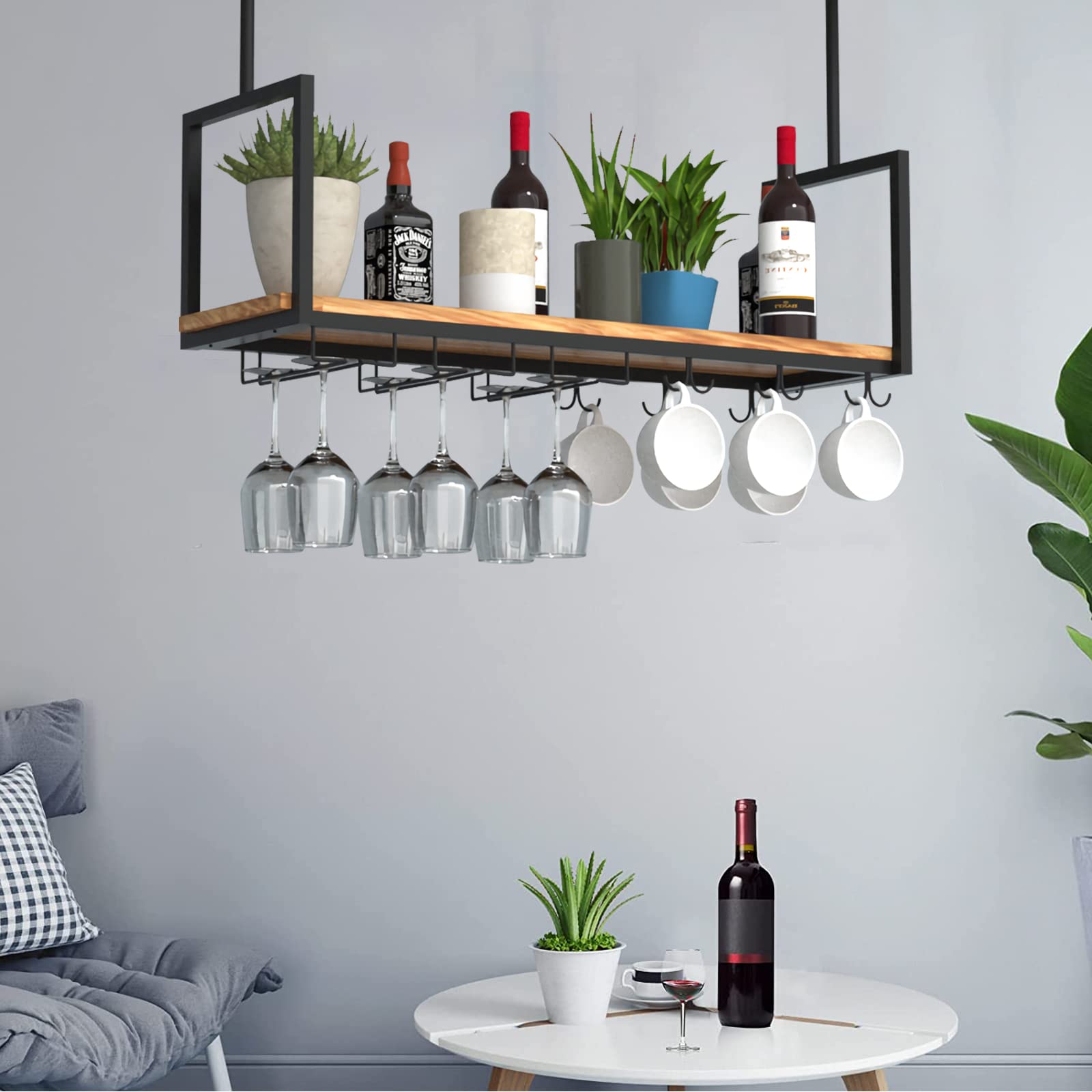 ["【Two-in-One High Performance Wine Rack】 Our ceiling wine glass rack features a multifunctional design. The 31.5 inches - 39.4 inches - 47.2 inches long shelf can be used for storing wine bottles, flower pots, decorations, etc., while the bottom hanger is perfect for hanging wine glasses upside down for easy access, securely placing items, a high-quality, cost-effective hanging shelf.","【User-friendly Design】 Glasses frame-shaped design, convenient storage, easier to take out inverted wine glasses, items securely placed, is a durable, cost-effective hanging shelf.","【Durable Construction】 Our wine glass rack is made of iron and solid wood to ensure that it is sturdy for use. The bottom hanger has high adaptability, hanging various types of glasses with more than the base diameter, such as wine glasses, Bordeaux glasses, champagne glasses, etc. In addition, the ceiling-mounted design is convenient for you to place and retrieve bottles and glasses in both directions, saving space.","【Easy Installation】 The simplified structure allows you to effortlessly assemble this wine glass rack, saving you a lot of time and energy. You just need to attach the entire rack to the bars on the ceiling through the pre-drilled holes at the top. After that, our hanging shelf is ready to place your wine bottles and glasses.","【Versatile Use】 Our ceiling shelf is not only suitable for storing wines and bottles at home, but is also widely used in commercial settings such as bars, cafes, hotels, restaurants, commercial cellars, and various high-end clubs. With this shelf, you can enjoy a good wine taste anytime."]