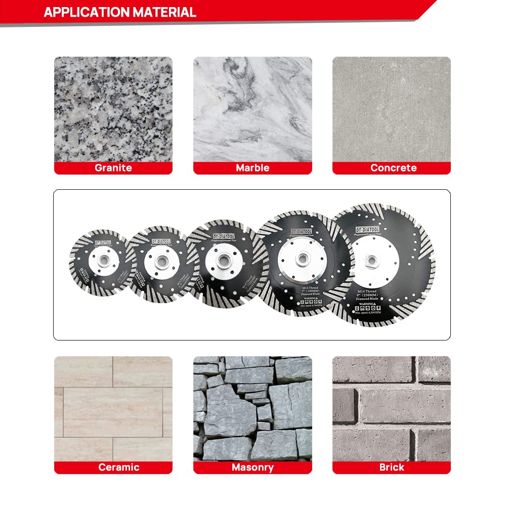 ["Quantity: 2 pieces; Diameter: 4.5\"/115mm; Diamond height: 8mm; Segment thickness: 0.09-0.094\"; Connection: M14 thread", "Dry or Wet Cutting of Concrete, Bricks, Tiles, Granite, Marble, Masonry, and Building materials", "Multipurpose; Can be used for cutting and grinding; Efficient for deep cutting", "Wet cutting contributes to increased cutting performance", "Hot-pressed sintered blades ensure long life"]