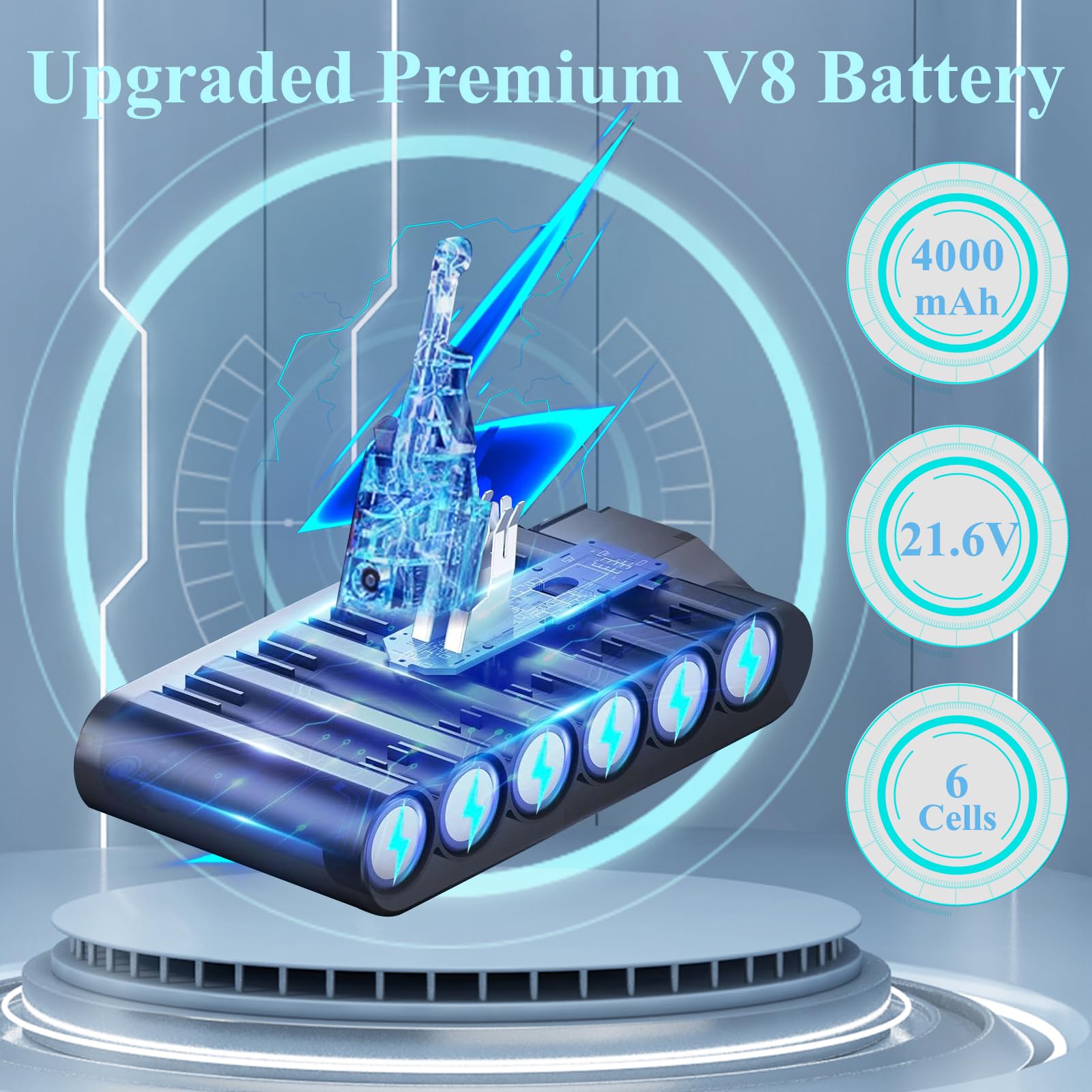 ["Battery Specs: Battery Type: Li-Ion; Voltage: 21.6V; Capacity: 4000mAh. Vacuum Cleaner Battery Replacement Accessory Replacement Batteries for Vacuum Cleaner Parts","Extensive Compatibility & Seamless Fit: Compatible with Dyson V8 SV10, Absolute, Absolute+, Animal, Animal+, Animal pro+, Animal plus, Animal extra, Fluffy, Motorhead, Slim Fluffy, Total Clean, Car+ Boat, Extra, Trigger, Trigger+","Smart Charger Protection: Smart, safe, efficient, no memory effect. DTK V8 battery is made with premium lithium battery cells that meet FCC, RoHS, CE, PSE safety test standards. Multiple built-in microchips (overcharge, short circuit, high temperature, and overcurrent protection) and a fireproof construction.","Well Designed: Anti-oxidation coating ABS shell, beautiful, wear-resistant, drop-resistant. High-quality battery cells, safe, stable. LED charging & working indicator, everything is easier.","Easy to Install & Works Well: Installation was very easy and took about 2 minutes to replace. Premium lithium battery cells provide super power for improved pick-up performance. High-capacity replacement for your V8 machine to work longer."]