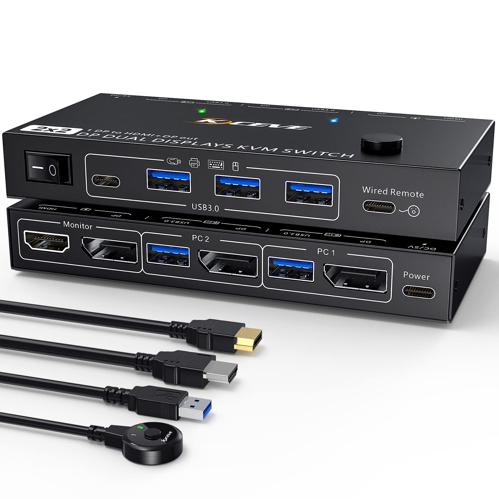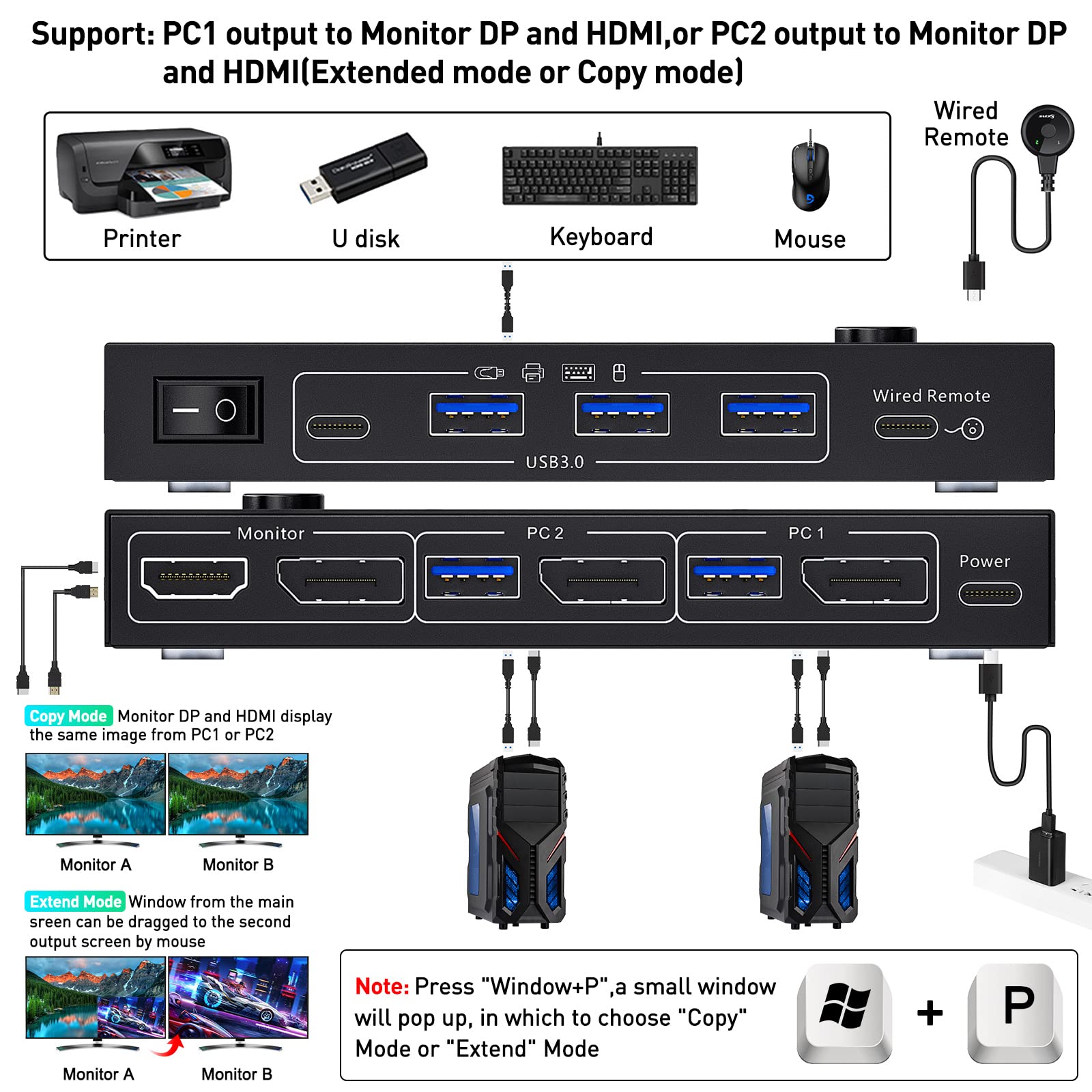 Dual Monitor DP KVM Switch, MST 2 In 2 Out DisplayPort USB3.0 KVM Switch Supports Extend and Mirror Modes, HDMI and DP monitor output for 2 computers, share 2 monitors.
