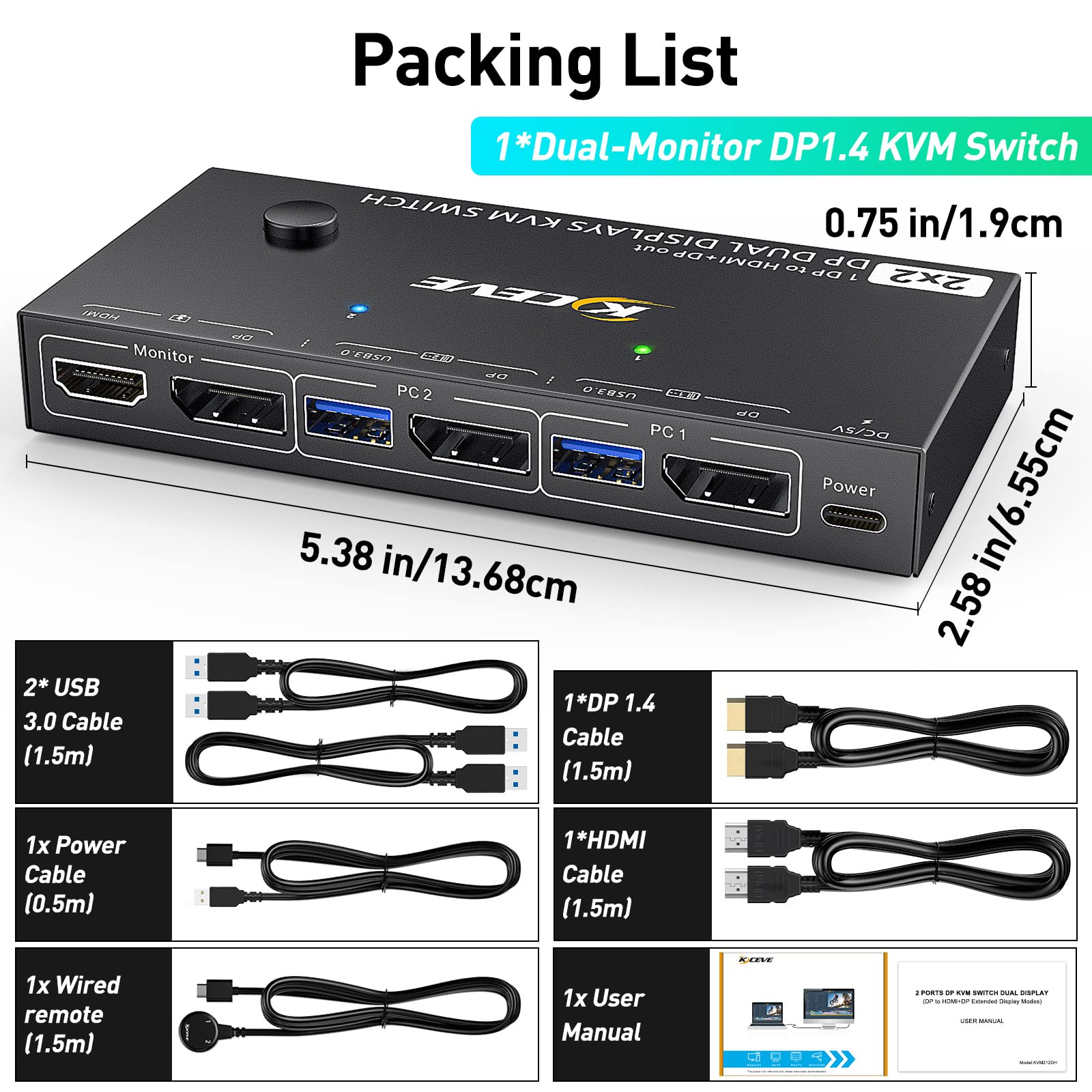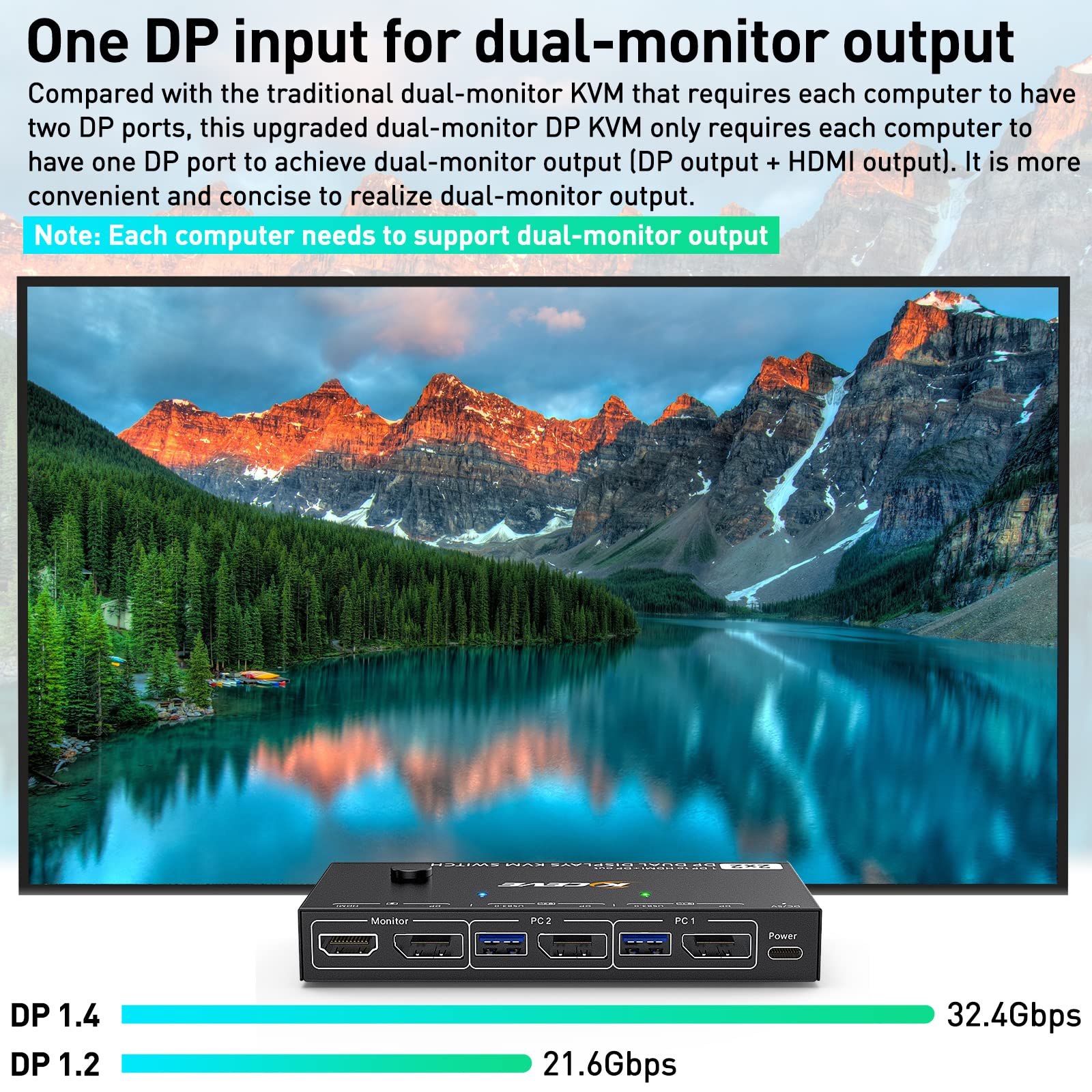 ["【2x DP in / HDMI and DP out】 With this DP KVM dual monitor switch, you can connect 2 DP port computers to share 2 monitors (DP + HDMI) together. Only need 1 DP connection for each computer, while traditional KVM switches with dual monitors in the market require 2 DP connections for each computer. This is an updated technology from our team. We provide the best service and professional support.","【Supports 2 Display Modes】 This DP USB 3.0 KVM switch supports 2 display modes. In "Duplicate" mode, the main screen can be mirrored on the secondary screen. In "Extend" mode, the window from the main screen can be dragged to the second screen. MAC m1m2 computers do not support outputting to different displays, please do not purchase for MAC m1 or m2.","【With 4 USB 3.0 Ports】 This 2-in-2-out DP KVM USB 3.0 switch comes with 4 USB 3.0 ports for sharing mouse, keyboard, USB printers, scanners, etc. The USB 3.0 transmission is more stable and faster, if you are looking for a USB 3.0 version KVM switch, this is a great choice!","【Supports 2 Switch Modes】 Supports physical buttons and wired control. Only use this DP KVM switch if your computer supports dual display or multi-display to achieve sharing two monitors with two computers, please select extended mode or duplicate mode on your computer. Mac M1 does not support extended display.","【8K@30Hz HD Resolution】 Supports high resolution of 8K@30Hz, please use a high standard DP cable to achieve 8K@30Hz resolution, simultaneous HDMI+DP output only supports 4K30. Plug and play, driverless, we provide one year professional warranty. Feel free to contact us with any questions."]