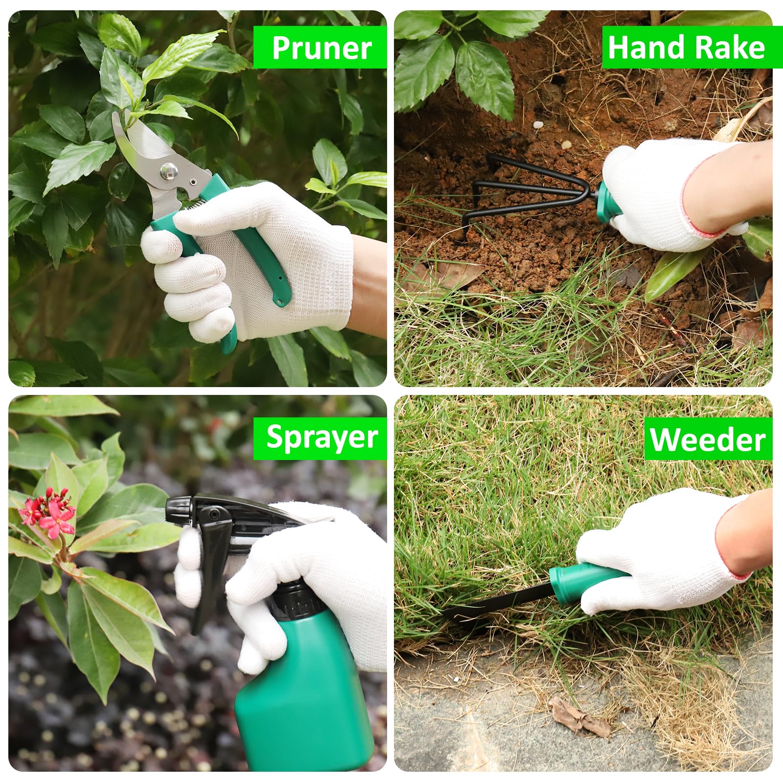 ["1.【High-Quality Gardening Tool Set】- With the 10-piece garden tool set, you have everything you need for small gardening tasks, such as digging, weeding, loosening soil, and transplanting.","2.【Premium Material】- Tools with high carbon steel heads, tools made of solid polished steel aluminum. They are shiny, rust-resistant, durable, not easily bent, and extremely sturdy components that promise longevity.","3.【10-piece Gardening Tool Set】- This garden hand set includes: planting pot, trowel, pruning shears, rake, weed remover, cultivator, sprayer, gloves, multi-compartment. Perfect for growing flowers and vegetables, digging up weeds, loosening soil, pruning, transplanting, and much more.","4.【Easy to Carry】- This gardening tool set comes with a portable bag with built-in sorting slots to better organize and protect the gardening tools. It is easy to carry, takes up little space, and is suitable for various transportation methods.","5.【Ergonomic Design】- The soft plastic handle with texture provides excellent non-slip performance, reduces hand and wrist fatigue, and makes planting easier and faster. Practical design of the hanging hole on the handle, easy to carry and store."]
