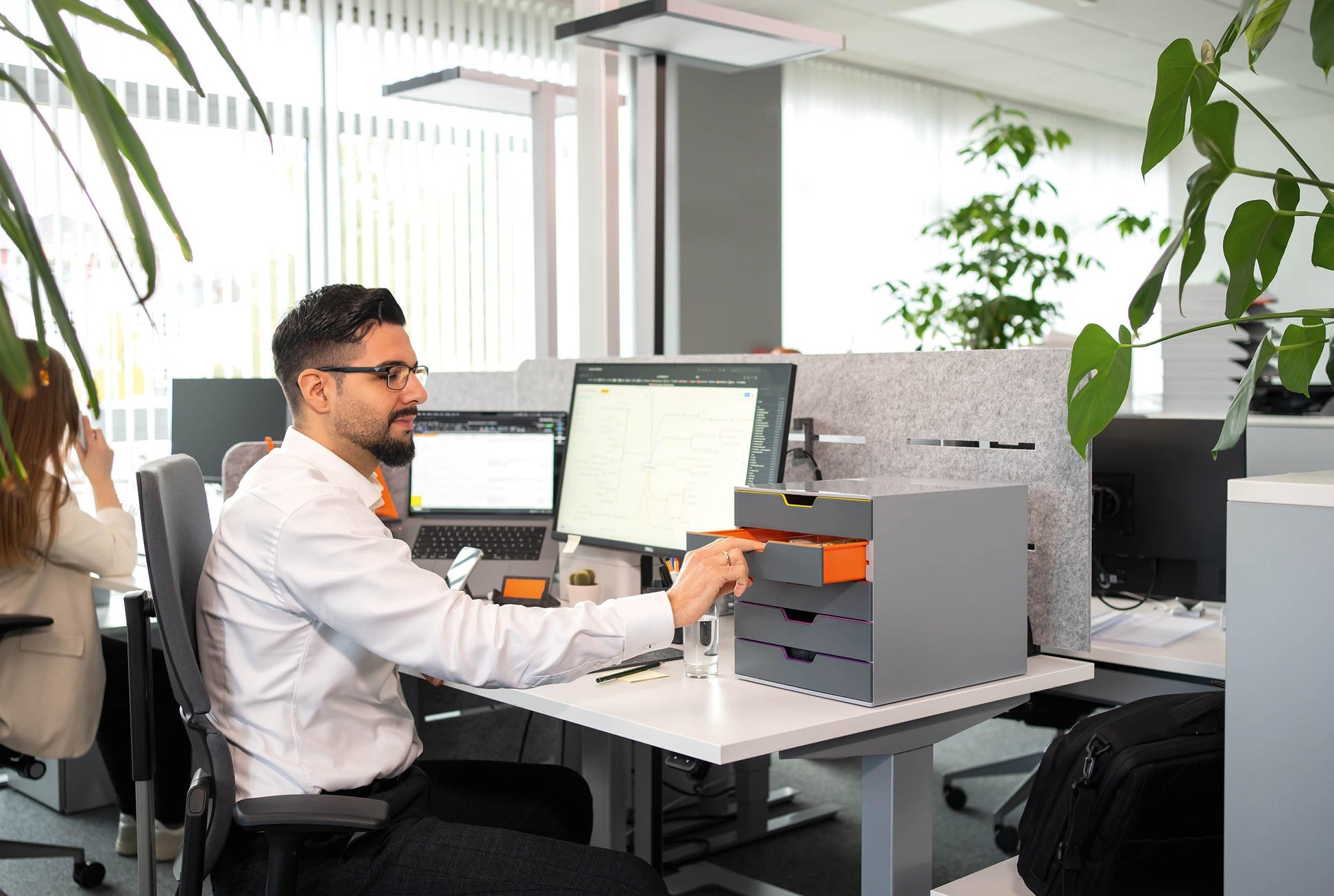 ["Desk storage system for office, cabinet, or shelf. Organizer box fits formats up to DIN A4, C4, as well as Folio and Letter Size formats","Very good overview with subtle color lines on drawers and transparent labeling windows with interchangeable insert labels","Non-slip and stackable drawer organizer. Storage system fits in all standard office cabinets and sideboards: Dimensions of the storage box: 280 x 292 x 356 mm (W x H x D)","Smooth-running drawers with noiseless drawer slide and locking mechanism, can be exchanged for individual office organization system","Included: Durable storage system 760527 with 5 compartments made of sturdy ABS plastic. Compartment colors: 1x yellow, 1x orange, 1x red, 1x light purple, 1x dark purple","Made in Germany. Durable is one of the leading German brand manufacturers of office organization and presentation materials.","Environmentally friendly in accordance with ISO 14021: 100% recyclable","Quality promise: Durable Varicolor drawer boxes are made in Germany - 5 year warranty (conditions on manufacturer's website)"]