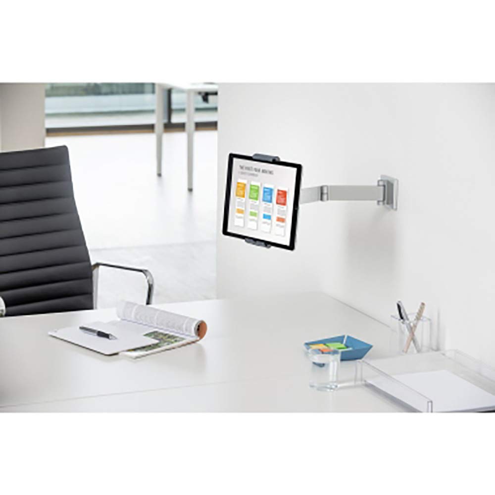 ["Swivel Wall Mount TABLET HOLDER WALL ARM with variable mounting module for tablet sizes from 7"-13"","Tablet module of the wall mount rotates 360°, with locking points at every 90°; tilt range from -6° to +46°","Easy insertion and removal of tablets; rubberized surfaces protect the tablet from damage Suitable for all tablet depths up to 8 mm Depending on the tablet edge radius, also suitable for depths above 8 mm Suitable models can be found in the product description","Flexible swivel arm: 365 mm reach, 180° swivel","Easy installation of the adapter for wall mounting; elongated hole in the arm for power supply via charging cable; theft protection with special key","Environmentally friendly in accordance with ISO 14021: 100% recyclable, up to 40% recycled content"]