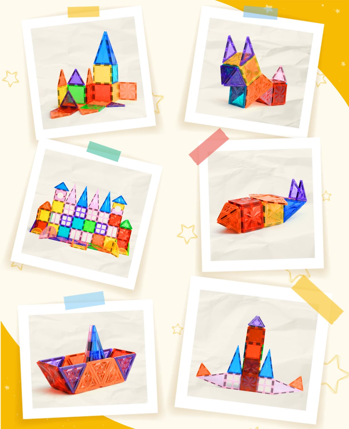 ["Easy Builders Made Easy"] This 80-piece magnet toy for children offers various shapes and vibrant colors. Compared to other products, our DIY magnetic toy for children offers the best value for money. Magna tiles Kids can freely create 2D and 3D models.