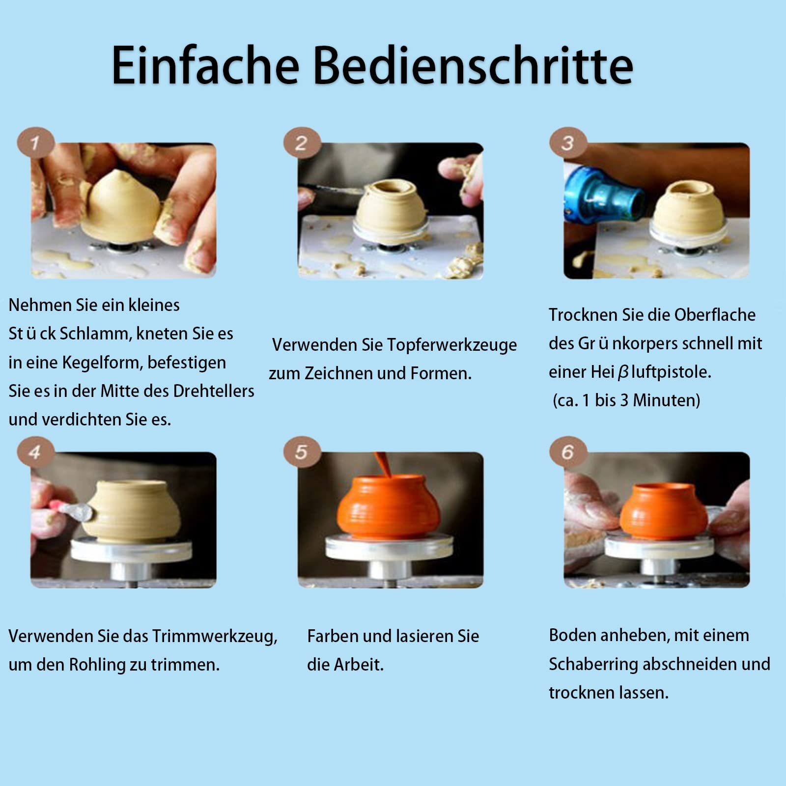 ["Features: Aluminum alloy discs can be rotated in two modes, forward and reverse, to meet your forward and reverse requirements. The product is equipped with a high-quality motor with stable speed, adjustable speed from 0-2000 RPM, low noise level, and strong performance.", "High-quality material: The noise of a premium motor is below 60 decibels. The removable ABS shell can block water splashes and keep the work area clean; It adopts high-pressure die-casting, which is removable and easy to clean. Additionally, an aluminum alloy turntable with a diameter of 10 cm that is rust-proof, smooth, and wear-resistant, combined with an integrated metal housing, high-quality waterproof, built to last.", "Exquisite and compact: Exquisite and compact appearance, one-piece ceramic wheel body spray treatment, compact structure, vibrant colors make your mood pleasant, portable and compact size that you can use and move anytime.", "Easy to use: This pottery wheel can be easily used without basic pottery knowledge. Turn on power - press the dial button - and start quickly. ABS shells are easy to assemble, simple, and efficient.", "Wide application: small and easy to carry, suitable for school classes and pottery crafts, satisfying professionals and pottery lovers. Widely used for pottery throwing, shaping, pottery classes, entertainment, etc."]