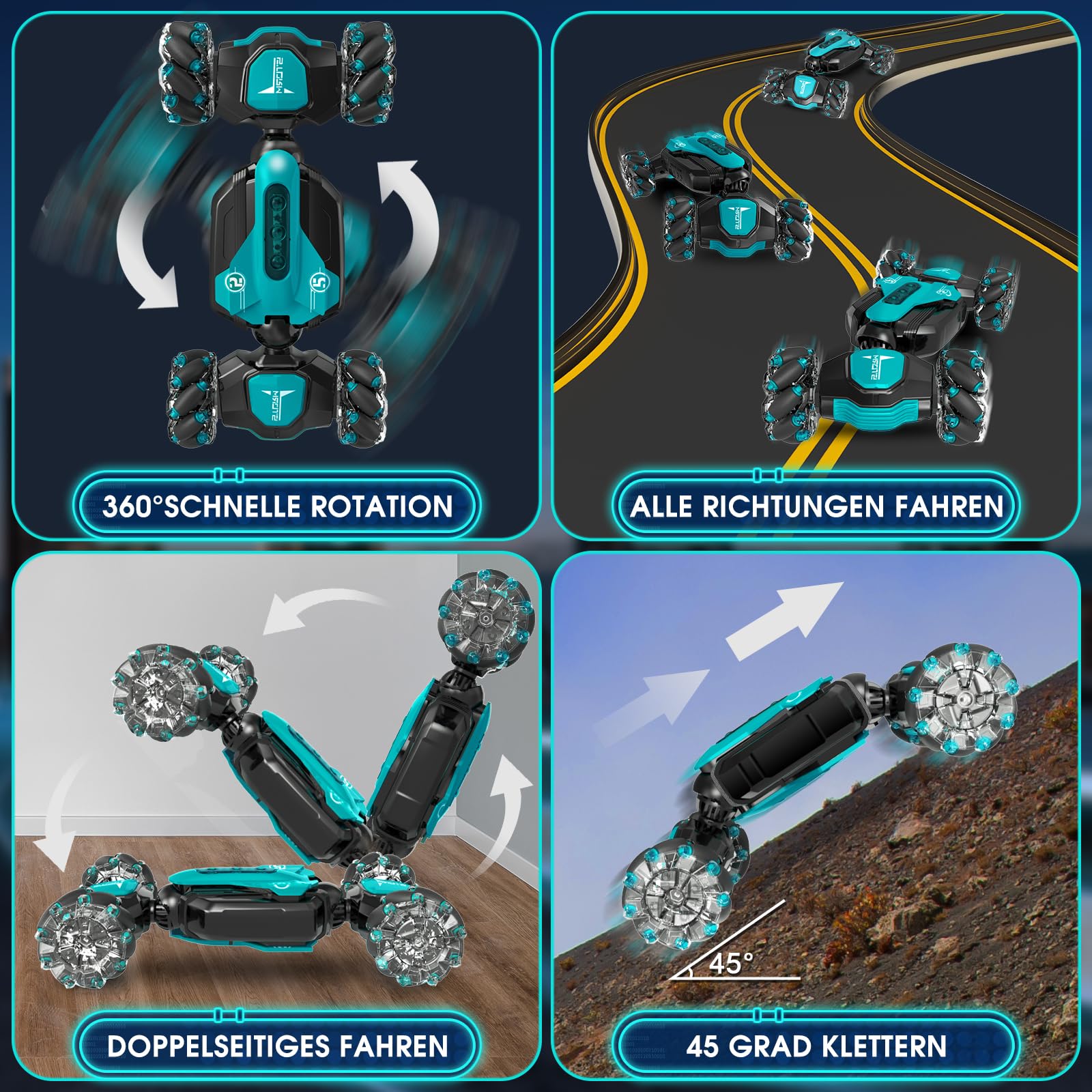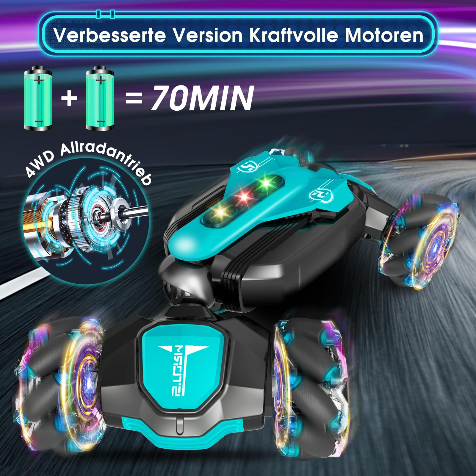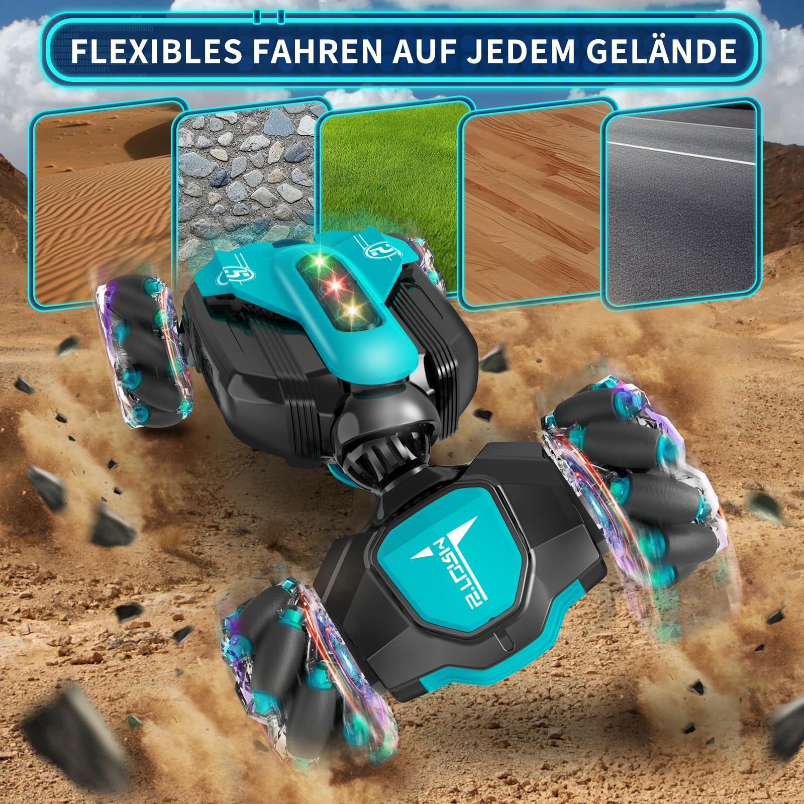 ["Multiple Play Options Drift RC Car: RC Stunt Car comes with remote control and a gravity sensor watch. Control the mini remote control car with the remote control or use gestures through a wristwatch, and then the toy car will go into Twist/Move/Rotate/Off-Road mode. It is an exciting experience for boys and girls, even for men and women","All-Round Drifting: Handheld Stunt Car 4WD stunt vehicle that can drift in all directions, 360° rotation, two-sided driving, stunt skills, and freely switch between on-road and off-road modes. The remote-controlled 4WD transformer car is suitable for various rough terrains, sand, grass, dirt, rocks, and more. With dazzling colorful lights and music effects, the remote-controlled RC Drift Car is the most popular remote-controlled car for girls and boys aged 4 to 12 years","Multiple Remote Control Vehicles at the Same Time: Remote control racing car, multiple hand-controlled RC cars can play together without signal interference. Equipped with powerful dual motors and rolling tires, the off-road RC car easily overcomes various terrains. Provides you with an excellent outdoor racing experience","2 Batteries Remote Control Drift Car for over an hour of fun: RC car off-road is equipped with 2x 3.7V 300mAh batteries for longer operation, supporting about 70 minutes of playtime for this Twist Car for boys and girls. With an ultra-long range of 60-80m, you can enjoy uninterrupted free driving. Fast and convenient charging via USB","Great Toy Gifts for Boys and Girls aged 6 8 10 12 Years: Collective features of the best remote-controlled cars are perfect for not only children but also adults to fulfill all their fantasies about toy cars. Ideal gifts for friends, your son, daughter, grandson, granddaughter, nephew, niece, or cousin. Perfect for birthdays, Easter, holidays, Children's Day, Halloween, New Year, Xmas, and Christmas","Please note that this remote control automatically shuts off power if not used for a short period to save power, and you need to restart it to continue using the remote control"]