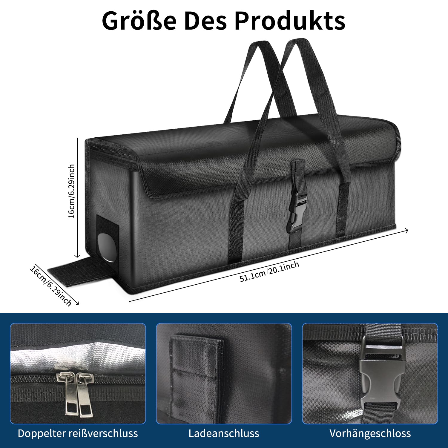 "Secure charging with double protection - Our bag uses a double sealing design with a Velcro closure and zipper to ensure a secure closure during the charging process. In case of an acute battery fire, this complex double-layer system effectively slows down the spread of gas and flames, giving you valuable time to react and maximizing your safety."