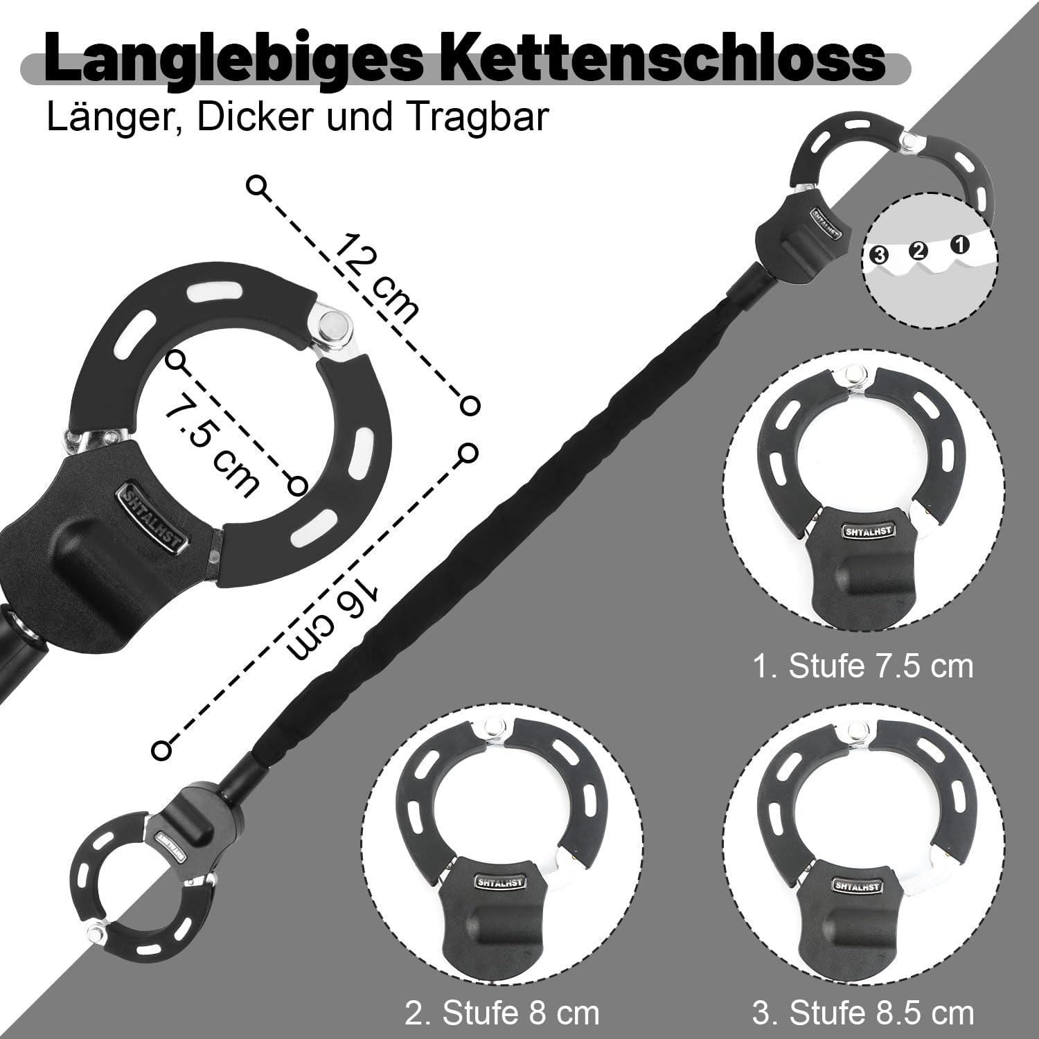 ["▸Anti-Theft Design◂ The e-scooter lock is made of durable alloy steel, a high-strength thick chain, and is resistant to cutting, breaking, sawing, and shearing. The chain lock prevents theft in daily use.","▸High-Quality Material◂ Our bike lock is made of fully alloy steel, and the theft-proof locking cylinder made of zinc alloy is not easy to rust and not easy to cut. The lock for e-scooter is sturdy, durable, and resistant to environmental influences, so it performs best even under rough weather conditions.","▸Multipurpose Lock◂ The handcuff lock is made of hardened steel, the total length of the chain lock is 94 cm and the length of the chain part is 60 cm, which is very suitable for electric scooters, electric bicycles, bicycles, and ladders, strollers, motorcycles, fences, etc.","▸3L Scooter Bag◂ The scooter bag is made of waterproof EVA material, scratch-resistant and wear-resistant, durable and waterproof. Protect your belongings and valuables. The e-scooter lock and scooter bag are the perfect addition to your scooter. With its large capacity, you can store more items.","▸Easy to Use◂ Our e-scooter lock features a double-ring lock design, easy to use, no complicated installation steps, simple one-button lock and unlock, can protect your electric scooter quickly and easily. With this escooter lock, you can safely and conveniently park your electric scooter anywhere."]