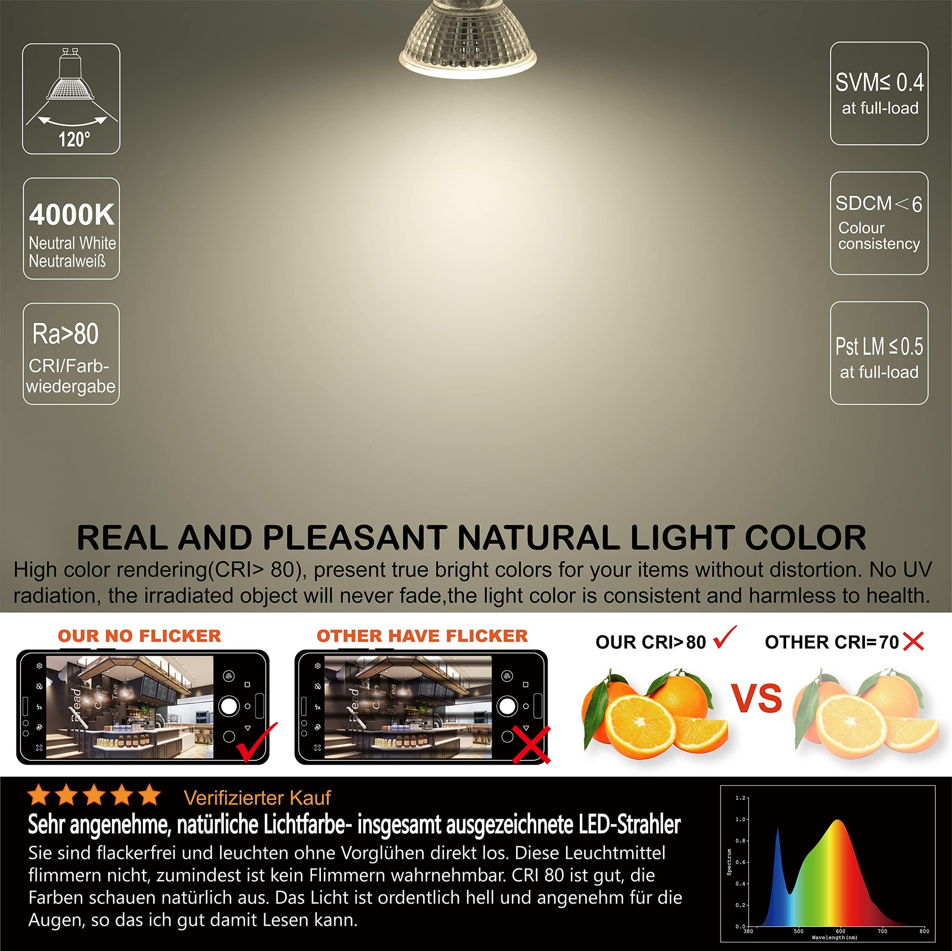 "They have a transparent protective cover and edges, a smooth lamp body, and are easy to clean. Aluminum-silver-glass look, great workmanship, safe and drop-resistant packaging. Excellent color reproduction and consistency (CRI>80, SDCM<6), present true vibrant colors for your items without distortion. No UV radiation, the irradiated object will never fade, safe for your health. They are flicker-free and instantly full brightness without preheating, take care of your eyes at all times. Real and pleasant natural light color is like traditional halogen incandescent bulbs and has less heat, suitable for your indoor lighting. Easy to install standard light source, no need for additional transformers and electrician adjustments, you can simply screw in the GU10 sockets, create a cozy and natural atmosphere for your whole house. They are not dimmable and do not require a dimmer. More than 30,000 hours of lifespan and high efficiency and energy savings of about 90% on the electricity bill, significantly reduce maintenance and operating costs. Within 3 years, if they have damage or malfunction, you do not need to return the faulty product, we will refund you directly or provide a free replacement of the new product. Once installed, durable, and hassle-free after-sales service, please feel free to add it to your cart."