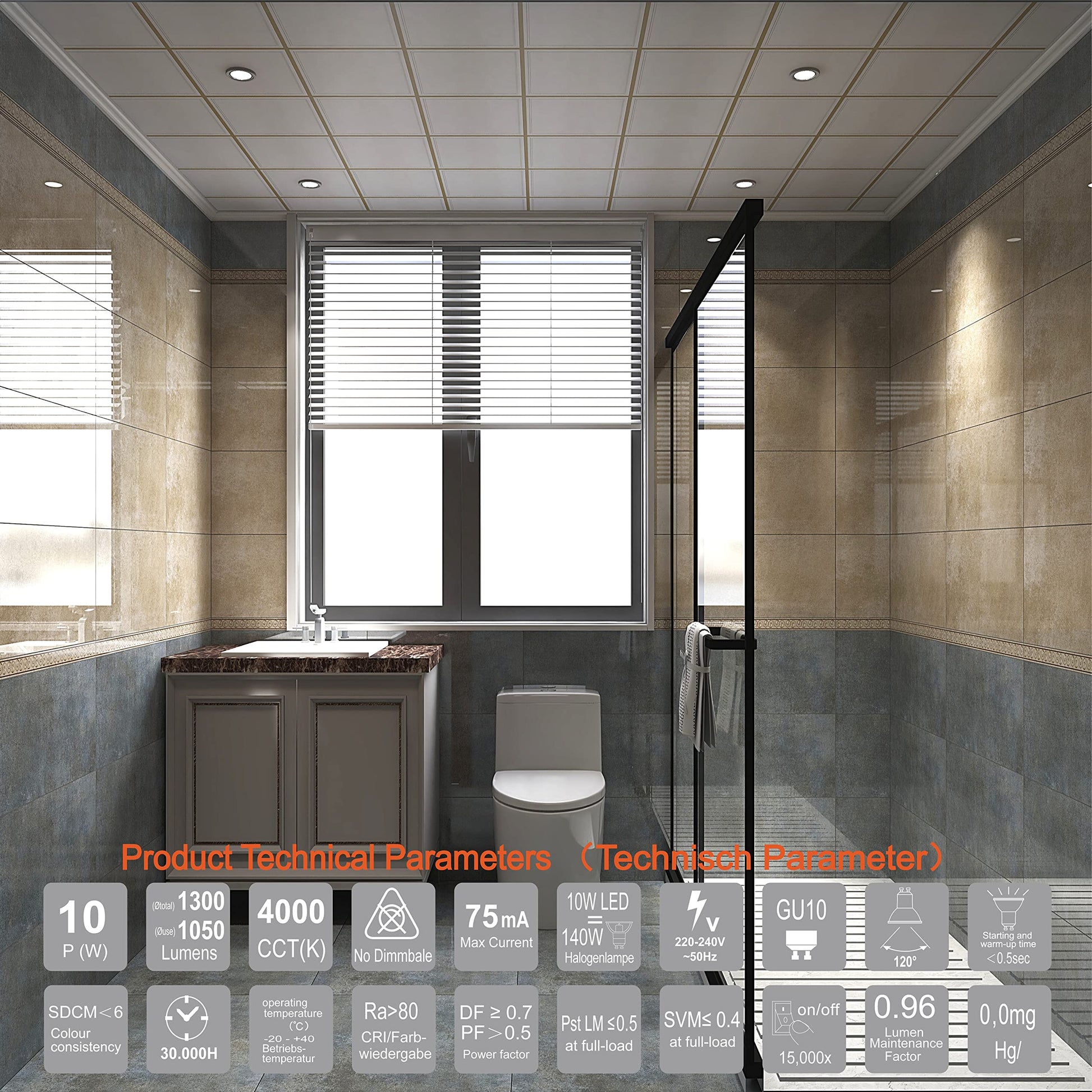 EACLL GU10 LED 4000K 10 Watt replaces 140W halogen bulbs, 6-pack. Neutral white 1050 lumens bulbs, AC 230V flicker-free spotlight, 120-degree beam angle. Non-dimmable reflector lamps.