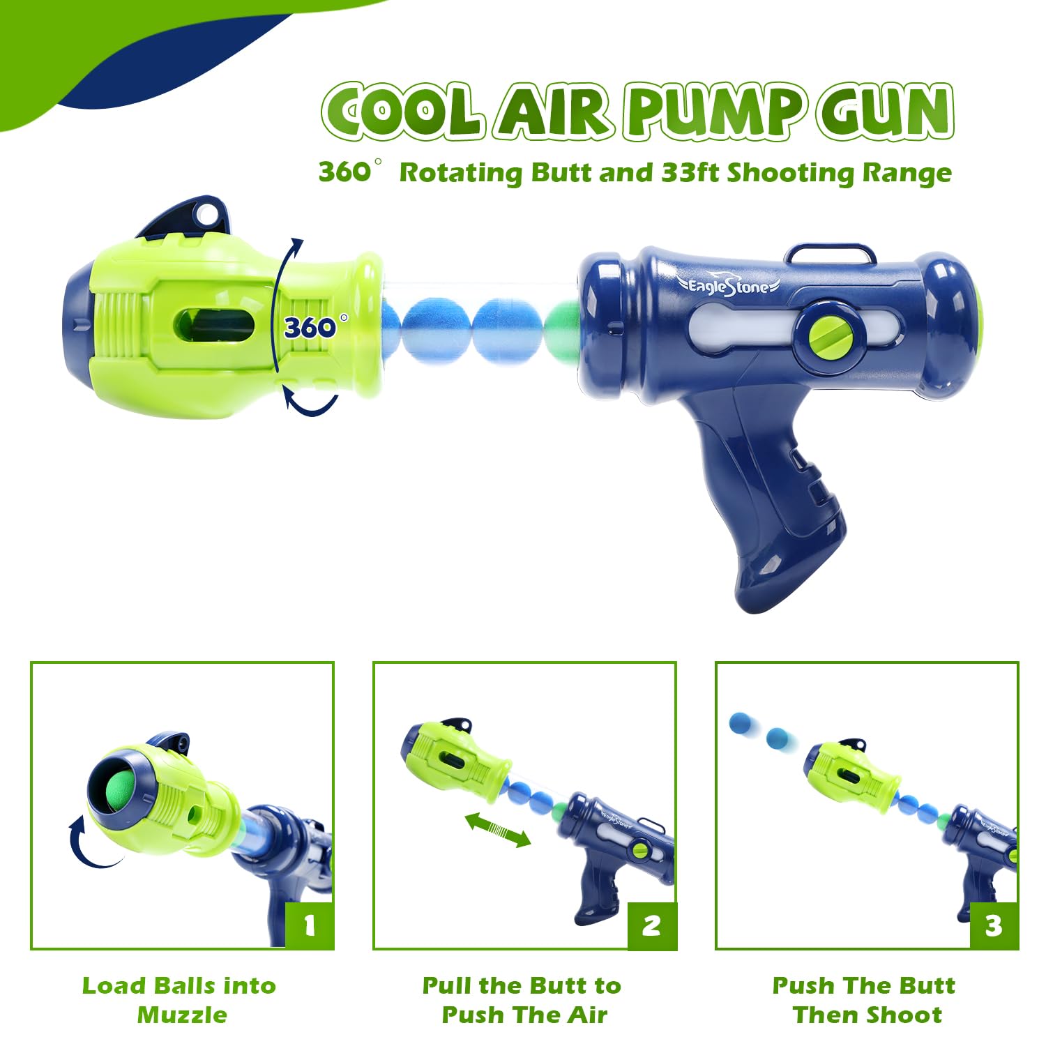 ["COOL PUMP-ACTION GUN AND SAFE BALLS"] The power-popper gun has a 360° button and a shooting range of 33ft. The balls are made of EVA foam, which is very light, safe, and harmless. Soft, safe foam balls collect in the belly of the dinosaur. Easy to remove for recycling. No harm to anyone or anything it shoots.
