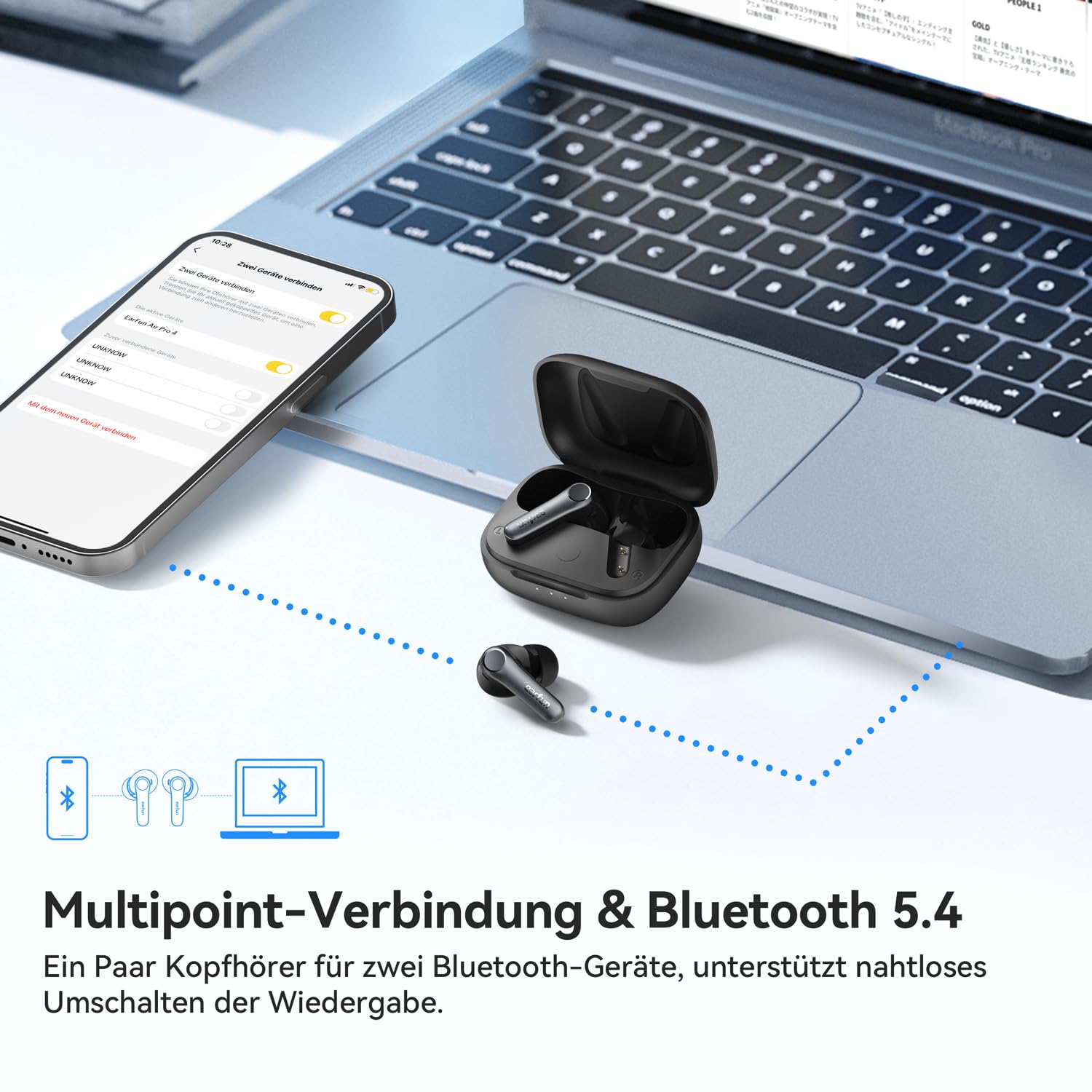 EarFun Air Pro 4 Bluetooth headphones with Adaptive Hybrid Noise Cancellation, aptX Lossless, Hi-Res Audio, LDAC, 6 microphones cVc 8.0 AI calls, 52H battery life, Multipoint, Bluetooth 5.4, In Ear Detection.