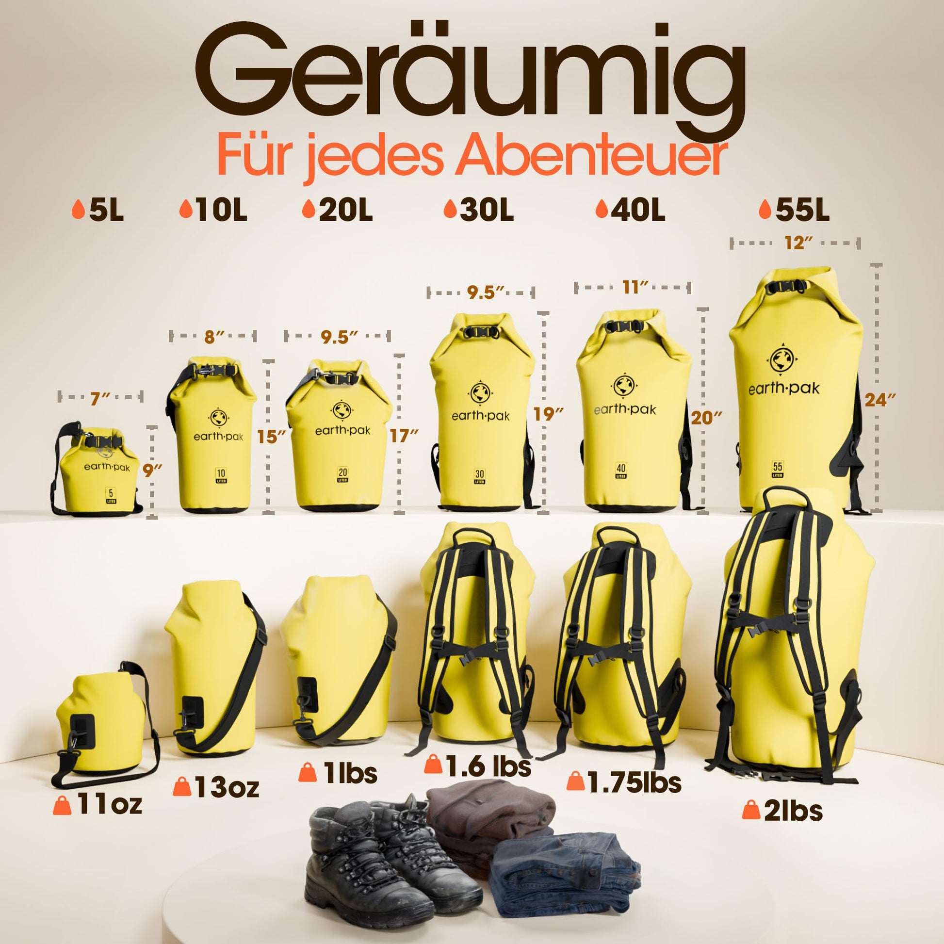 ["Top rated by Wirecutter: Durable, reliable, and wallet-friendly are just some of the reasons why Wirecutter has chosen the Earth Pak as one of the best dry bags of 2024. Our classic roll-top design keeps your contents dry and all our bags are protected by a five-year warranty.", "Shoulder Strap: 10L and 20L dry bags come with a 24-42.4 inch shoulder strap. 30L, 40L, and 55L waterproof backpacks are equipped with backpack shoulder straps that also come with a chest strap for added stability. Our new 55L also comes with a sturdy waist belt that relieves extra pressure and supports your load.", "IPX8 Certified Waterproof Phone Case: We have included our IPX8 certified, waterproof 6.5-inch phone case, suitable even for the largest phones. This case features a very simple snap and lock access with dual-sided transparent windows that allow you to take photos while still in the case. Suitable for phones with a screen diagonal of up to 6.5 inches (16.5 cm).", "【Ideal for Travel】Our water bag is very lightweight and compact, making it an essential dry bag for all your travel plans. Easy to fold and store in luggage of any size.","【Keep your items dry and protected】Protect your valuables with our 5L, 10L, 20L, 30L, 40L, or 55L Dry Bags! Simply toss your gear into your water bag, roll it down, and you're ready to start your next adventure."]