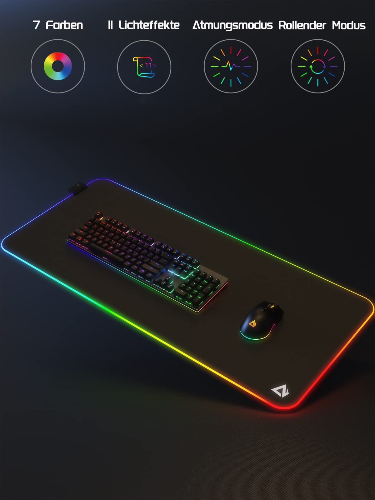 EASEMO Gaming Mousepad, RGB Mousepad, XXL large (900 x 400 x 4 mm) with 7 LED colors, 11 lighting modes, and waterproof fabric surface, non-slip rubber base for PC, laptop, keyboard