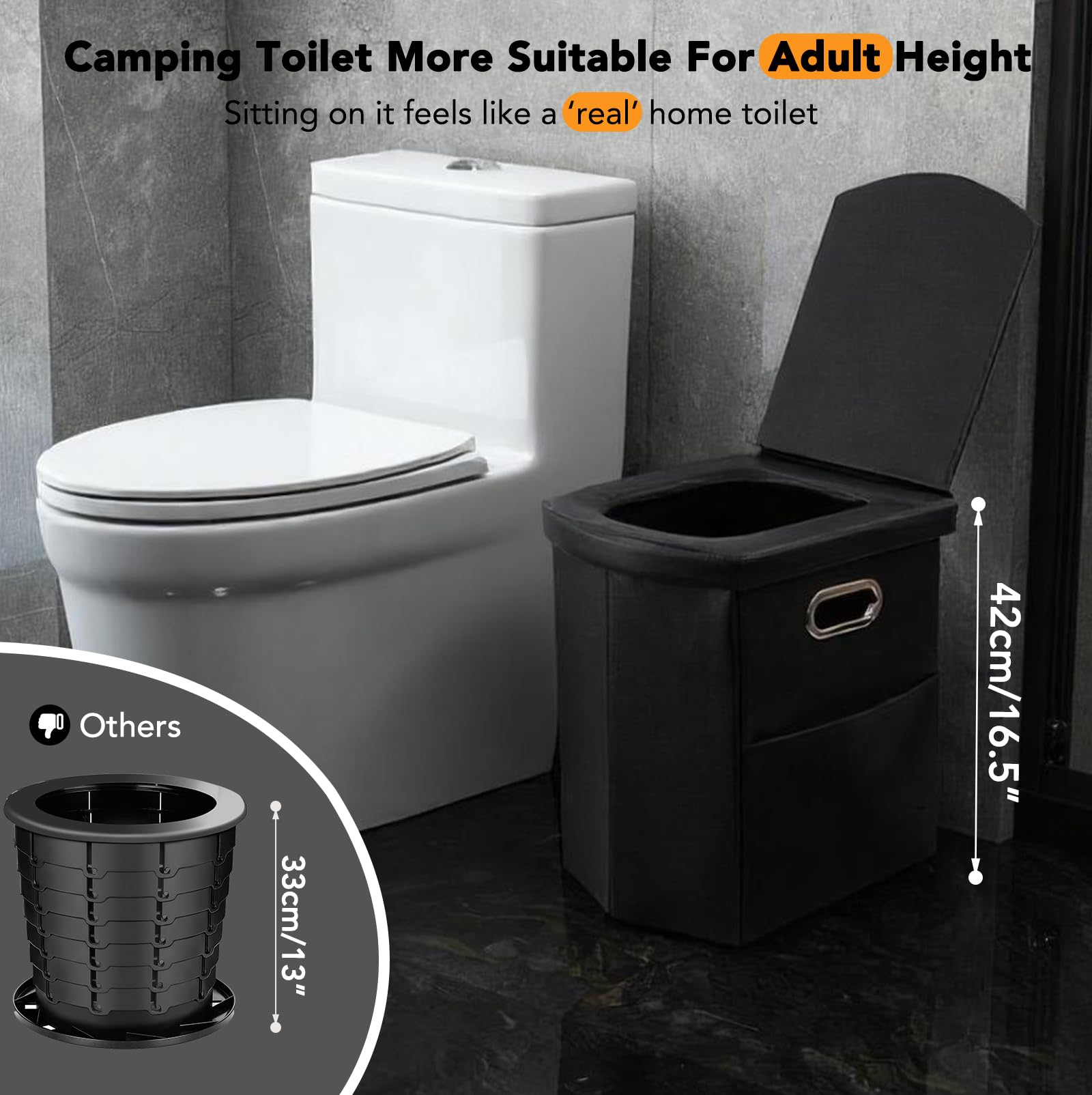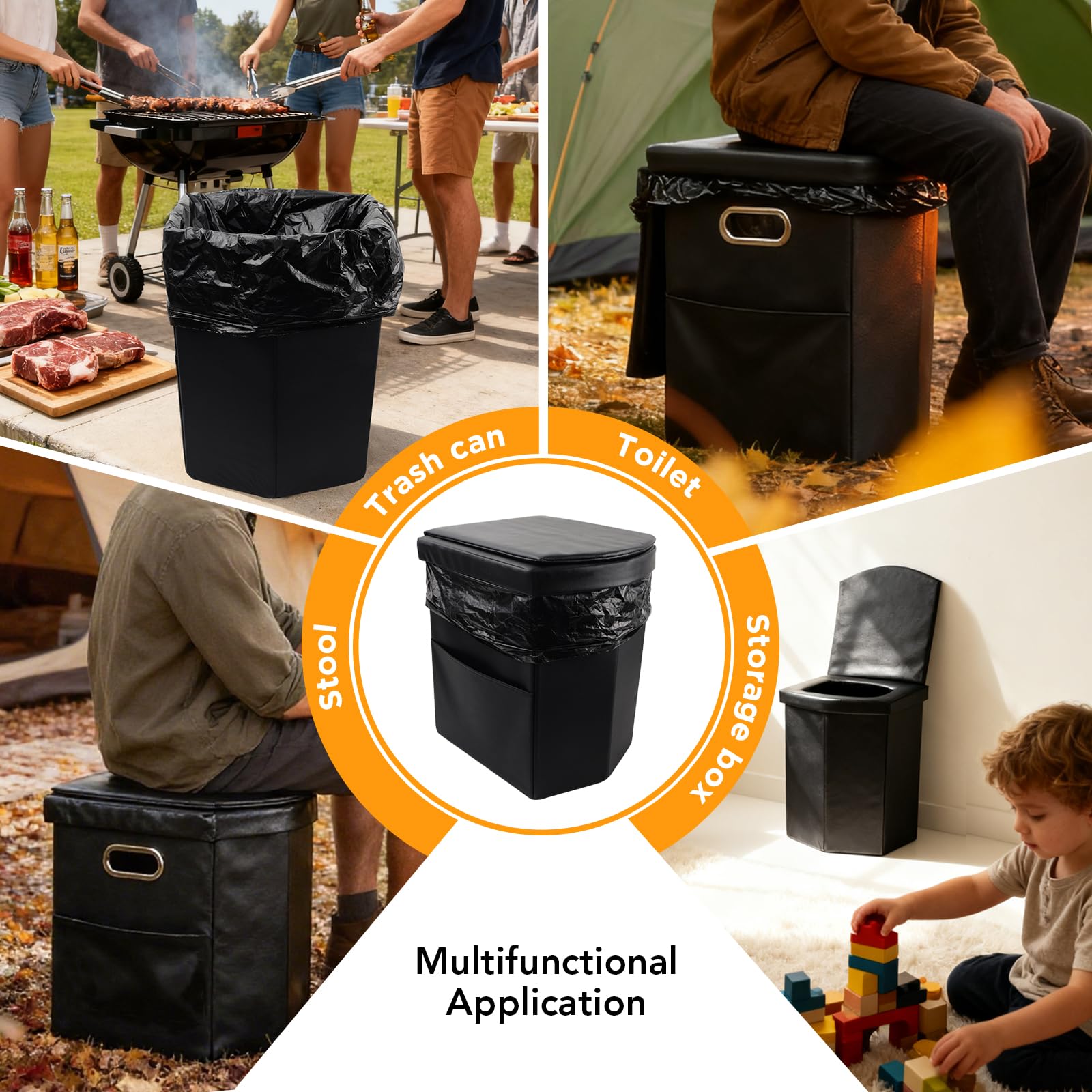["Living room comfort - No more cold shocks"] ["Done with cold, hard plastic seats! Our portable toilet has a premium leather seat that feels soft and warm. With a 42 cm seat height like a real household toilet - relieves the knees and prevents dizziness when standing up. No more unnatural "collapsing" - simply ergonomic and comfortable even during extended outdoor use, camping, or emergencies."] ["Stable & secure - Holds up to 440 lbs"] ["With a sturdy MDF core and a wide, non-slip base, this outdoor toilet stands securely and stably even on uneven ground. For maximum safety and durability - without sacrificing comfort. The reliable solution for any body size and terrain."] ["Ultramobile & space-saving: Always with you!"] ["Never be caught off guard by natural needs! This camping toilet is your perfect companion. When folded, it's only 3.15 inches flat - fits in any trunk, RV, or backpack. Ideal for spontaneous camping trips, road trips, fishing, boat excursions, festivals, and emergencies. Always ready for comfort and hygiene!"] ["Hygienic & quick to clean in seconds"] ["With a folding lid and a tightly closing seat ring - including biodegradable bags for an odor-tight seal. The water-repellent, dirt-resistant surface wipes clean in a flash. Maximum hygiene with minimal effort."] ["Your versatile all-rounder - More than just a toilet!"] ["Why settle for single-purpose solutions? This all-in-one product is your perfect travel partner: It quickly becomes a reliable toilet, a sturdy stool, a practical storage box, or a vomit bucket in the next moment. The ideal solution for camping, household emergencies, potty training, and care - maximum comfort and unbeatable versatility!"]