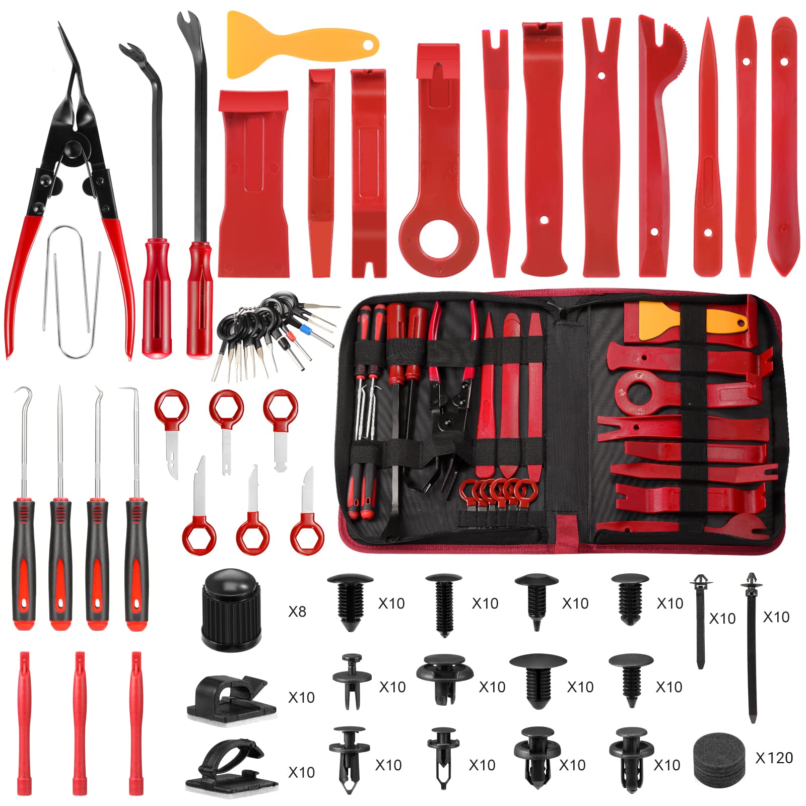 ["[330-piece Car Disassembly Tools]: including 11 x removal tools, 2 x clip release tools, 1 x clip removal pliers, 120 x car fastener clips, 20 x cable clips, 11 x cable connector removal tools, 6 x stereo removal keys, 2 x radio removal U-hooks, 4 x oil seal hooks, 8 x valve caps, 120 x sponge pads, 20 x cable ties, 3 x pry tools, 1 x scraper, 1 x portable storage bag",