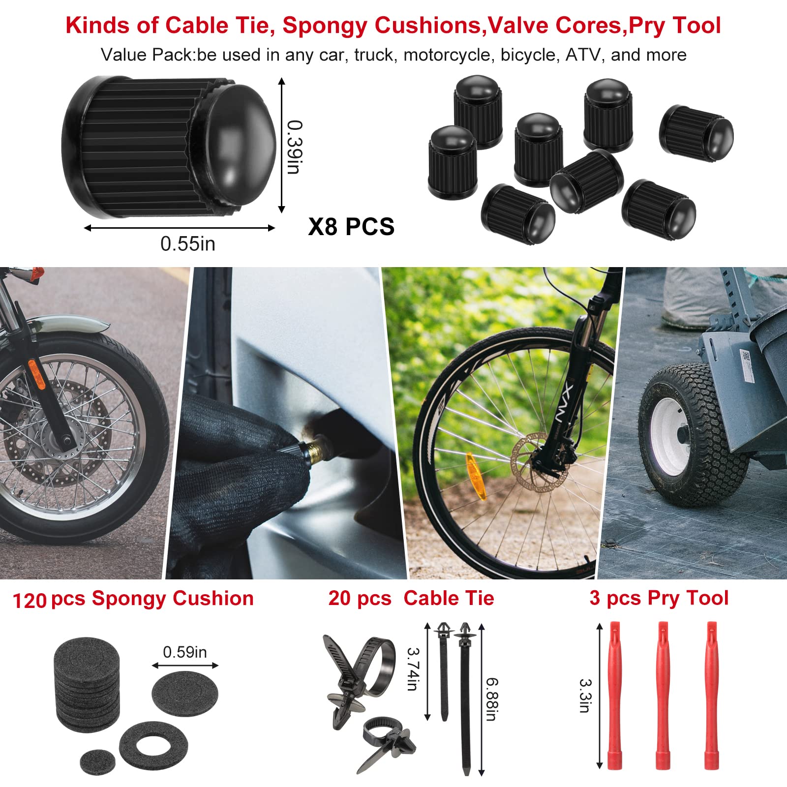 "[Multipurpose]: Oil seal removal hooks are great for removing hoses, dies, clips, seals, O-rings, cotter pins, and more. Self-adhesive cable clips, ideal for automotive, computer/TV cables, power cords, USB cables, and more. Nylon cable ties keep your car neat and organized. Tire valve caps are commonly used in auto shops and for home tire cap replacements. Foam pads allow for safer installation"]