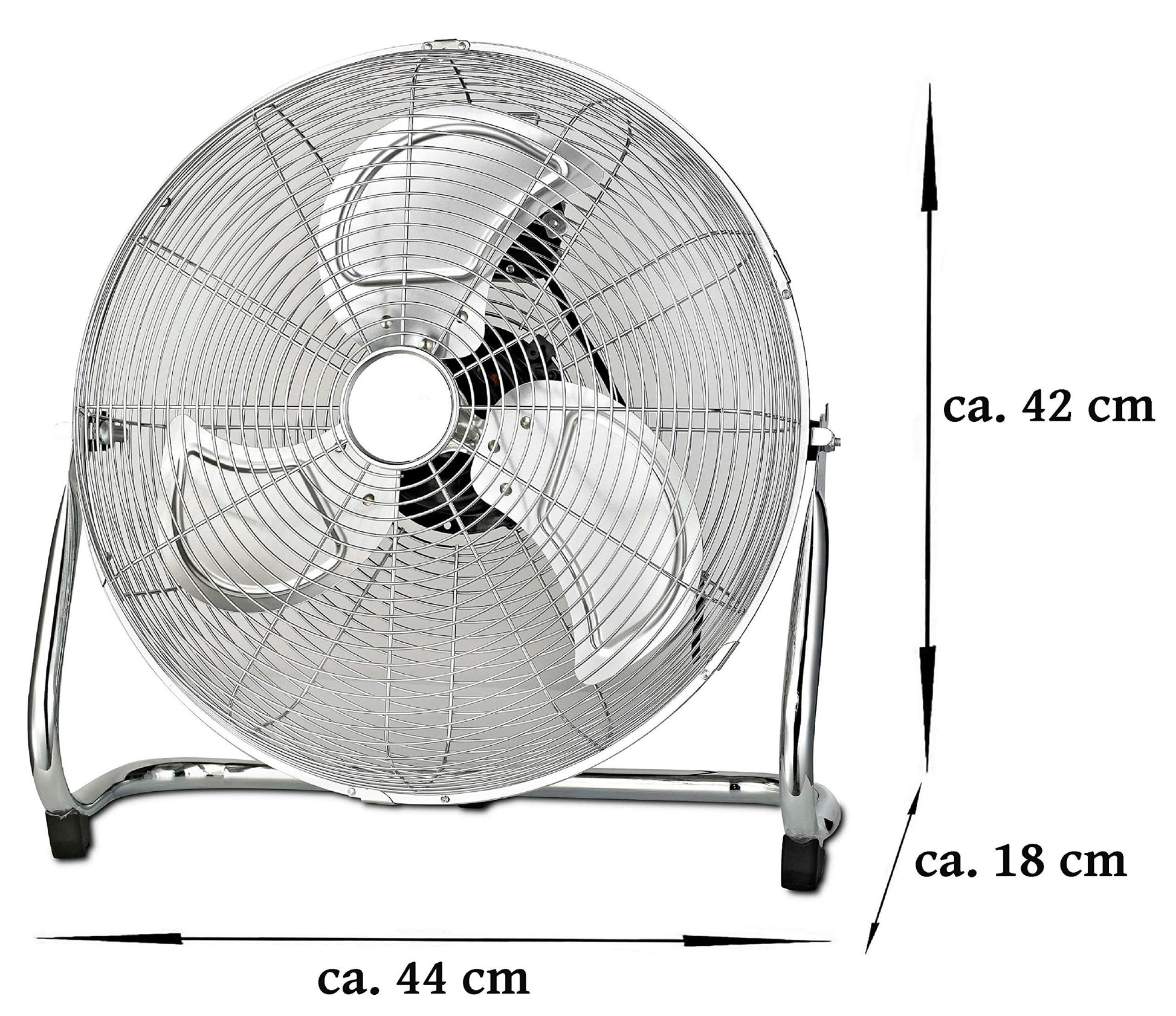 ["Highlights: Full metal (housing and propeller) Power: 50 watts 3 speed levels 90° adjustable tilt angle Ø 35 cm Quiet operation at 64.1 dB(A) High-quality construction: Fan blades made of metal Stable base: Large wire foot with floor-protecting nubs Area-wide effect: Vents from the floor to the entire room Power supply: 230 V, 50 Hz","Dimensions: approx. 42 x 44 x 18 cm (HxWxD) Cable length: approx. 100 cm","Are you ready for summer?! The strong whirlwind with a 35 cm diameter, 50 watts of power, and a 90° adjustable tilt angle will surely provide a pleasantly cool breeze.","This fan draws in the coolest air and distributes it throughout the room. Because the freshest air is right at the floor! The highly effective wind machine uses a powerful 50 watts.","With its high-quality full metal construction, it's not only visually stunning but also a technical highlight."]