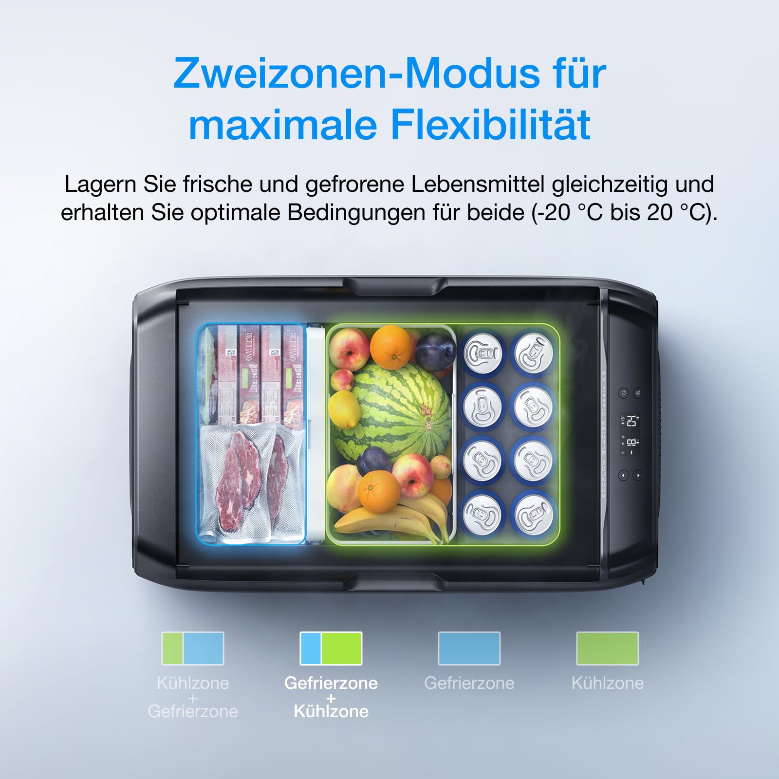 "Cooling flexibility with two zones: The left zone functions as a cooler or freezer box with precise temperature control, while the right zone serves a different function accordingly. Configure it as a cooler and freezer box or freezer and cooler box – perfect for keeping drinks and snacks chilled in one zone and ice or frozen treats in the other."