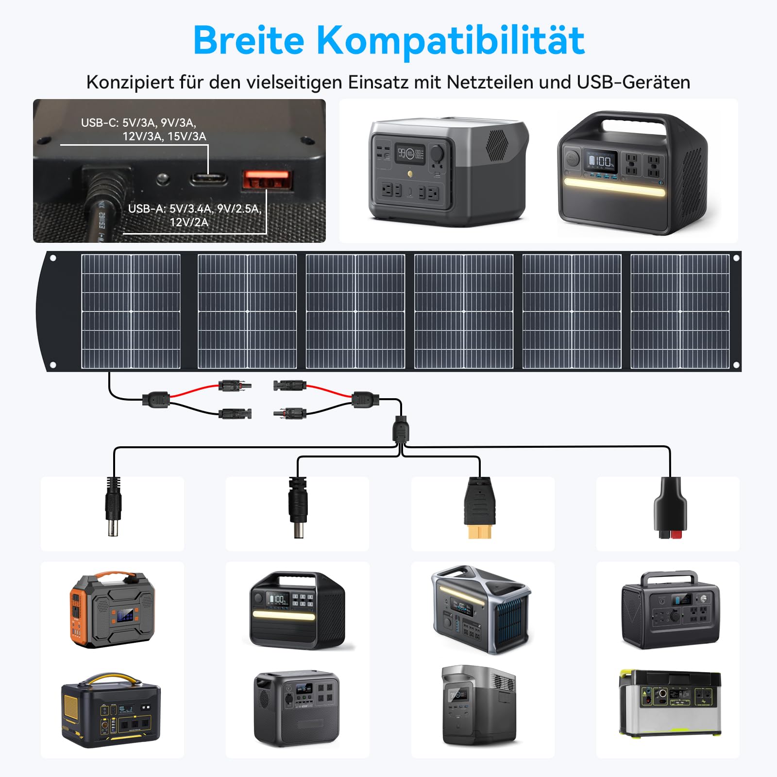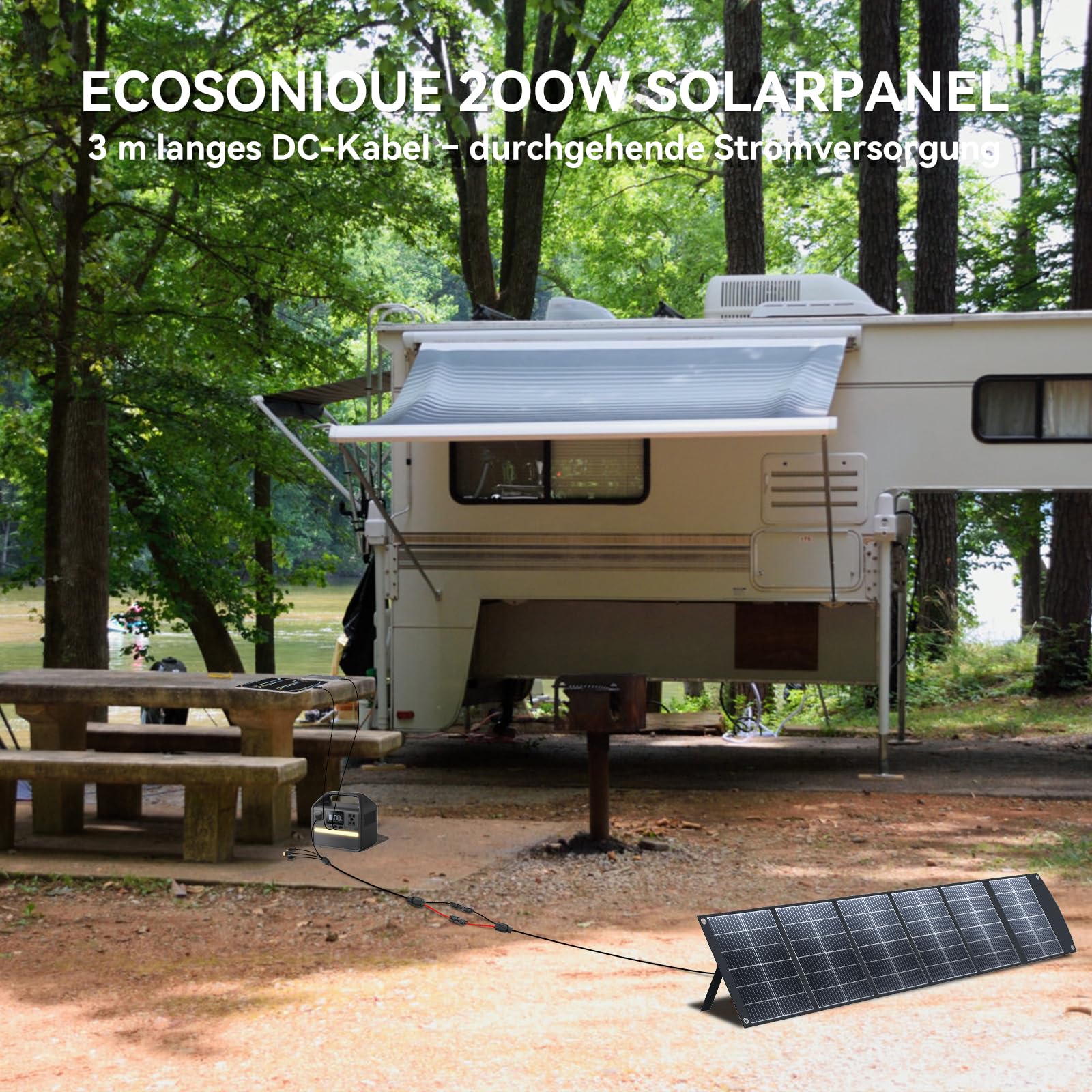 ["Lightweight and Ultra-Sporty 6-Fold Design: This 200w Portable Solar Panel weighs only 4.8 kg (approximately 10.6 lbs) and can be folded to a size of 458 x 415 mm (approximately 18 x 16.3 inches). It is ultra-sporty and perfect for camping, hiking, RV trips, and emergency power supply. Equipped with eyelets, it can be easily attached to tents, trailers, or backpacks for convenient portability.", "Wide Compatibility: It features an MC4 direct output with a 3-meter MC4 cable and includes a 0.5-meter MC4 to XT60, Anderson, DC7909, and DC5525 cable. This makes it compatible with power stations from EcoFlow, Jackery, Bluetti, Anker, and other manufacturers. It also supports direct charging of laptops, smartphones, tablets, and battery packs with USB-C PD3.0 (45W) and USB-A QC3.0 fast charging.", "High Efficiency with Stand Support: With 4 adjustable stands, this solar panel is designed to maximize sun exposure, ensuring faster and more stable charging. With a conversion efficiency of up to 23.5%, it can harness more solar energy to power your devices on the go.", "Safe and Waterproof Charging: Thanks to the auto-restart feature, the solar panel adjusts quickly to changing light conditions, eliminating the need for manual adjustments. The intelligent chip technology protects your device from overcurrent, overvoltage, and short circuits, ensuring safe and reliable charging. The waterproof Oxford fabric and CPC lamination make it dust and water-resistant, perfect for camping, hiking, RVs, boats, and emergencies.", "Package Includes and Warranty: 1 x 200W Solar panel, 1 x 3 Meter MC4 Cable, 1 x 0.5 Meter MC4 to XT60, Anderson, DC7909 & DC5525 Cable, 1 x User Manual. We offer a 12-month warranty. If you encounter any problems, please contact us. We will respond within 24 hours."]