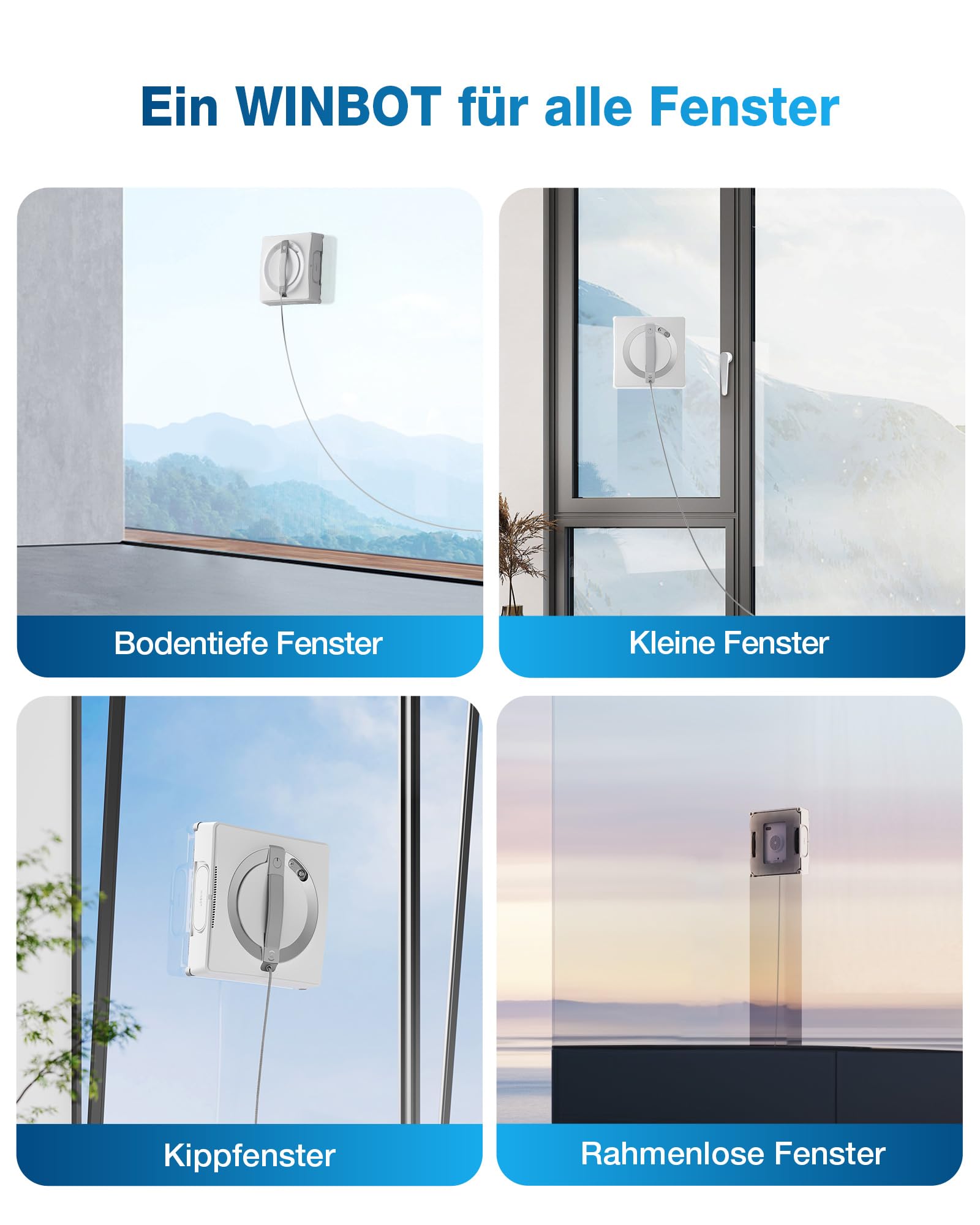 ["Winbot for all windows: Whether it's floor-to-ceiling, small-sized, frameless, or tilt windows, the WINBOT W2 equipped with WIN-SLAM 4.0 intelligent path planning and sensor smart detection frame adapts to all types of windows and scenarios.,10-stage protection system: With the.","10-stage protection system that consists of both hardware and software, the WINBOT W2 provides the highest level of security. It includes 6 hardware-based safety measures against falls, a 3-stage intelligent software solution, and insurance coverage against accidentally caused damage.,","Brand new edge cleaning mode: Precision meets intelligence. The WINBOT W2 detects edges with remarkable accuracy and adjusts the cleaning path intelligently in just 0.02 seconds - even with frameless windows no problem. But that's not all. The WINBOT W2 seamlessly adapts to reflective windows, showcasing its versatility in good lighting conditions as well as in darkness.,","Wide-angle spray mist technology with 3 nozzles: Precision meets performance. The triple nozzles of the WINBOT W2 revolutionize window cleaning with precise pressure, wide-angle spray function, and intelligent position storage, ensuring consistent performance. Water pressure has been increased by 100% and cleaning time reduced by 90%. All dirt and stains are dissolved and cleaned in just one swipe.,","No slipping: The intelligent and stable climbing system ensures that the WINBOT moves smoothly on wet windows without slipping. The intelligent climbing system provides a smooth running feel. Even in wet and slippery environments, you don't have to worry about the machine slipping. It relieves users of manual labor and ensures clean windows."]