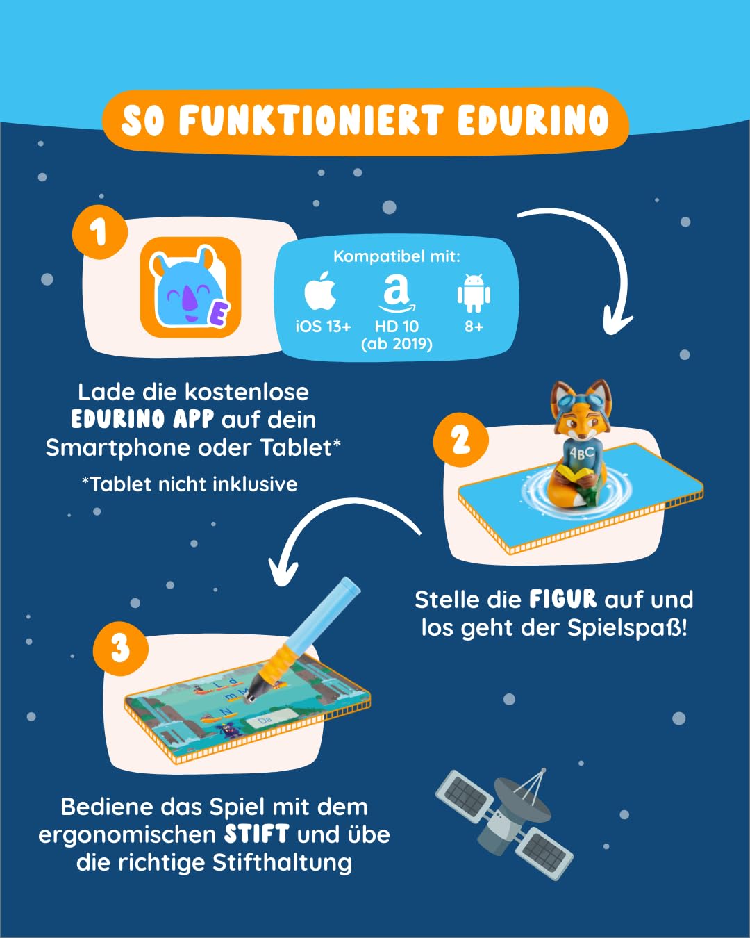 ["✔️ PLAYFUL LEARNING - Whether it's simple words, rhymes, or writing motor skills - With the EDURINO Mika Starter Set, children can playfully & quickly learn the basic skills of reading & writing.","✔️ COMPREHENSIVE SET - Thanks to the practical Starter Set consisting of the character "Mika," an ergonomically shaped stylus & the EDURINO App, you can start right away & have fun.","✔️ MAXIMUM LEARNING SUCCESS - Through close collaboration with educators and experts, we at EDURINO develop playful learning content to make screen time meaningful.","✔️ HIGHEST COMPATIBILITY - Our EDURINO App for digital learning games supports all common operating systems. For the best gaming experience, we recommend iOS 15+ (min. 3GB RAM), Android 10+ (min. 3GB RAM), and Amazon Fire Tablets HD 10 (2021), HD 10+ (2021), and Fire Max 11 (2023).","✔️ IDEAL FOR KIDS AGES 4+ - The innovative & digital learning games are ideal for girls & boys aged 4 and up - Exciting missions encourage independent & effective learning of letters & syllables."]