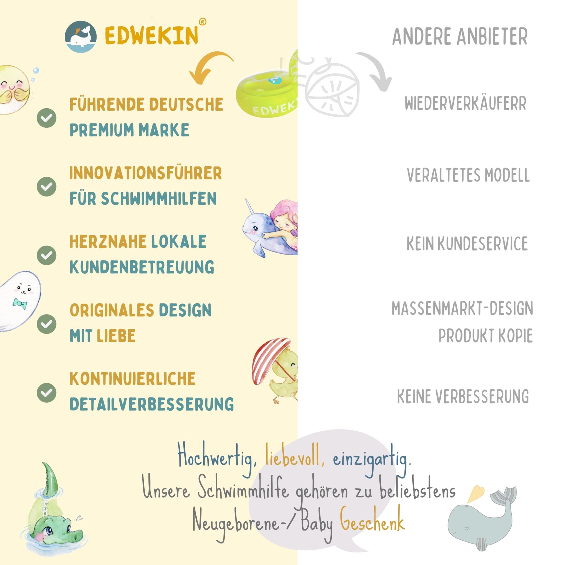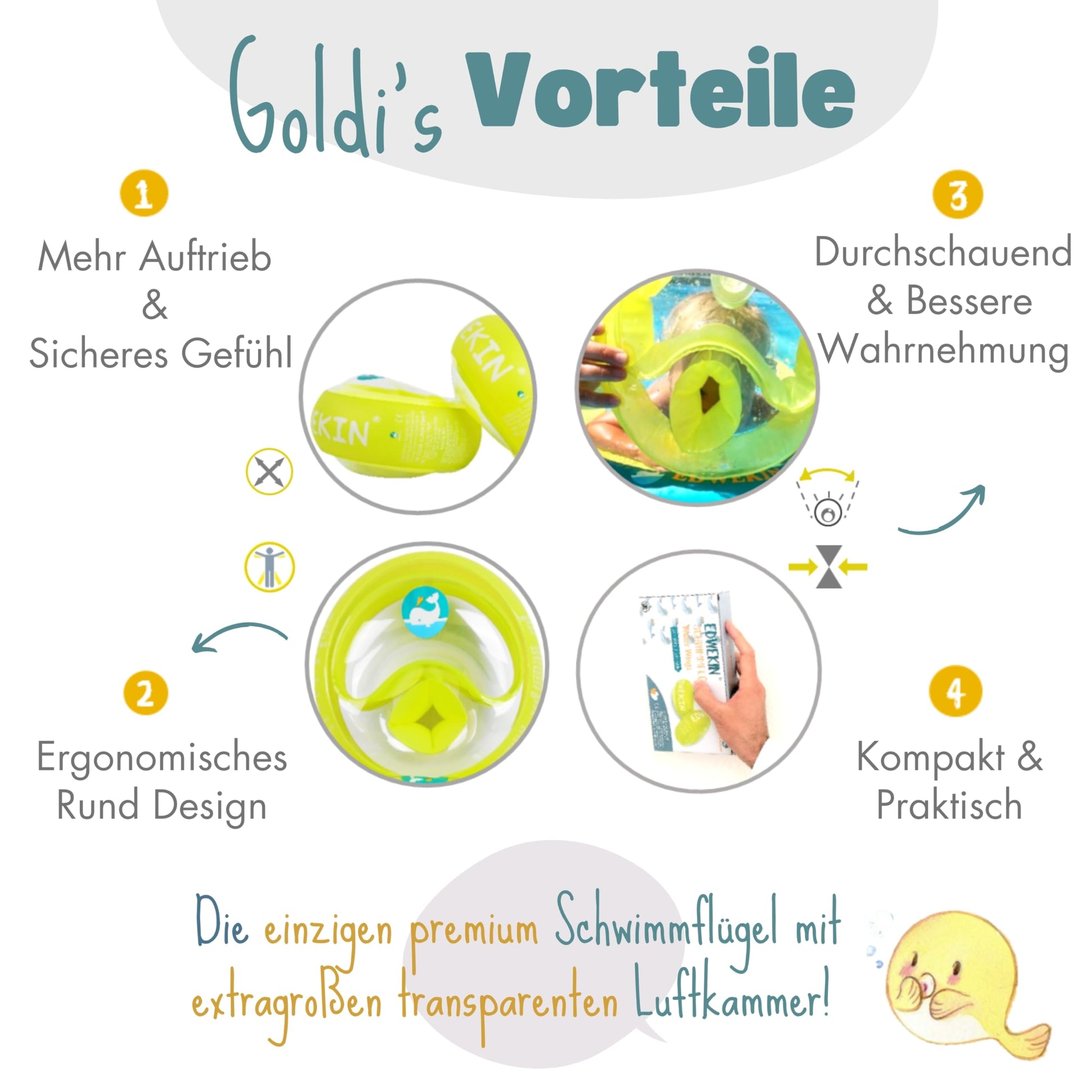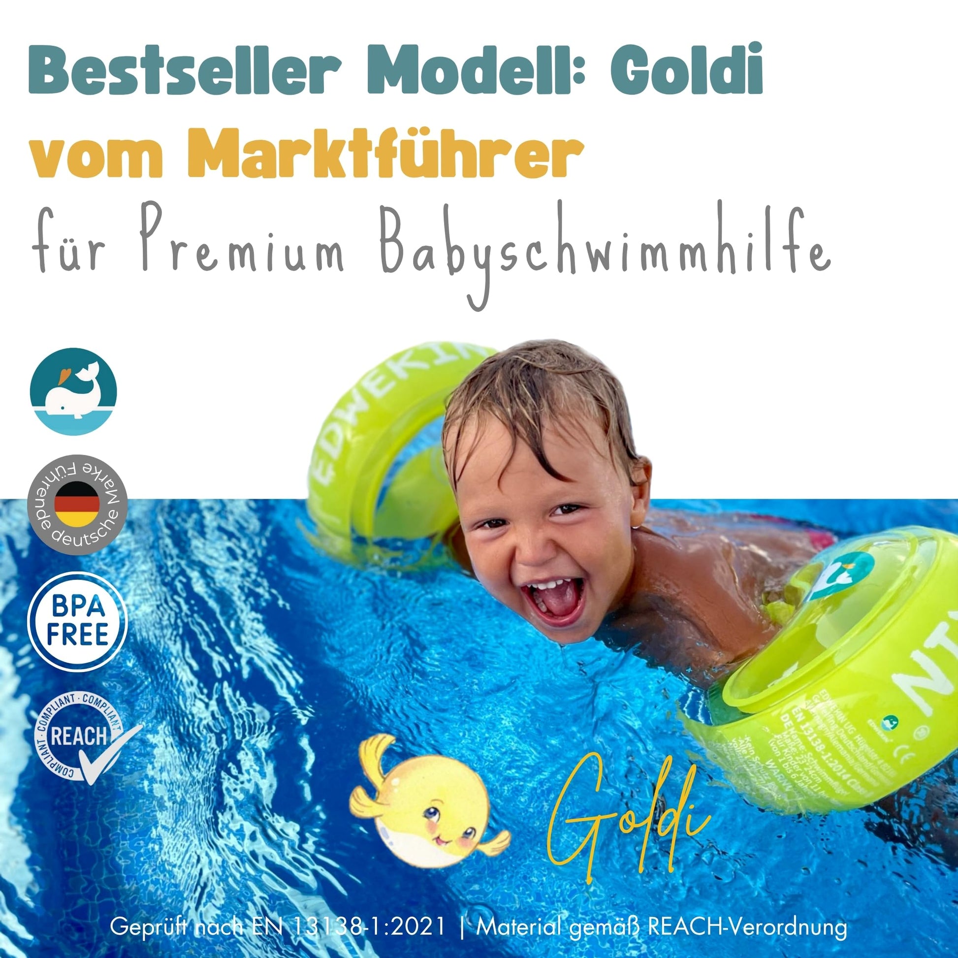 ["✔ GERMAN LEADING BRAND: EDWEKIN, known as an innovation leader, develops high-quality premium baby swimming aids in close collaboration with engineers and artists, constantly improved through continuous feedback from parents.","✔ CERTIFIED SAFETY: The Goldi armbands from EDWEKIN comply with the latest standard DIN EN 13138-1:2021 and are certified as personal protective equipment according to the EU type examination certificate (Regulation EU 2016/425).","✔ INNOVATIVE & STYLISH: Our armbands provide perfect buoyancy and stability through extra-large air chambers, ergonomic fit for more freedom of movement, an unobstructed field of vision thanks to transparent design, easy portability, and striking neon yellow for maximum safety and style.","✔ PREMIUM QUALITY & HIGHEST COMFORT: Goldi armbands are made of reinforced, BPA-free, and environmentally friendly material according to the REACH regulation, making them safe, durable, and comfortable to wear. Two independently functioning double air chambers with optimized volume ratio guarantee maximum comfort.","✔ PURE SWIMMING PLEASURE & LEARNING MOTIVATION: EDWEKIN armbands not only promote safety but also confidence and joy in learning to swim. Ideal for use in the pool, swimming pool, outdoor pool, as well as at the lake and sea, and very popular as a cherished gift for children."]