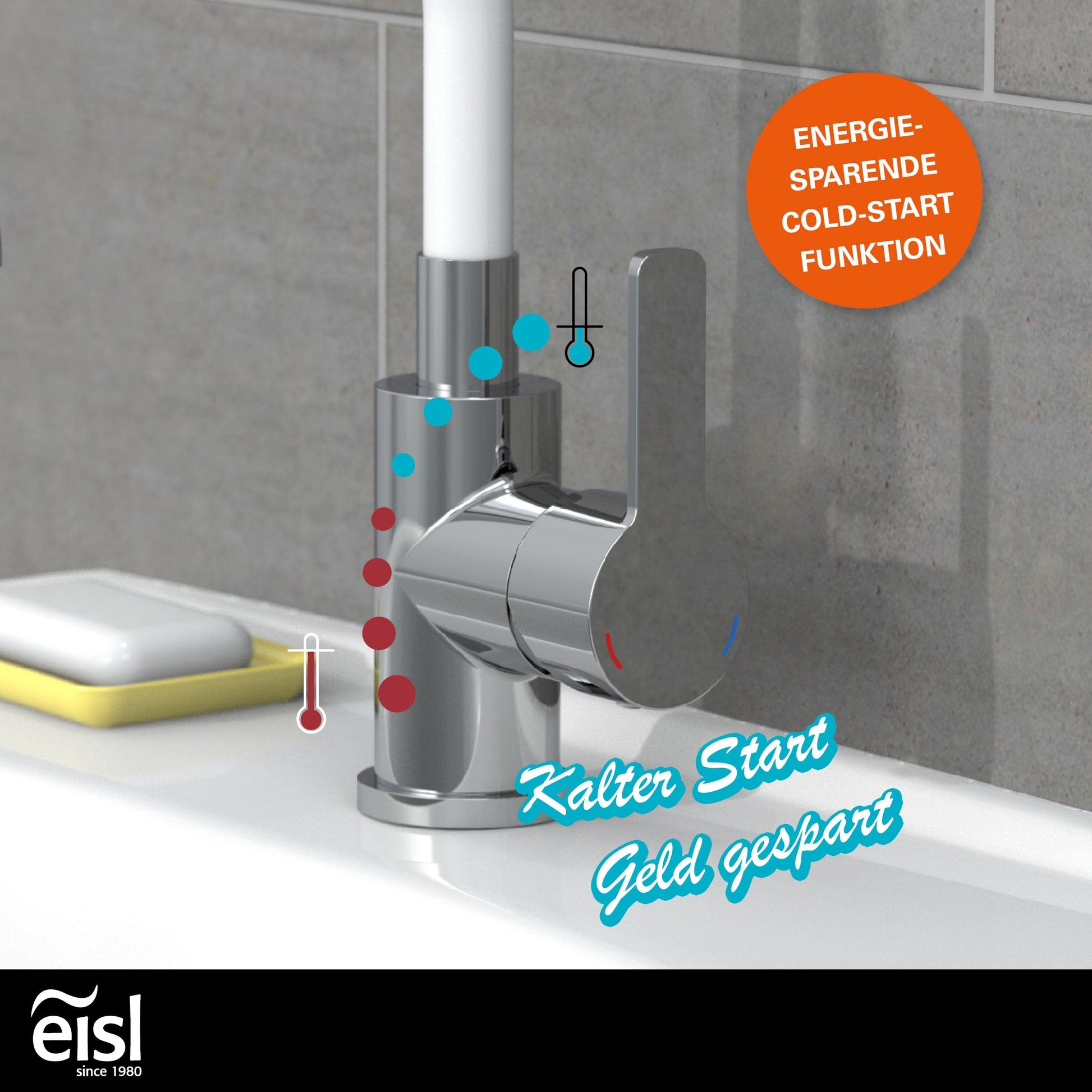 πππππππ: Two-stage lever operation on the faucet regulates the water flow. Your small contribution to the environment.",