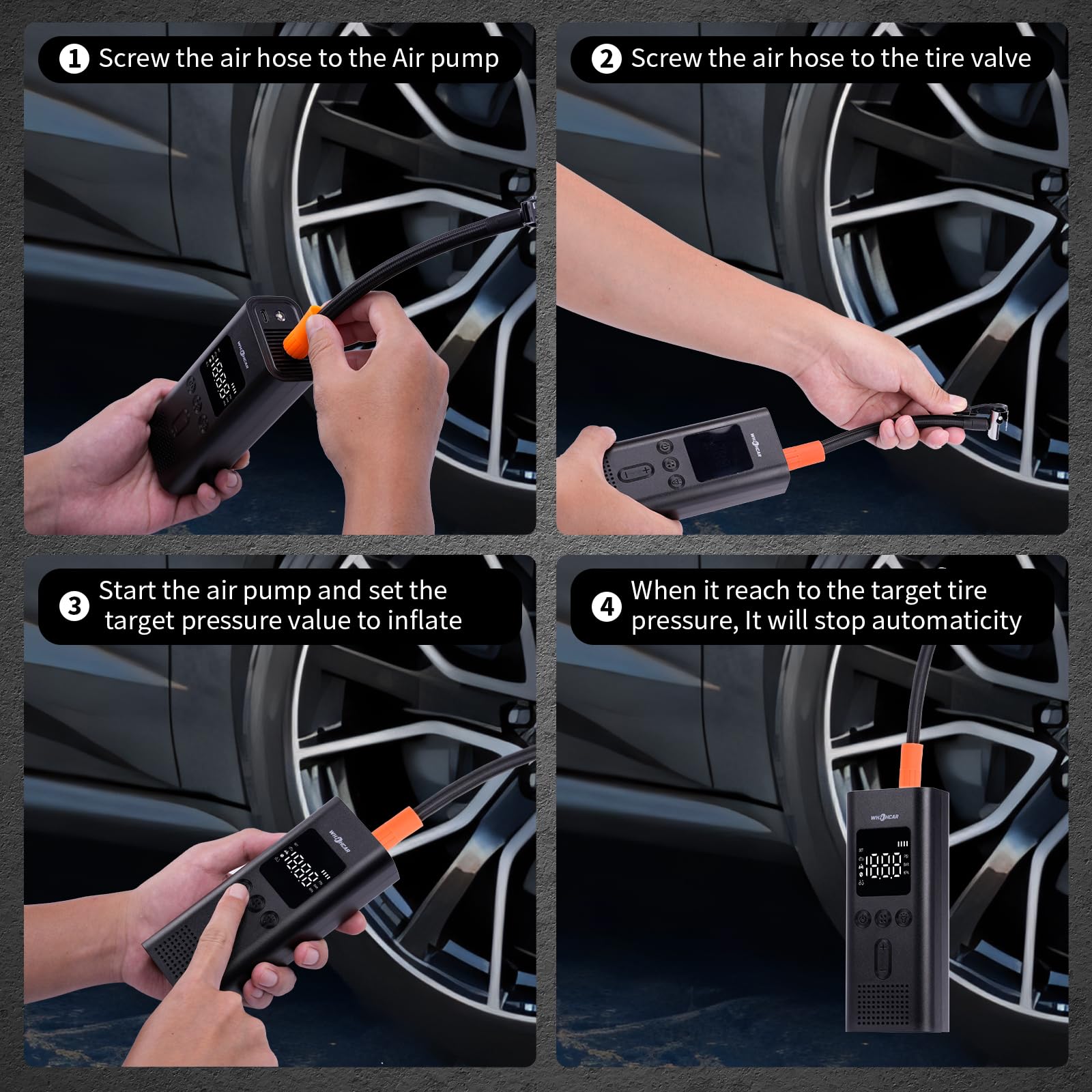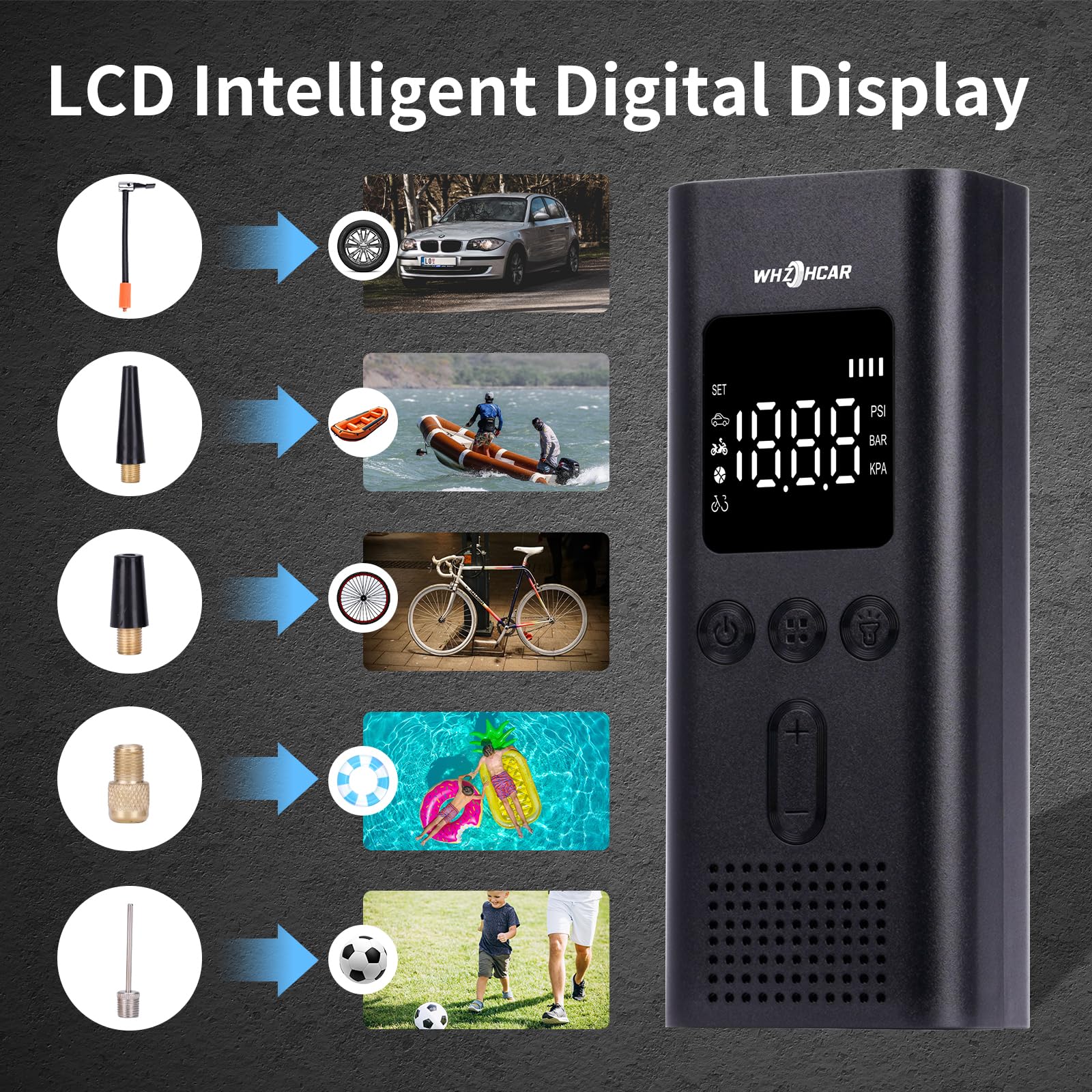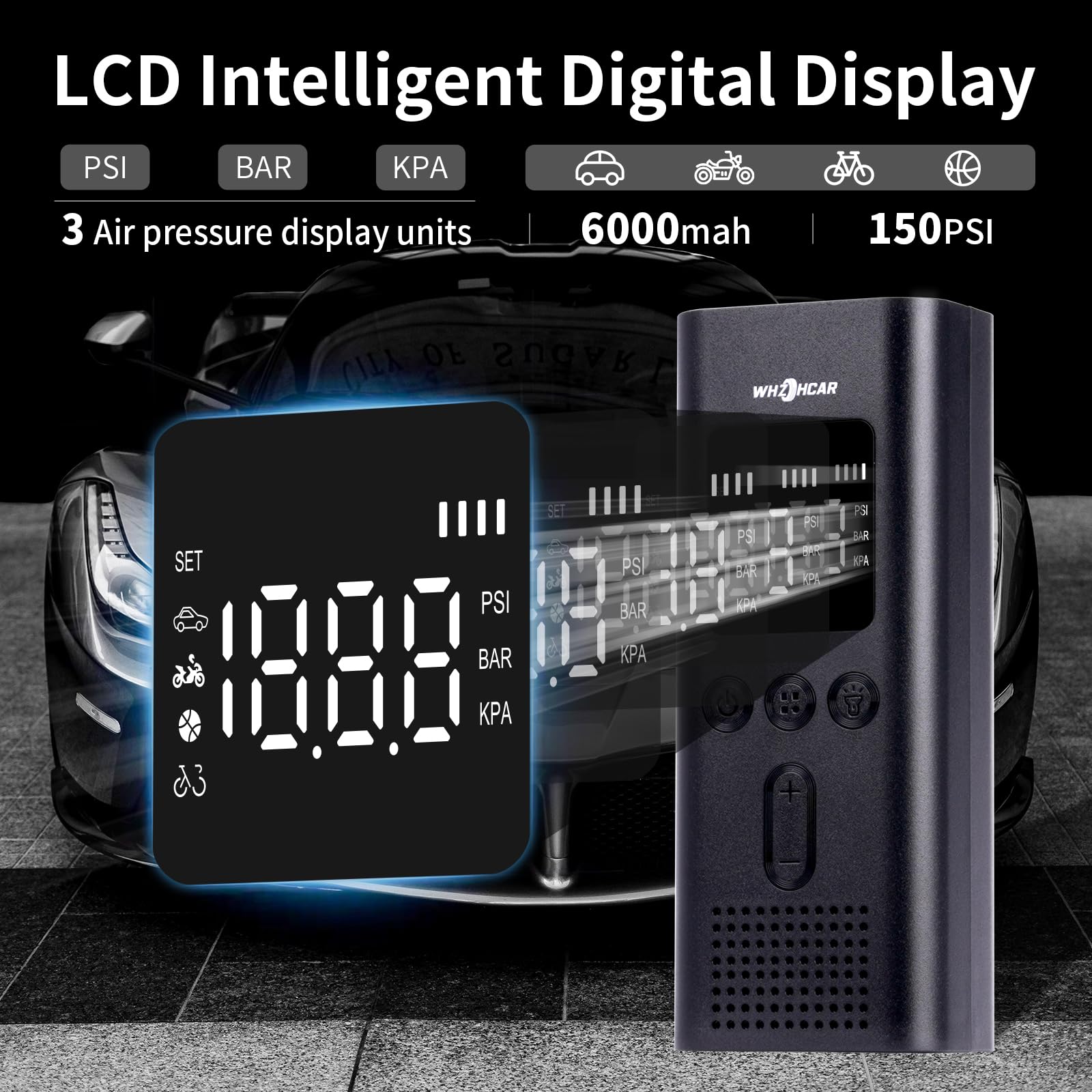 ["Large Capacity Battery: WHZOHCAR Electric Bike Pump with a large 6000mAh battery. Easy charging via the convenient Type-C interface. So you can inflate car tires, motorcycle tires, balls, and inflatable toys in minutes. It efficiently and quickly inflates, saving you time and effort","Fast & Safe Inflation: Portable electronic air pump offers a maximum pressure of 150 PSI, inflating car tires in minutes. When inflation is complete, it automatically stops. This electric portable air pump has a selection of 3 pressure units: PSI, BAR, KPA. You can switch modes by pressing the mode button briefly","Air Pressure Measurement and Presetting: The air pump supports the functions of air pressure measurement and presetting; you can freely set the pressure value according to your needs, and when the set value is reached, inflation automatically stops. This gives you more security and prevents overinflation","LCD Display with Liquid Crystals: With an LCD liquid crystal screen, after connecting the tire, you can clearly see the remaining tire pressure, the unit for inflation, and the power value. You can check the inflation before inflating, making it the most suitable inflation tool for your daily life","LED Light: It is not only an air pump, the top of the air pump is equipped with LED lights that improve your visibility at night and can also be used as a maintenance light. When the inflator is activated, you can turn on the LED light by briefly pressing the light button","Thoughtful Design: Electric air pump equipped with an internal cooling fan to ensure rapid heat dissipation. The inflation hose is equipped with insulating silicone to prevent burns to the hands. This guarantees safe and reliable operation","Multifunctional: This is a portable electric air pump, small and lightweight with a storage bag. The air pump is quickly and easily equipped with various air pump accessories. Included are an American nozzle, a French nozzle, and a ball air needle, which can inflate cars, motorcycles, V-loosen, inflatable rowing, etc."]