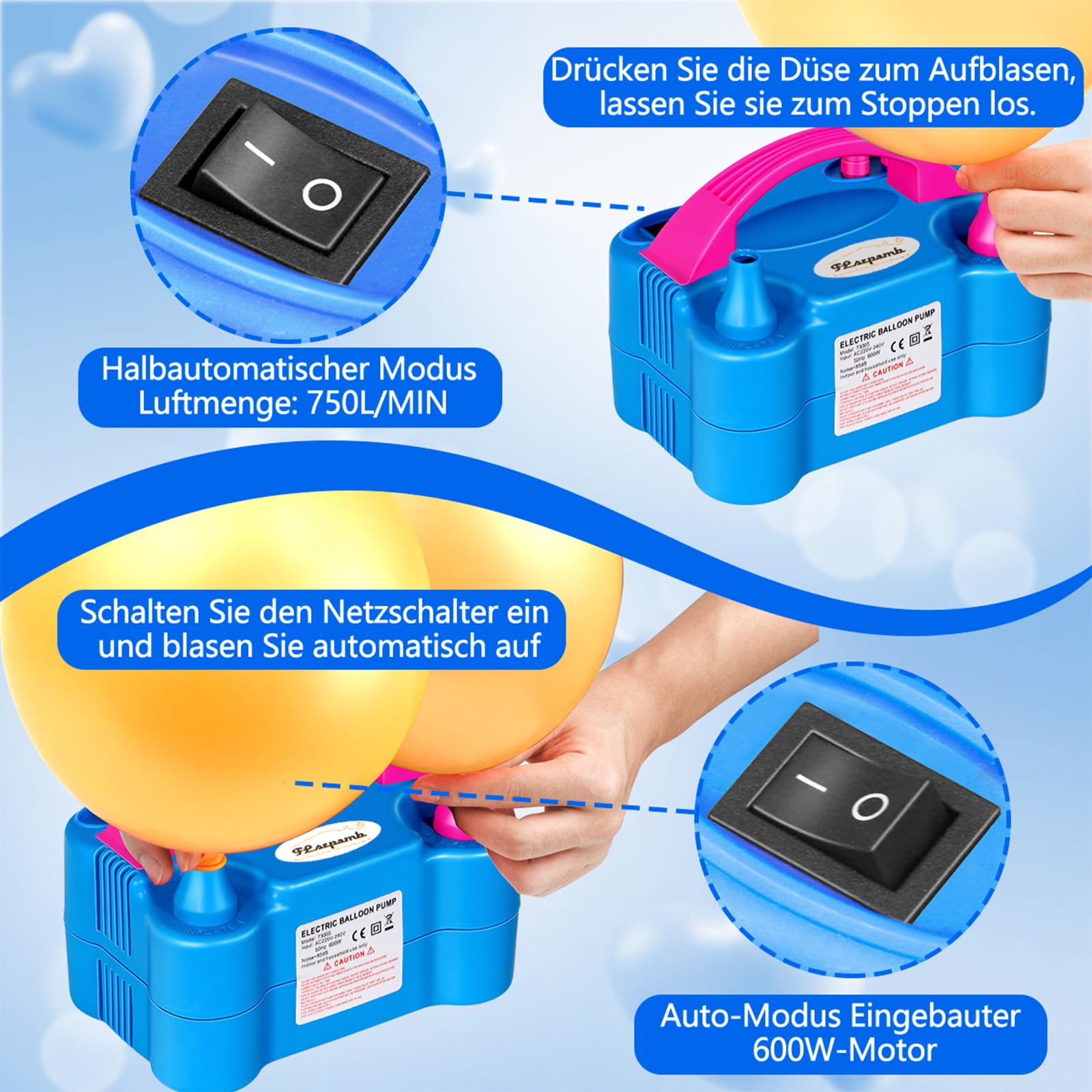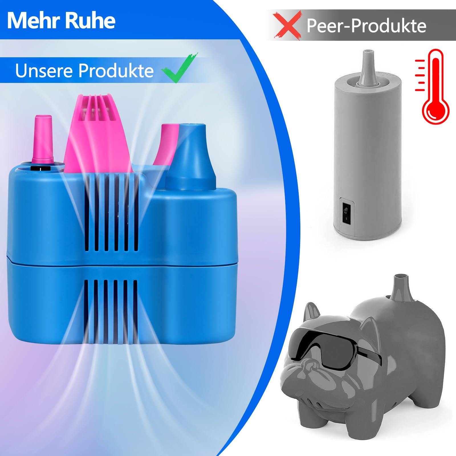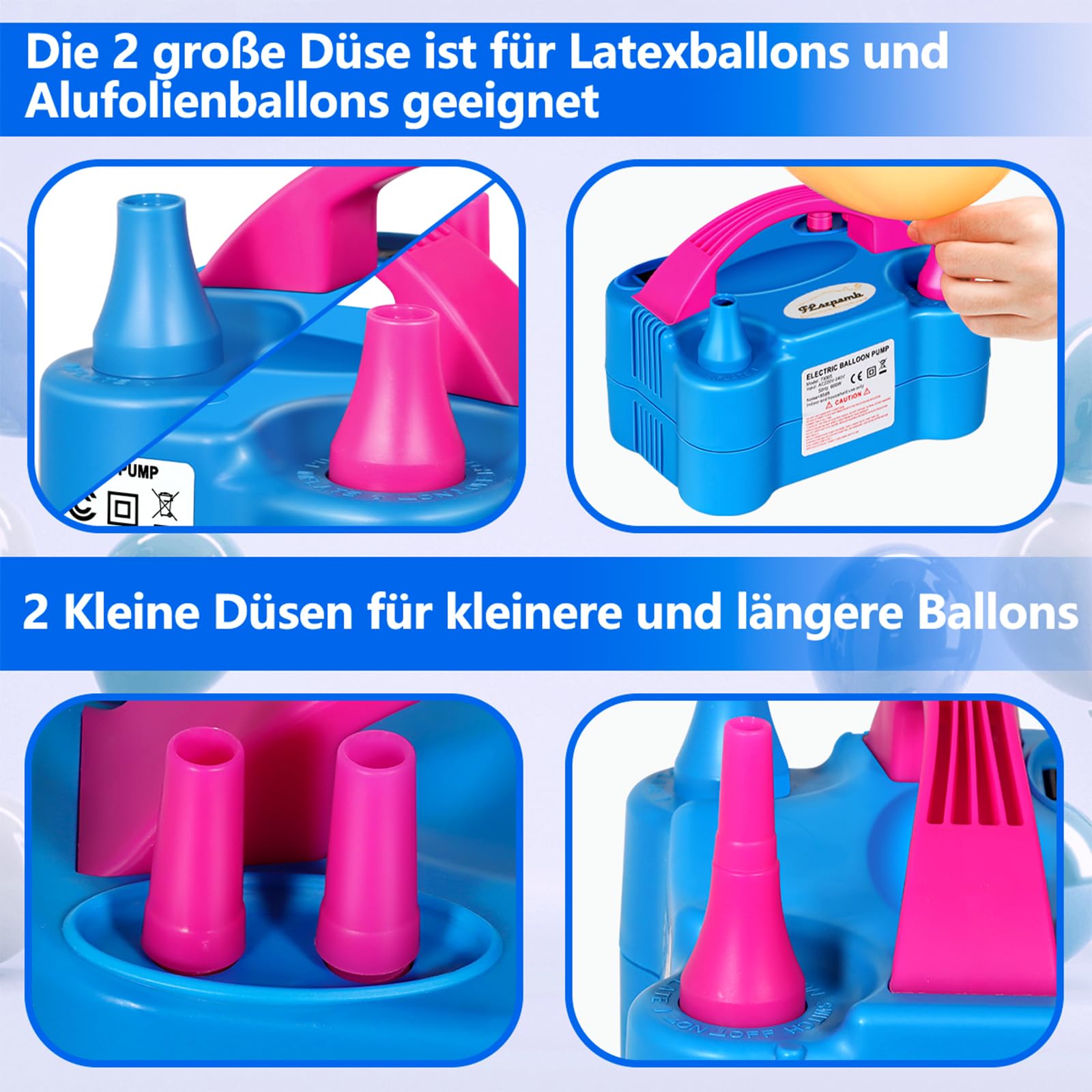 ["Efficient Work"] The balloon pump utilizes the 2+2 nozzle method, with 2 extended nozzles to handle small balloons and effectively reduce air flow. 2 large nozzles with strong air output are designed for large balloons, generating quicker inflation. This electric air pump with 2 nozzles is suitable for all types of latex or decorative balloons.