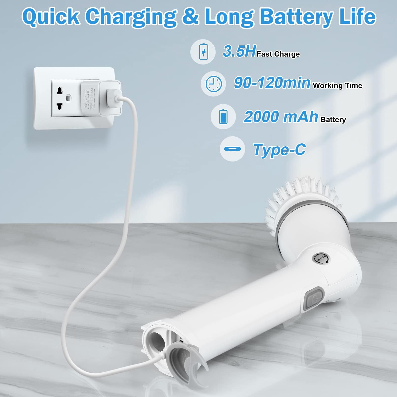 "✅【Cordless Portable and 2000mAh Battery Powered】With the portable electric cleaning brush, you can get rid of annoying cords and effortlessly clean every area. The electric shower scrubber uses a Type-C charging cable. Powered by a 3.7V 2000mAh rechargeable premium lithium-ion battery, the shower scrubber can achieve a long operating time. After a 3-hour charge, it can efficiently work for 60 minutes. It's enough for daily cleaning.