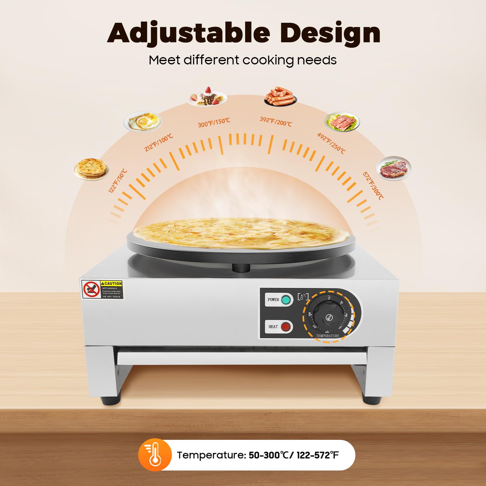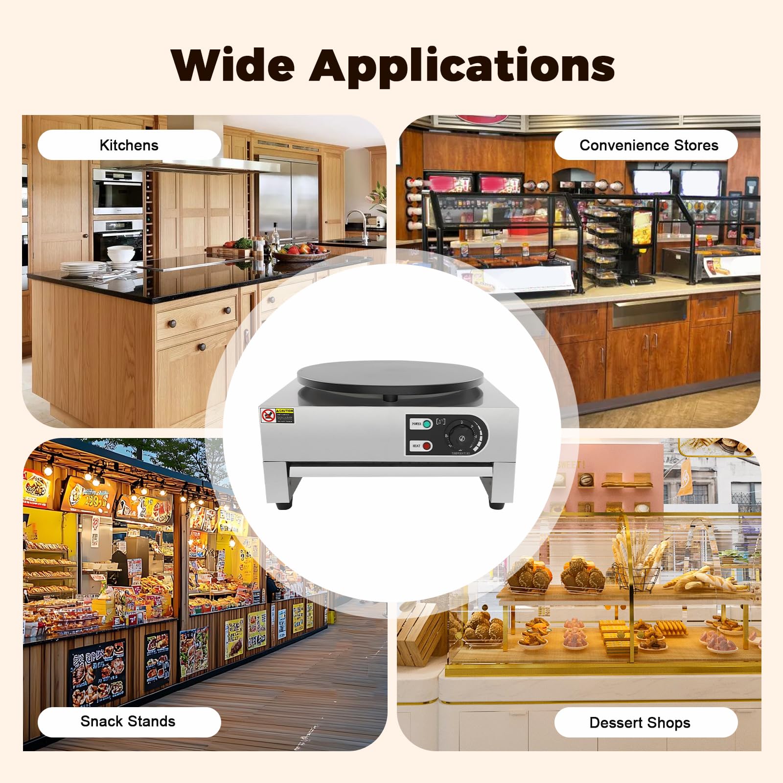 ["👍 Brand new model of crepe and pancake maker machine. Shell made of full stainless steel.","👍 It features advantages of attractive appearance, new structure, small volume, lightweight, convenient operation, and quick and even heat-up.","👍 Equipped with simple and robust technology, this machine is easy to control and has a long lifespan. Precise temperature control allows you to cook perfect and delicious crepes for your guests, family, and friends.","👍 Temperature adjustable from 50-300°F (122-572°F)","👍 Suitable for personal use. Ideal for family gatherings, clubs, and home parties. Great companion for restaurants, snack bars, cafes, etc."]