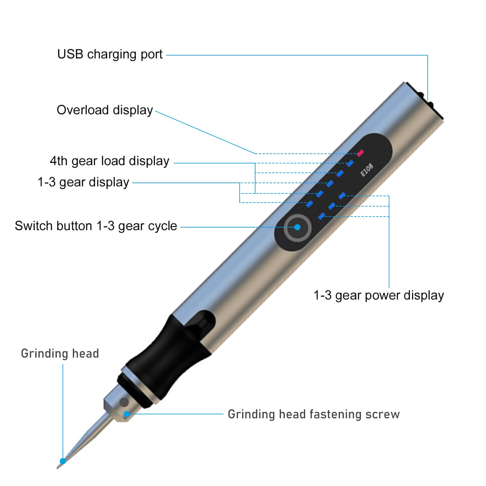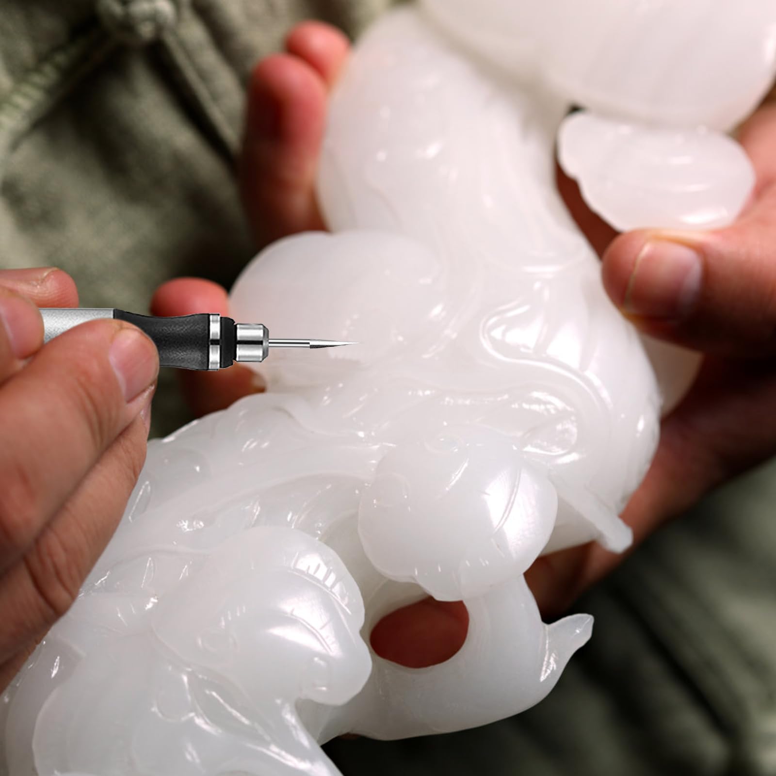 ["【USB wireless engraving tool】This electric engraving pen is equipped with a lithium battery and rechargeable via the USB interface. The engraving device set usage lasts up to 60 minutes on idle when fully charged. Easy to complete a better engraved craftsmanship.","【Multifunctional wood engraving kit】This electric engraving pen can be used as an electric engraving machine or as an engraving device set to personalize or decorate almost any surface in seconds, such as metal, plastic, glass, ceramic, and more.","【Safe and comfortable design】 The lightweight and compact design of the electric engraving pen allows for comfortable use for precise engraving performance from fine lines to deep grooves. The ergonomic handle provides additional comfort and stable control.","【Adjustable speed】The electric engraving pen features an adjustable speed with 3 gears (5000 RPM, 10000 RPM, 18000 RPM), suitable for different occasions. You can adjust the working speed for different purposes. You can safely polish nails at the lowest speed or engrave metal at the highest speed.","【Instructions】Press the power switch of the electric engraving pen the first time to enter working mode 1. Press lightly on the power switch of the engraving device set the second time to enter working mode 2. Press lightly on the power switch of the electric engraving pen the third time to enter working mode 3. Press lightly on the power switch of the electric engraving pen the fourth time to enter the shutdown mode."]