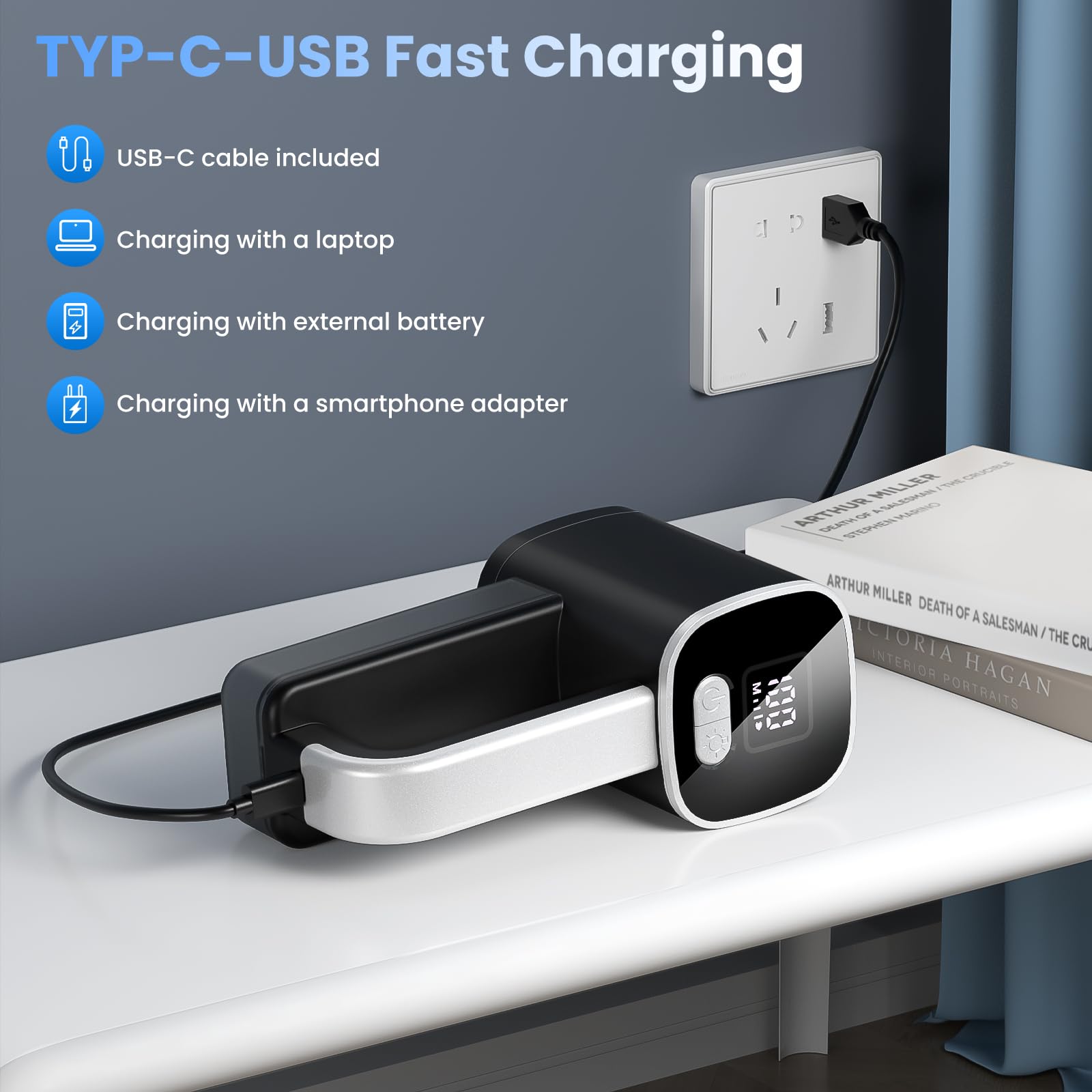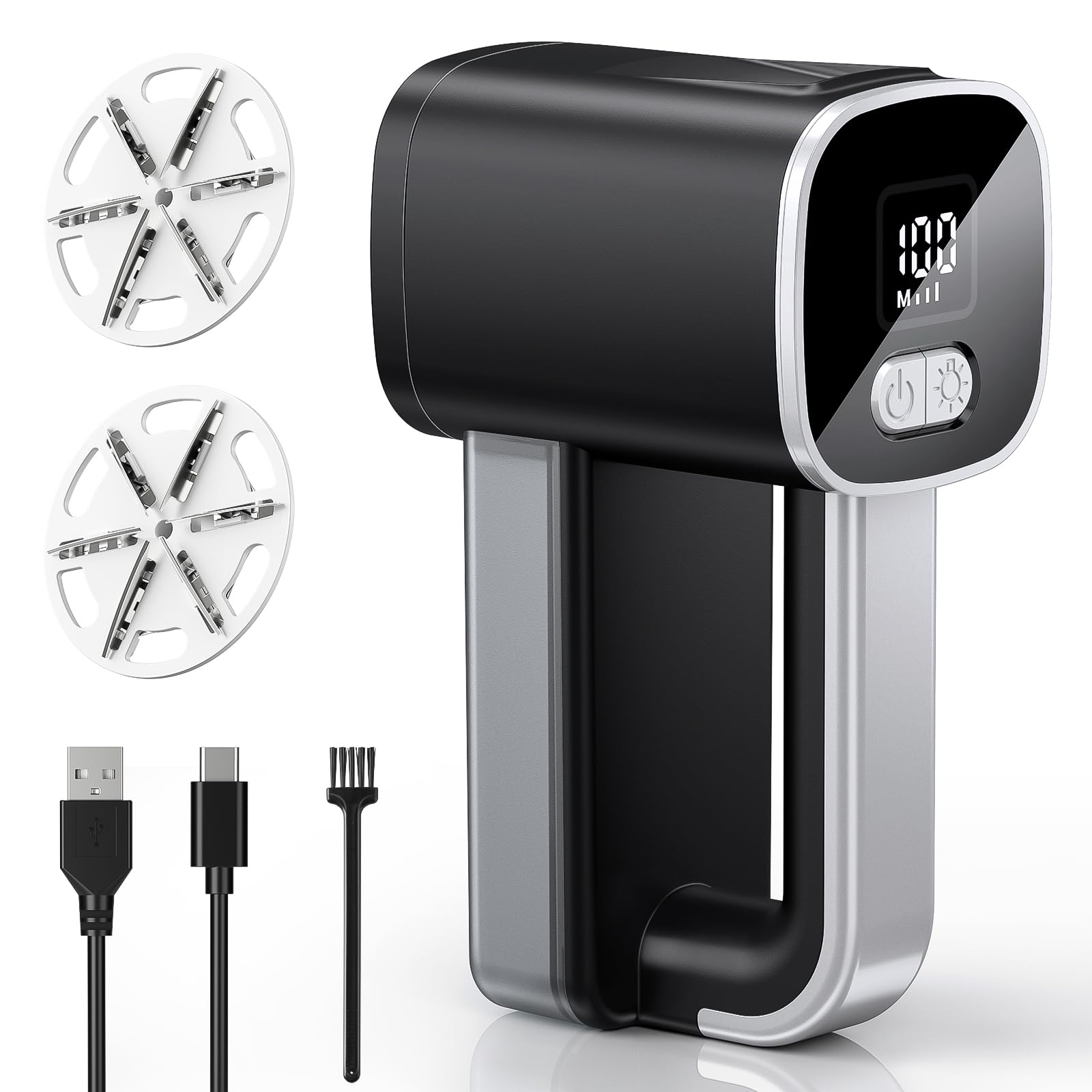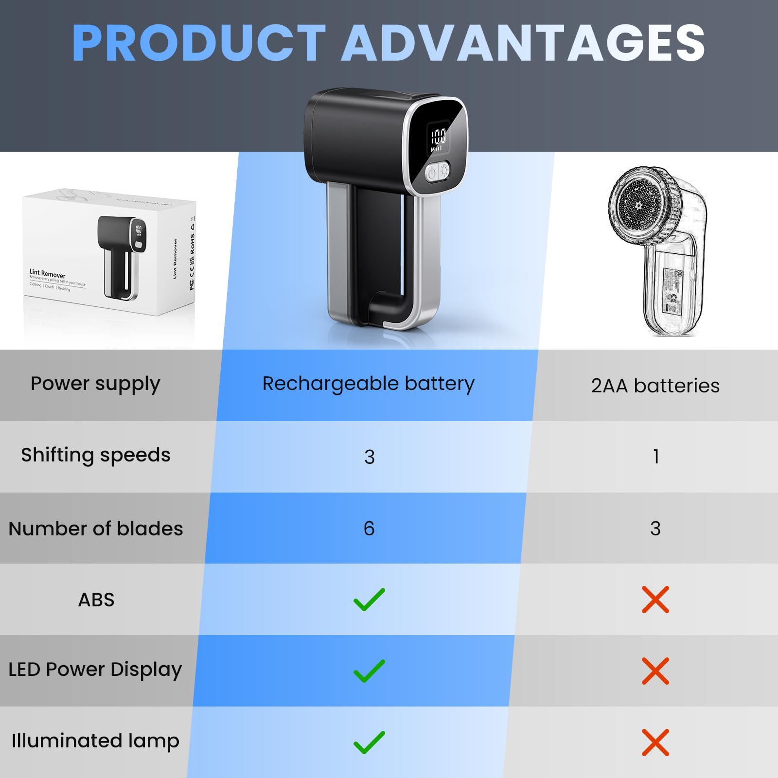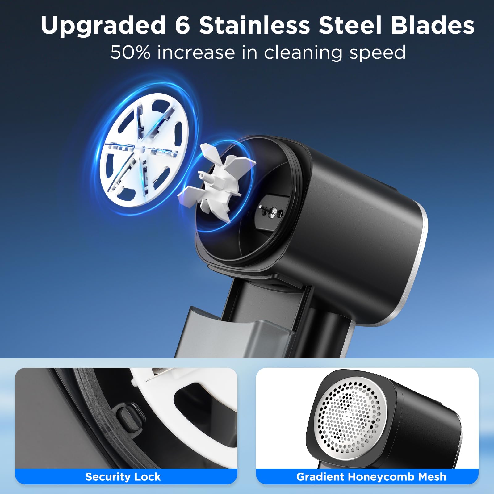 ["⚡【Fast Charging & Long Battery Life】Lint remover rechargeable with built-in 2000mAh battery, with the latest Type-C quick charge port, it only takes 2 hours to fully charge, and the usage time is up to 120 - 180 minutes","🌠【Adjustable Speed & High Efficiency】Electric lint remover consists of 6 stainless steel precision blades, 2 spare shaving blades, you can choose 3 speeds for different types of fabrics such as sofas, clothes, blankets, curtains and more. Thickened stainless steel mesh fabric protects clothing from cuts and scratches. Powerful suction removes lint easily and safely from textiles","💡【LED Digital Display & LED Lighting】Our electric lint remover is equipped with an LCD display that clearly shows the current battery level and speed. It is both intuitive and easy to use. Thanks to the illuminated lamp, you can also work better at night and remove lint","🪐【Ergonomic & Safe Design】The electric lint remover is ergonomically designed to allow for easy operation and effortless operation over a longer period of time, and is lightweight, making it easy to carry around the house or while traveling. Thanks to the safety lock, the device automatically stops when the blade cover is released or opened","✅【Large Container and Brushes】Electric lint remover The blade rotates with strong suction power and pulls all lint into the collection container for quick and easy cleaning. Equipped with a small brush to easily sweep away lint residues."]