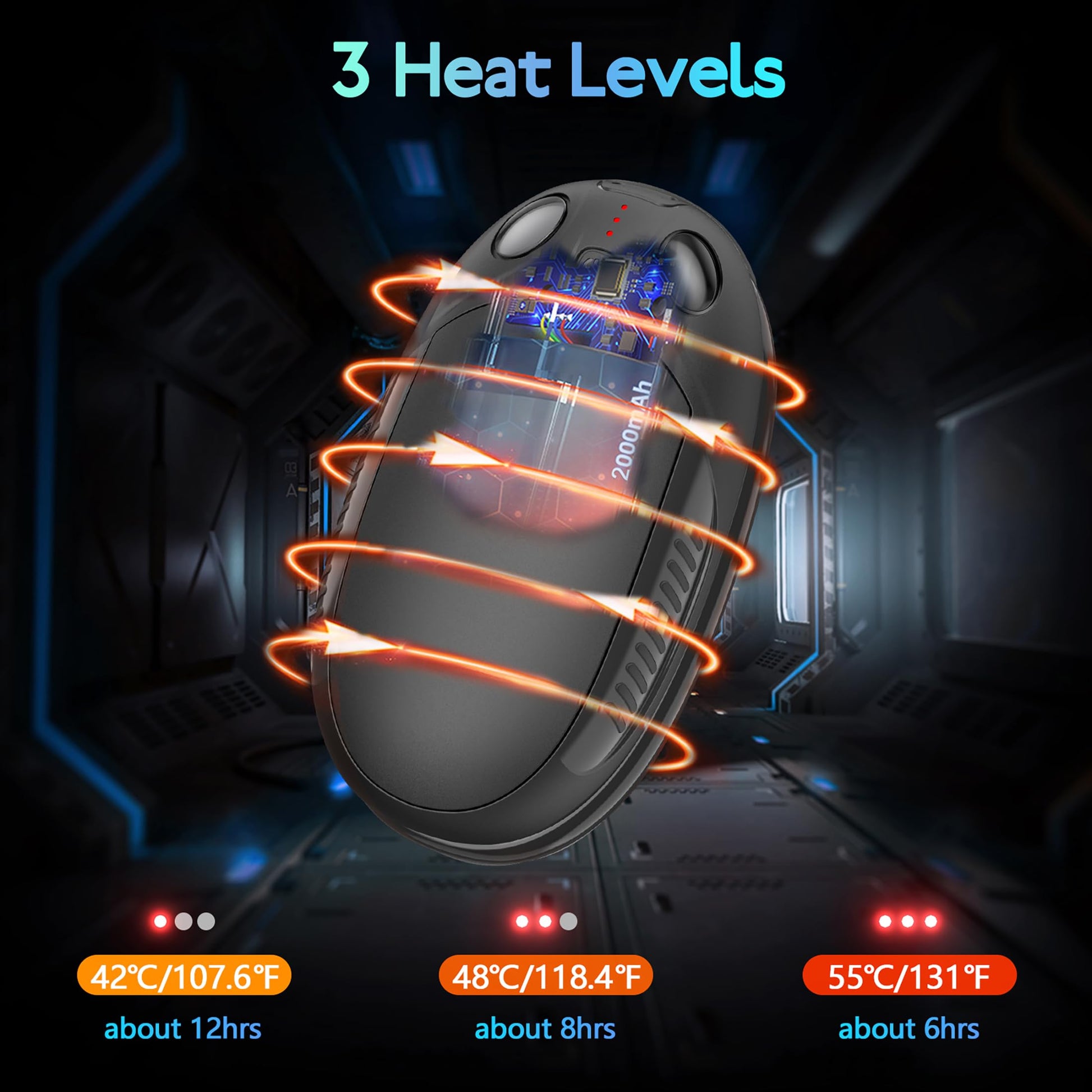 🔥【Unique Split Design】: The hand warmer features a dual-sided heating function that quickly releases heat and can warm both sides in 3S to warm your hands. Split buckle design, easy to use, can be split into 2 hand warmers with 2000 mAh. Outer beetle design, compact and smooth structure, pleasant touch.