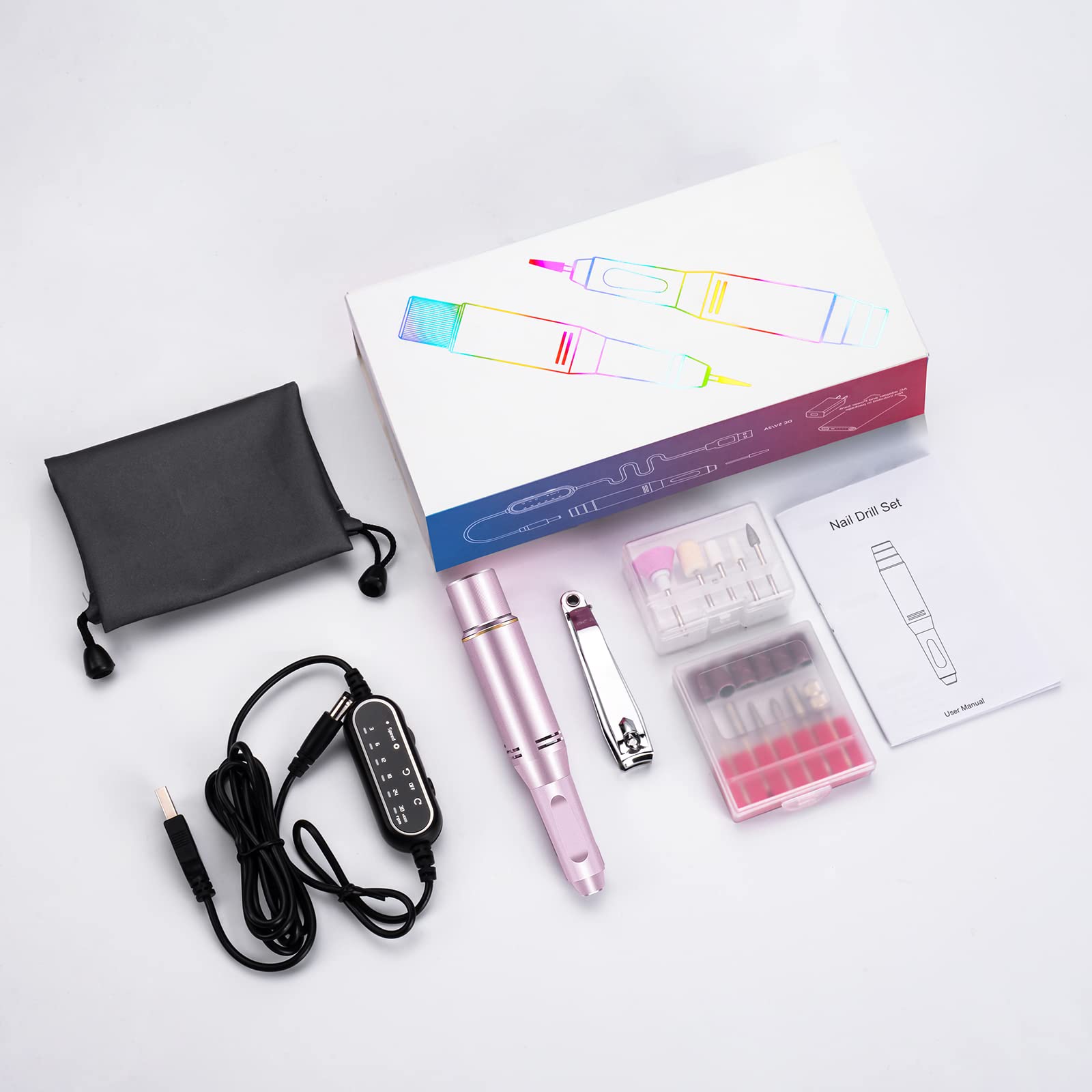 ["Professional Manicure Set - The electric nail file comes with 11 drill heads, 30 sanding bands, 1 nail clipper, 1 storage bag, a USB charging cable, and a pack of replacement sanding bands. This provides users with a variety of options and tools to meet different nail care needs.","Adjustable Speed - The speed of the Electric Nail Drill Manicure Pedicure Set is adjustable. And the forward and reverse rotation direction can be selected according to your habits. Two rotation directions allow for use by right and left-handed users. Our grinding head has strong locking force and the speed per minute is 30,000 U/min.","Stable, Low Vibration, Low Noise, Not Hot - The high technology high-speed bearings and enhanced internal motor ensure that the noise level during nail care remains below 30 decibels and vibration is minimal. This ensures a more comfortable use, allowing users to easily perform nail care in a quiet environment.","Stylish, Lightweight, Portable - The housing is made of high-quality aluminum, which not only helps the product stay cool during use, but also gives the product a high-quality appearance. The pen-shaped design is not only stylish, but also provides a comfortable grip and is easy to carry to meet your nail care needs anytime, anywhere.","Perfect Gift - This 12 in 1 electric manicure set comes in an exquisite gift box set. Suitable for removing acrylic nails, gel, and natural nails, this is the ideal tool for nail care at home or in the salon. Whether it's a birthday, Valentine's Day, or Christmas, this electric nail file is the perfect beauty gift for friends and family interested in nail art."]