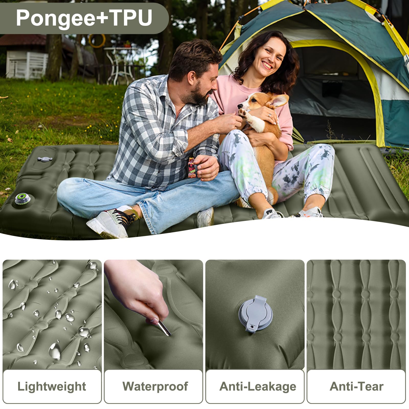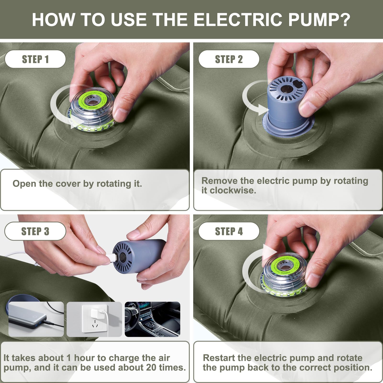 ["Self-Inflating Electric Insulated Mattress: The upgraded mattress features a powerful internal electric pump. With a simple push of a button, the quick automatic inflation starts. With a light touch of the button, the mattress can be fully inflated in 40 to 50 seconds. Without manual or foot-operated inflation, this provides endless convenience for your camping experience.","More Comfortable Self-Inflating Air Mattress: It has a 12-centimeter thick design and is equipped with a comfortable pillow that provides outstanding support and comfort. With a width of 68 centimeters, it offers you enough space to enjoy a truly peaceful sleep and enhance your camping experience.","Ultralight and Portable: The electric inflatable mattress weighs only 1.1 kilograms and can be folded into a small bag measuring 15 * 15 * 28 centimeters, making it easier to carry and store. The self-inflating pillow can be easily stored in a backpack, making it an ideal choice for backpacking and camping. After inflation, you will get a mattress measuring 200 * 68 * 12 centimeters to enjoy a spacious and comfortable sleep.","Strong and Tear-Resistant: The self-inflating camping mattress is made of durable pongee with a waterproof TPU coating and has excellent tear resistance. It can withstand a weight of up to 500 kilograms. Therefore, it is ideal for camping, hiking, backpacking, and other outdoor activities, ensuring the safety and durability of the air mattress.","Quick Inflation and Deflation: The mattress is equipped with an inflation pump and a deflation valve at various positions to prevent air loss and enable faster inflation and deflation. The built-in rechargeable electric pump can be used 20 times with a full charge. It is ideal for camping, traveling, and outdoor activities, enhancing your outdoor experience."]