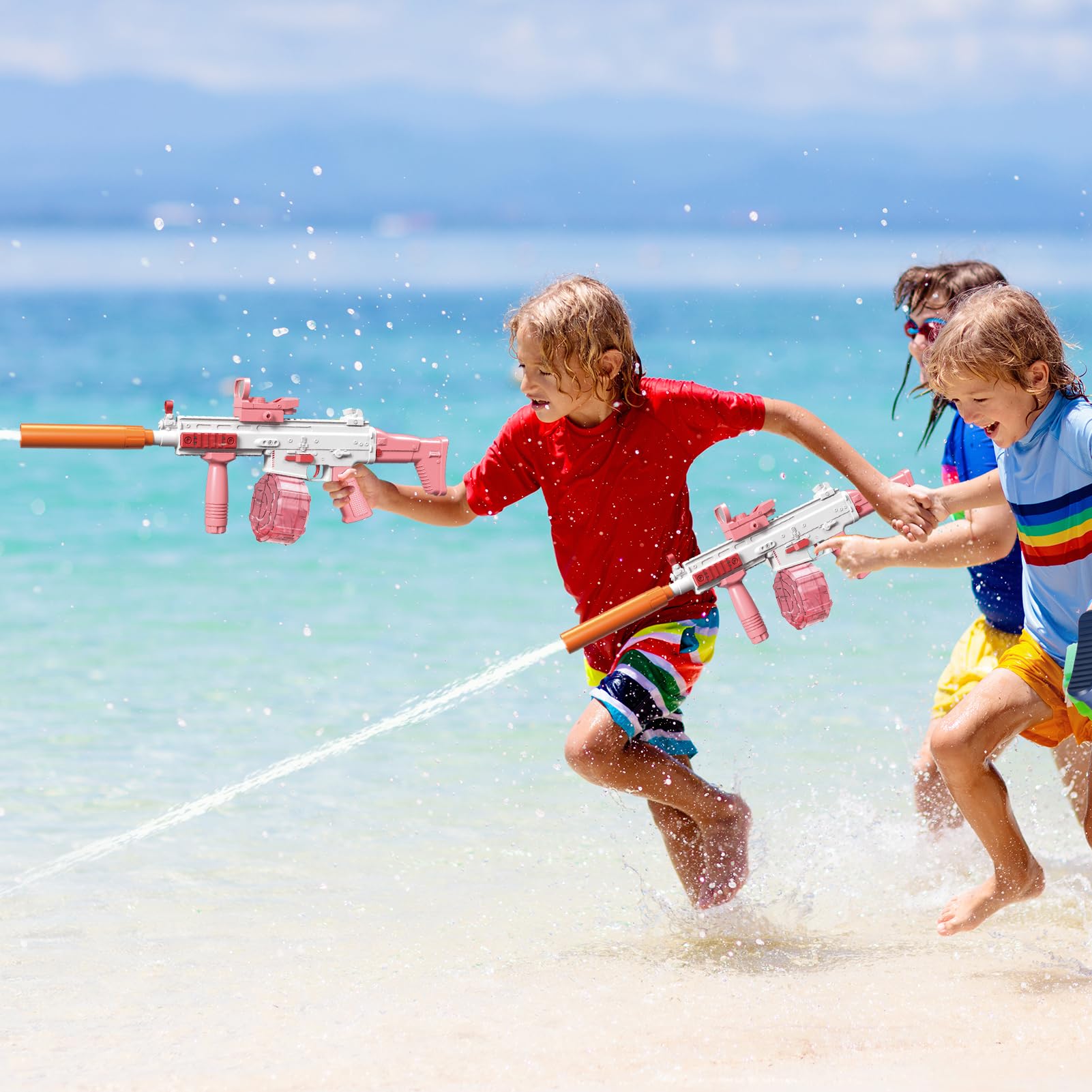["Water gun for kids and adults: The electric water gun replaces the old manual pump mode and activates the super water column with a high-speed motor at the push of a button, taking our water battle parties to a new level.","Electric Water Gun Very Strong: This water gun has two water spray modes. Press the trigger once for a single short burst of water; press and hold the trigger for a long continuous stream of water. It has a range of 8-10m.","Excellent Detail Design: The electric water gun is designed with a built-in water tank that can be instantly refilled by opening the lid, with a capacity of 500 cc. The water filling port is designed with universal bottle mouth specifications, allowing you to freely expand the water capacity by simply connecting a bottle (bottle not included in the package).","Electric Water Squirt Gun with Rechargeable Battery: Our water gun comes with a rechargeable battery and USB charger. 30-minute life and continuous cycle usage, you can enjoy endless exciting entertainment with friends and kids at the beach, pool, and backyard summer water parties.","Best Summer Water Squirt Gun Gift: The automatic water gun is manufactured to the highest standards of plastic production, made from ABS material, tested for safety and durability, and meets US/EU toy quality standards. Unlike traditional water guns, it will be the most surprising summer water toy for you and your kids!"]