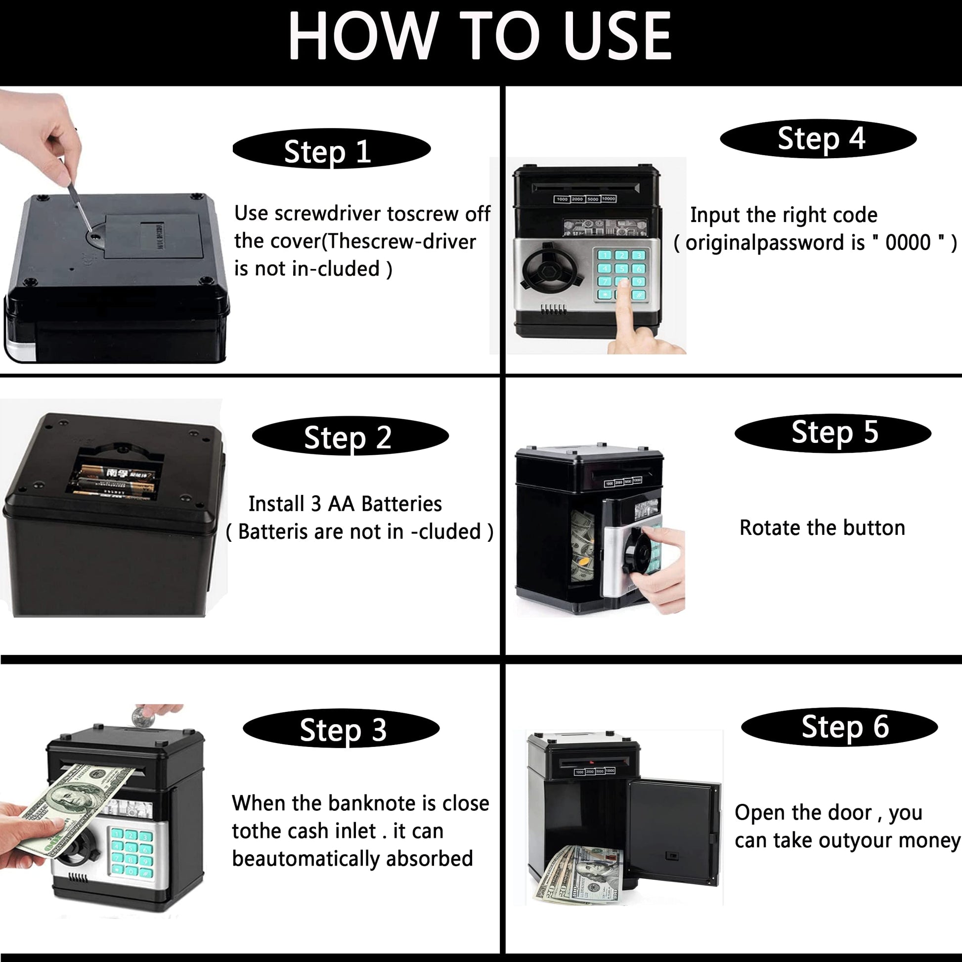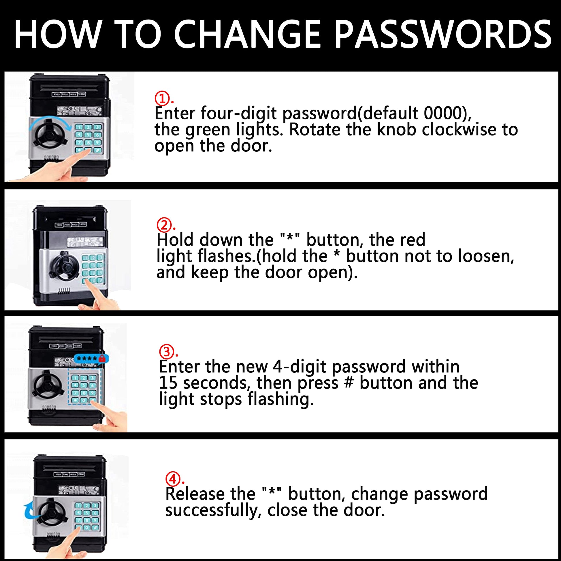"Password safe money box: Enter the 4-digit password (default: 0000, changeable passwords as you like), the green light will illuminate, the cash dispenser can be opened. If you enter the wrong password, the red light will come on and the sound of 'Please try again' will prompt you (you cannot open it if the password is wrong)."