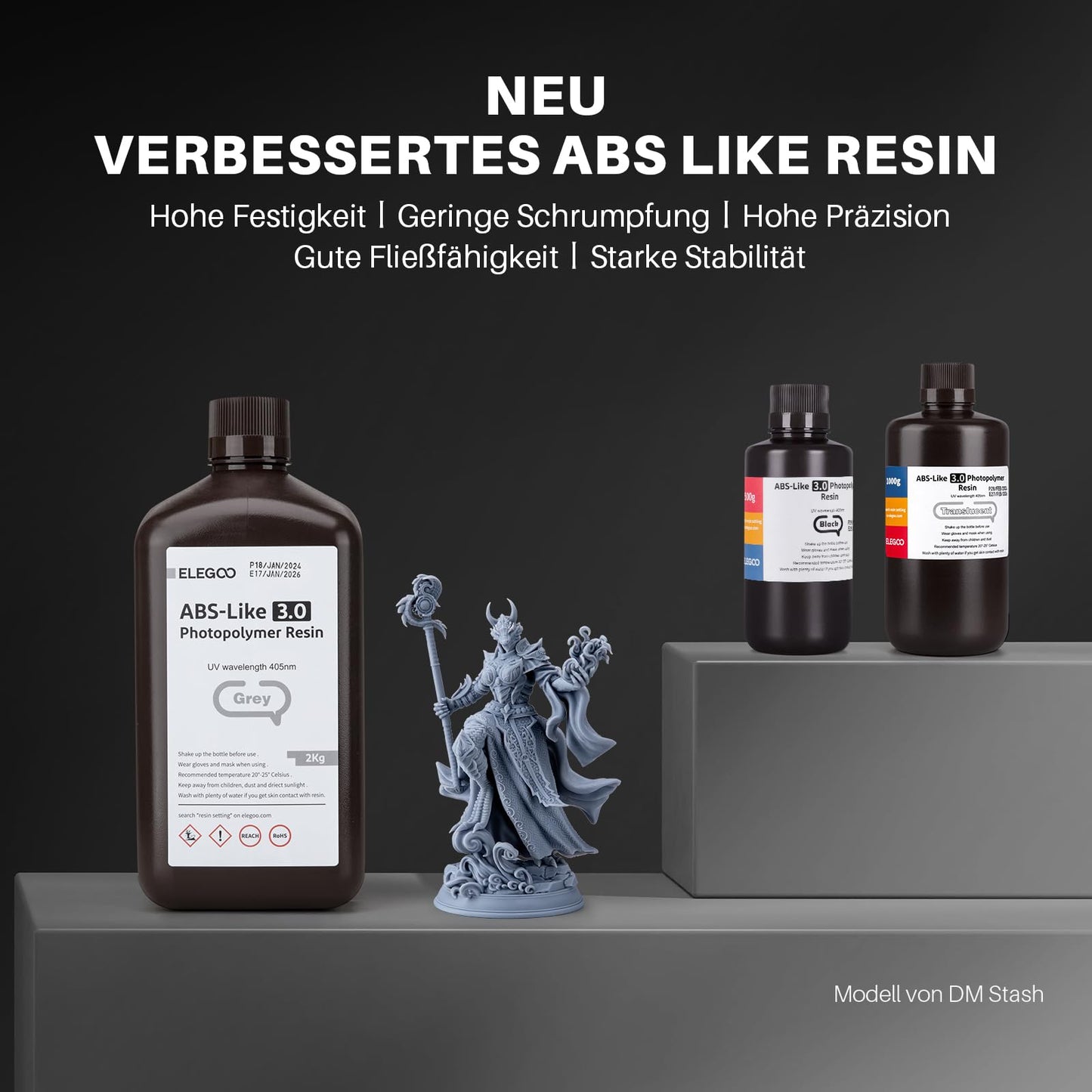 ["High Strength and Toughness - ELEGOO ABS-Like Resin 3.0 is designed for high strength, impact resistance, and toughness. The printed models can withstand drilling holes and specific impacts, retain their structural integrity, and resist deformations, ideal for functional prototypes, mechanical parts, and industrial parts.","High Precision and Low Shrinkage - With lower volume shrinkage, our ABS-Like Resin 3.0 provides high precision in your 3D prints, resulting in intricate model details and smooth surfaces with minimal distortion and precise dimensional stability.","Good Flowability for Fast Prototyping - Our ABS-Like Resin 3.0 is formulated with low viscosity to ensure good flowability for faster curing. Its viscosity is 25-47% lower than ABS-Like 1.0 and ABS-Like 2.0, allowing the resin to quickly flow back into the printing area and easily detach from the release film. This improves print success and shortens the overall printing time.","Strong Stability - Our ABS-Like Resin 3.0 is designed to maintain good stability and ensure that the resin does not delaminate or detach over time. This eliminates the need for manual stirring and ensures uniform color on the entire model surface.","Wide Compatibility - ELEGOO ABS-Like Resin 3.0 is compatible with a variety of MSLA/LCD/DLP 3D printers available on the market with 405nm UV light curing technology and works best with ELEGOO's light-curing 3D printers."]
