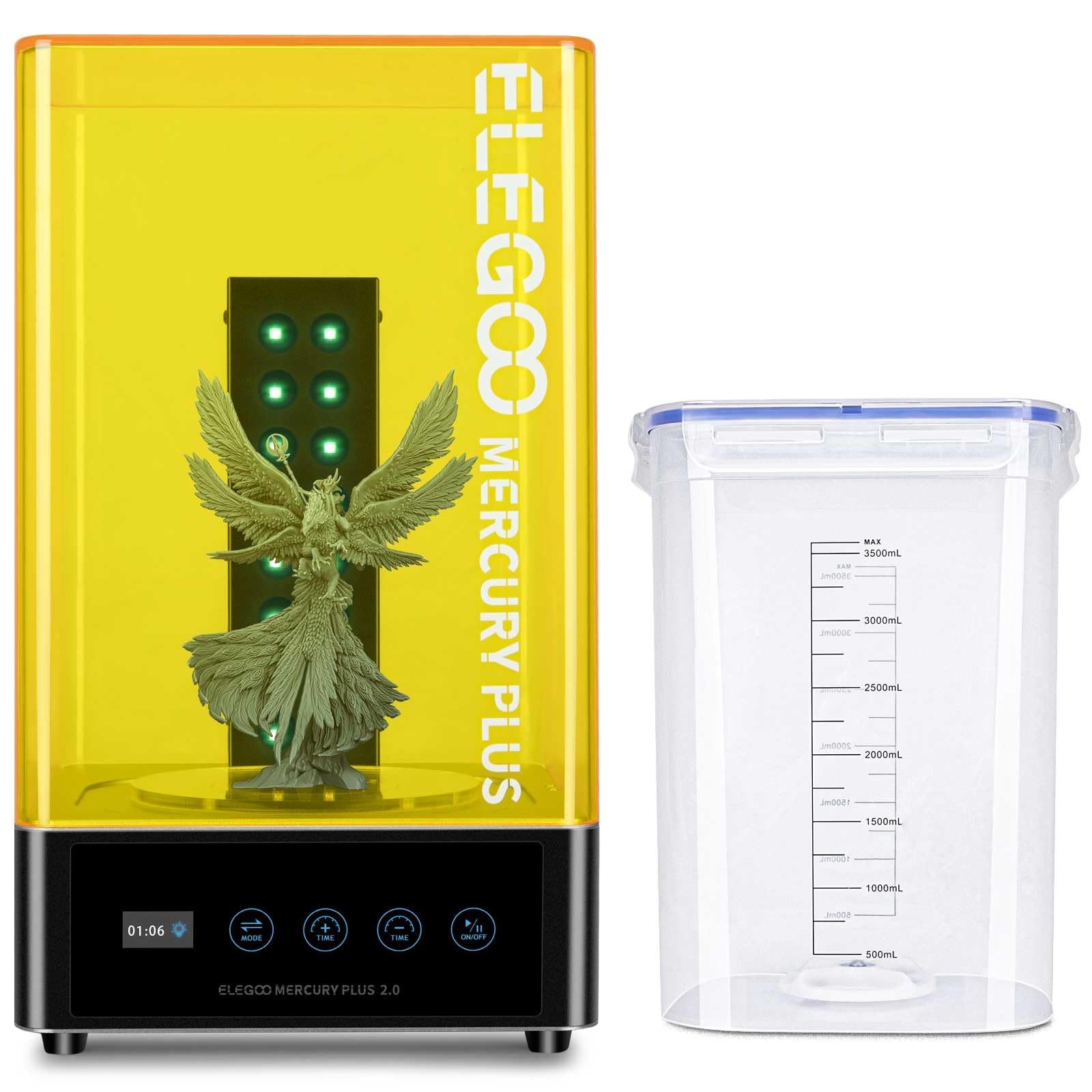 ELEGOO Mercury Plus V2 2-in-1 washing and curing machine for Mars Photon S, Photon Mono LCD, DLP, SLA 3D printed models. Resin UV curing box with rotary curing turntable and washing bucket.
