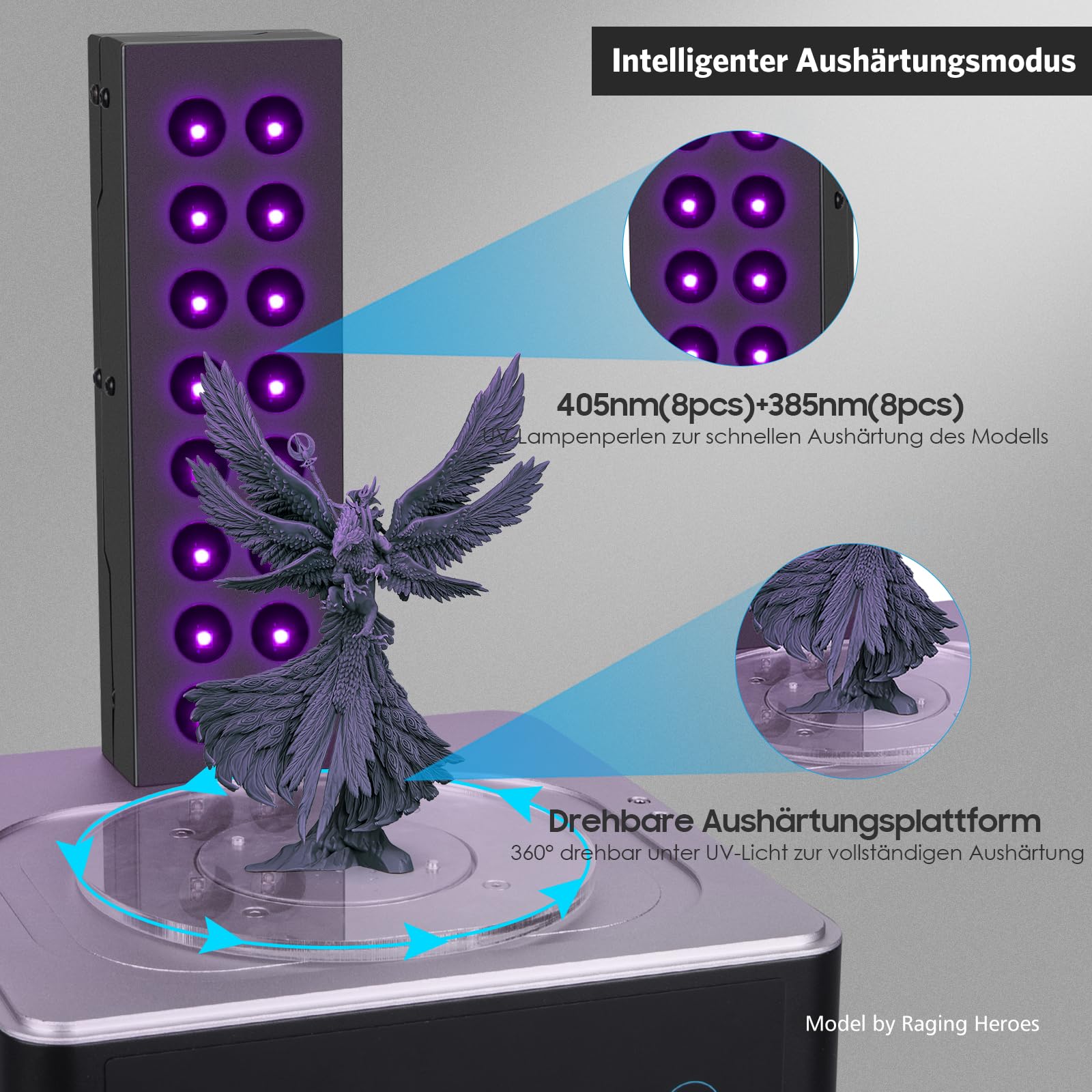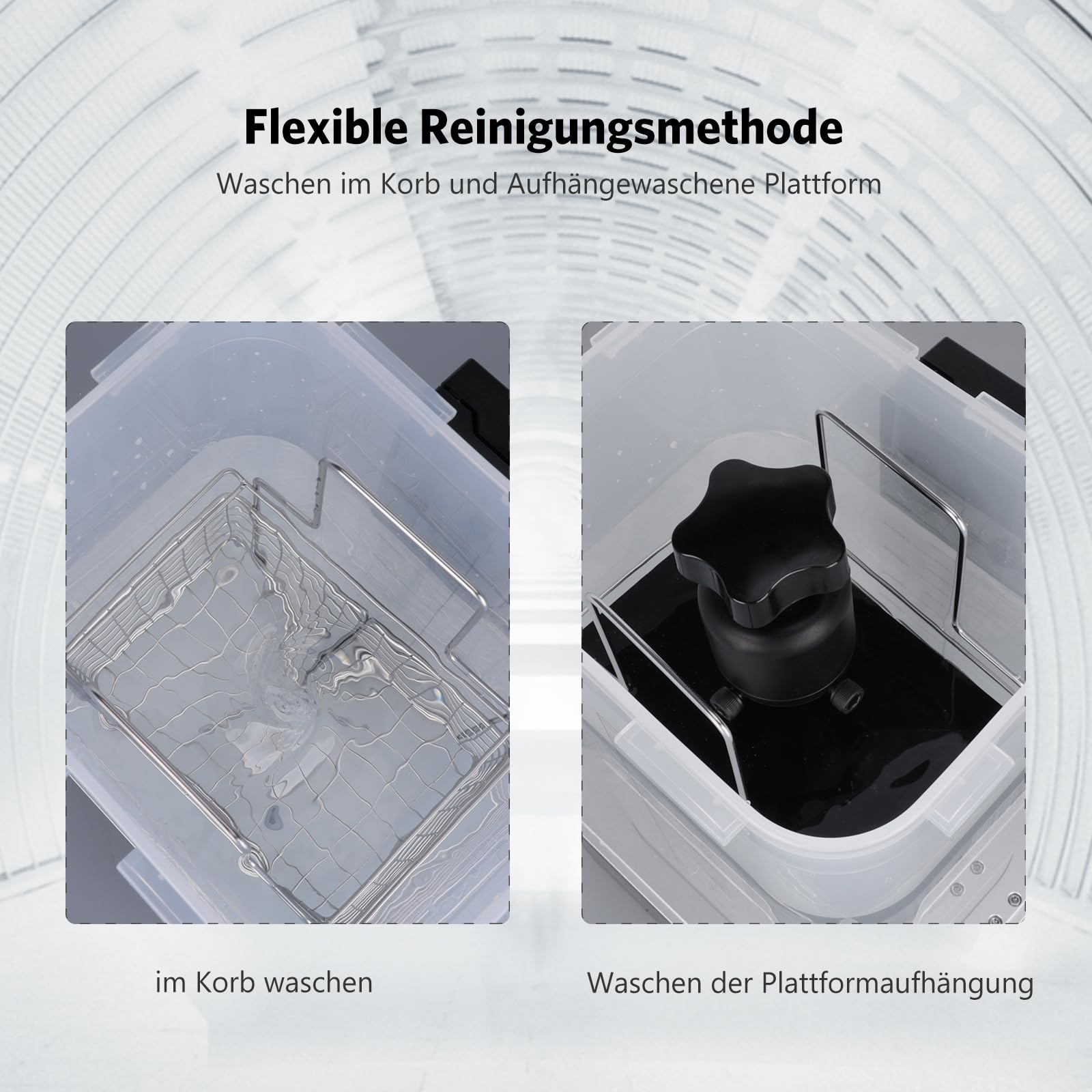 ["Improved protection function】Sealed washing in the 3D printer wash station to prevent alcohol evaporation during the cleaning process. The fanless curing mode makes the use quieter. The anti-UV cover can block 99.95% of ultraviolet rays to protect your eyes.","Intelligent curing and washing】The TFT screen on the front of the Wash and Cure Station directly displays the cleaning or curing time, and operation is simple and intuitive. With 16 built-in 405nm UV LEDs and a 360-degree rotating table, you can evenly cure the models.","Flexible washing mode】Models can be placed in a cleaning basket for separate cleaning or cleaned together with the build plate to minimize contact with uncured resin. The height of the platform holder can be adjusted to the liquid level in the bucket.","Ideal compatibility】Compatible with most LCD/DLP/SLA 3D printers such as ELEGOO Mars 3, Mars 3 Pro, Mars 4 DLP, other ELEGOO resin printers (without build plate), Photon, Photon S, etc., providing you with ideal support for washing and curing your 3D resin prints.","Special notes】The washing function is not suitable for 3D models printed with water-washable resin. These should be cleaned with running water."]