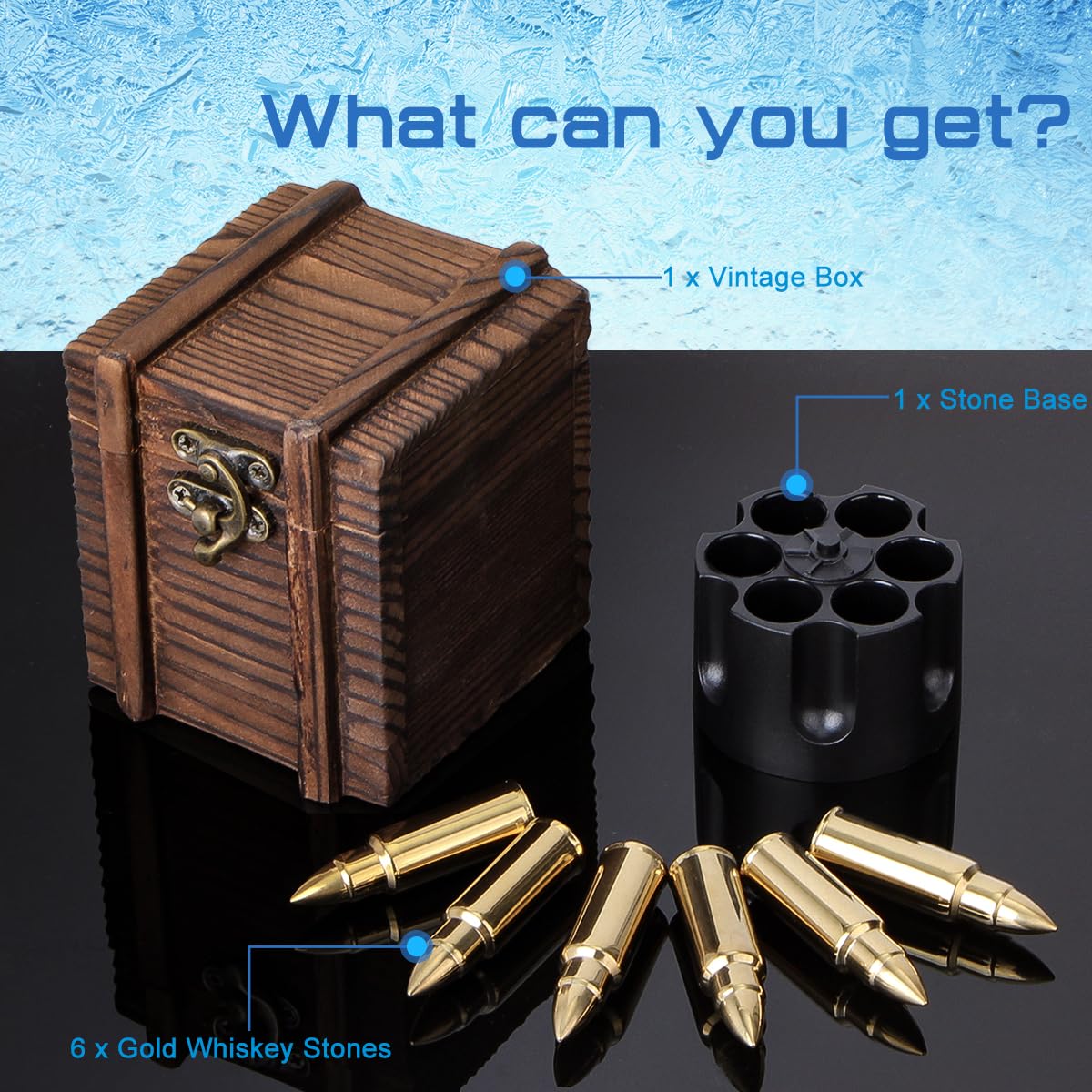 ["Keep drinks cool: Simply freeze and place the stainless steel stone in your drink. The whisky stone will chill your whisky in no time!", "No dilution of drinks: Preserves the original taste of whisky and allows for the best drinking experience.", "Food-grade material: The interior of our whisky stones is made of water and other food-grade elements. And the exterior is made of high-quality stainless steel. These whisky stones are designed to be reusable.", "Whisky stone gift set: Our whisky icon comes in a handmade retro box, beautiful wooden box packaging. Making it a perfect gift.", "Customer service: If you have any questions or issues regarding the Calcul whisky stones, please contact us for assistance."]