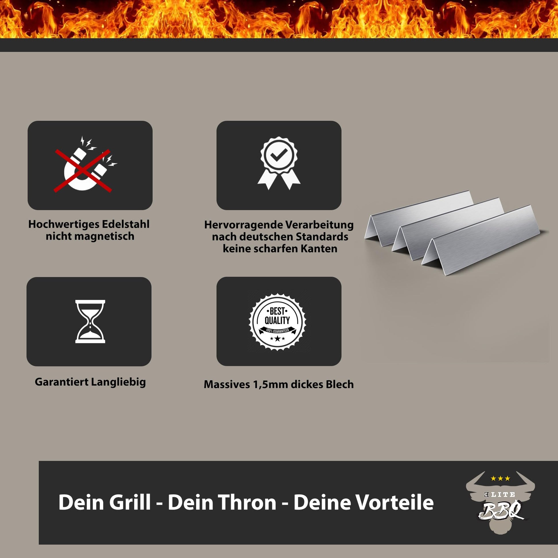 ["Weber Spirit E210/E220 Accessories - Our Elite BBQ Flavorizer Bars made of stainless steel, perfect for Weber Spirit 210/220 from 2013, are essential replacement parts that ensure functionality and durability.","Optimized heat distribution - As a high-quality heat reflector and Flavorizer Bar for the Weber Spirit, these Flavorizer Bars provide even heat distribution and prevent flare-ups.","Premium stainless steel construction - Made of 1.5mm thick stainless steel, these burner covers offer superior quality, corrosion resistance, and hygiene.","Perfect fit Weber grill replacement parts - Specifically designed for Weber Spirit 210 and Spirit E210 models, these Flavorizer Bars are an ideal choice for replacing and upgrading your grill.","Improved grilling performance - Experience enhanced grilling with our Flavorizer Bars, which act as Flavorizer Bars and intensify the flavor of your food."]